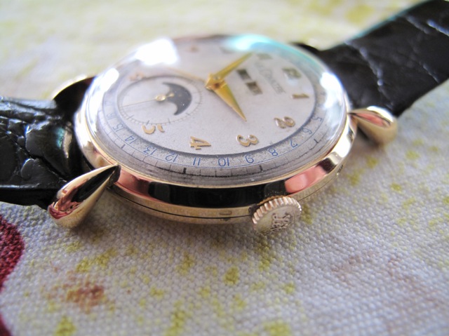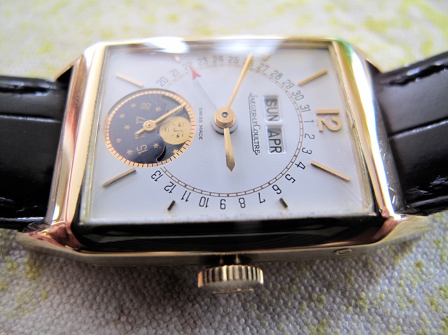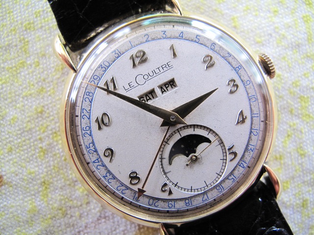 A couple of JLC Triple-Date Moonphases from my collection. The round one is a LeCoultre from 1949, powered by the shaped cal. 486A/W movement, manufactured in a run of 5,000 to commemorate the life of Jacques-David LeCoultre who died in 1948. 500 were sold in Europe (Jaeger-LeCoultre) in 14k gold shaped cases. The remainder were exported to the US (LeCoultre) and sold mainly in 10k gold-filled cases, both round and shaped. This one is in an 18k gold round case.