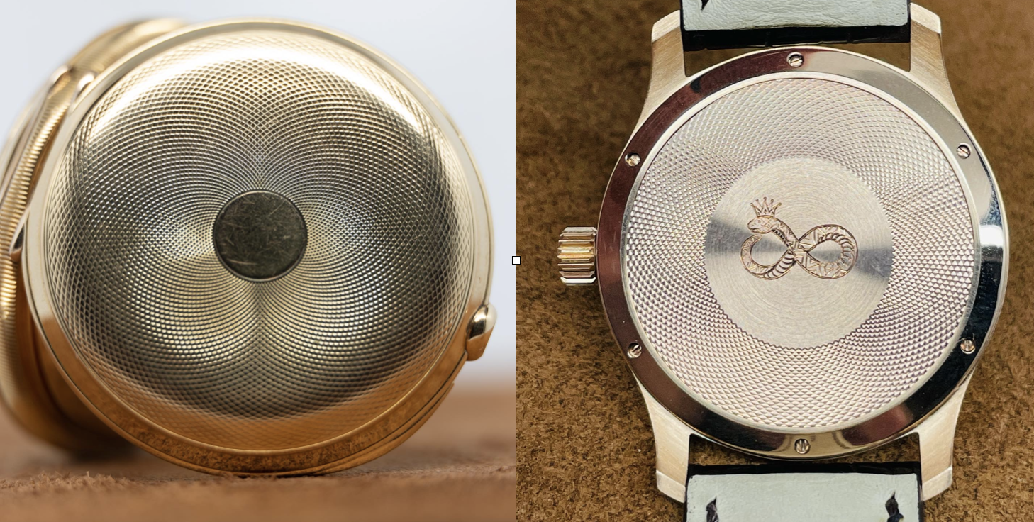 ยทPart of the joys of commissioning a watch from a talented independent maker is the ability to echo existing pieces in my collection. On the left is my Elgin pocket watch from 1879, with its engine turned caseback by Jeannot & Shiebler, New York, NY. On the right is my Josh Shapiro from 2020 engine turned by JN Shapiro and hand engraved by Artur Akmaev. Both are made in America.