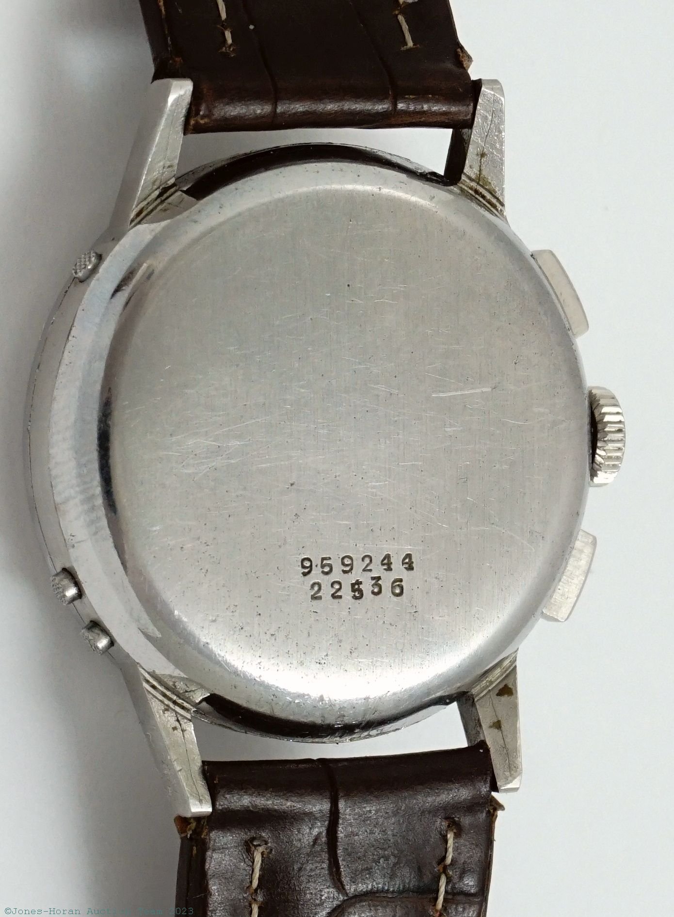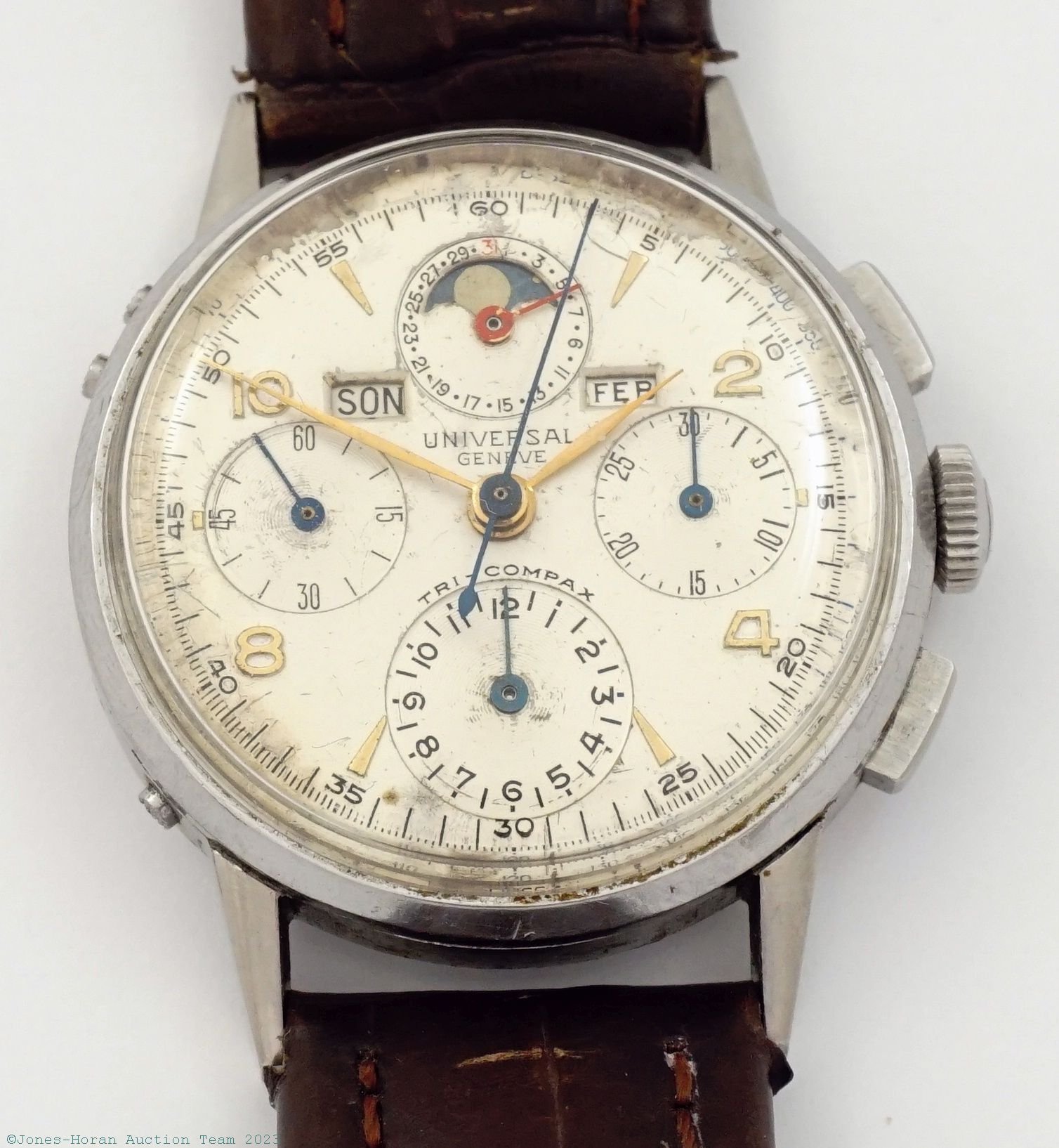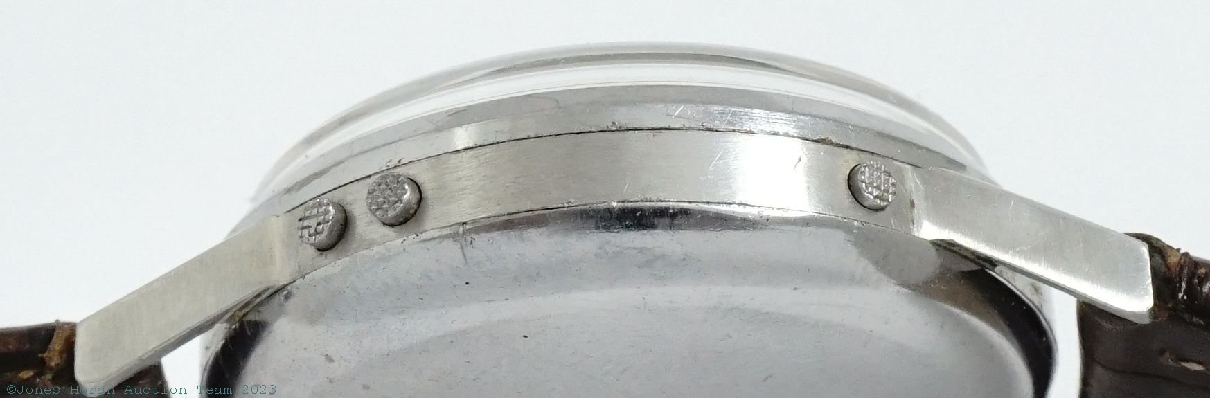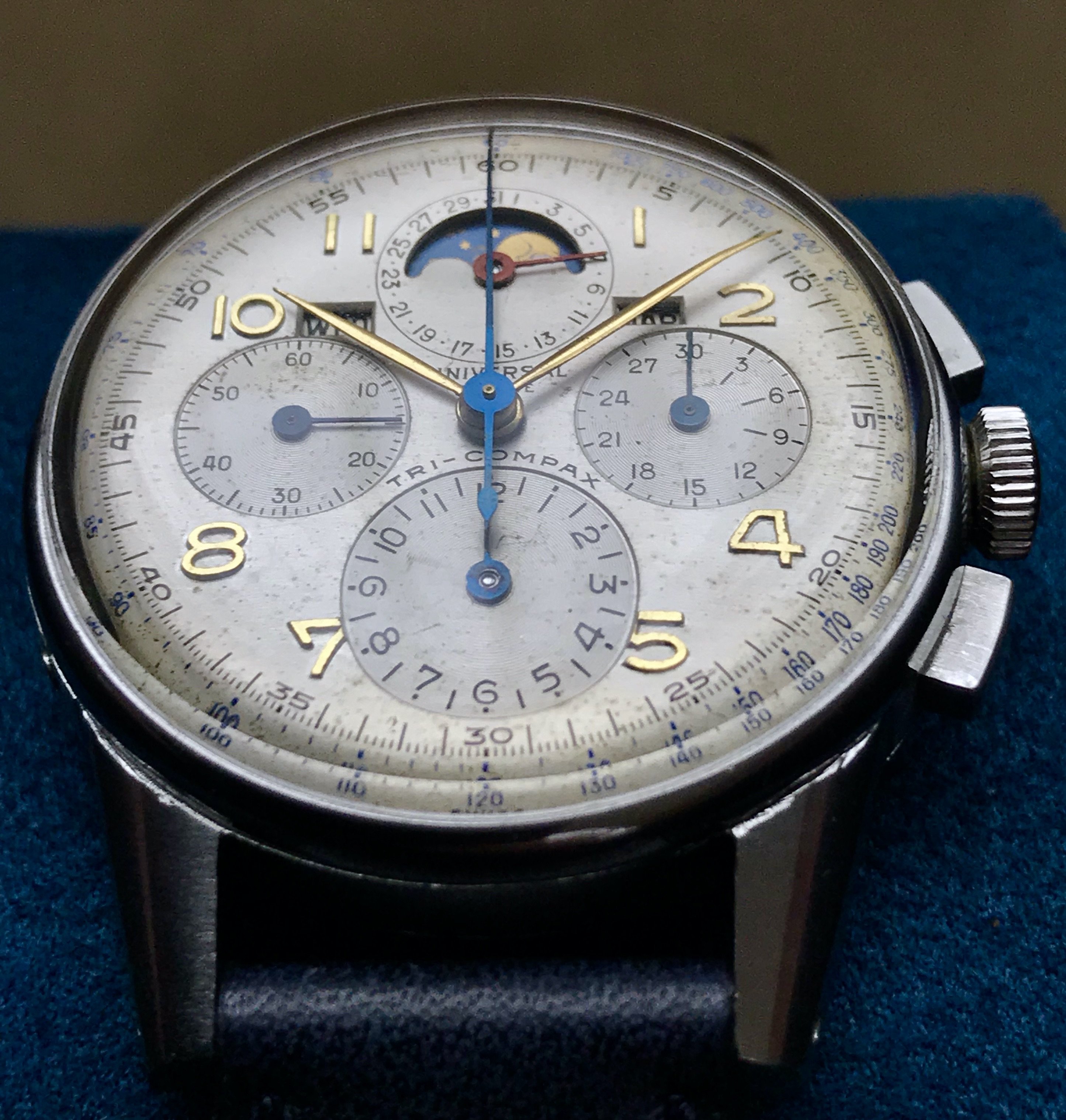 Obviously crown and possibly moon phase are replaced. Case seems odd, Spring bar sockets are female. I am new to Tricompax, and did not know about this forum or the recent book until a couple of weeks ago. I don’t plan on collecting them, just would like a couple of nice original ones to wear from time to time. Hope I didn’t make too big a mistake. Especially since the gold case one came up in the very next auction. Any information would be much appreciated.