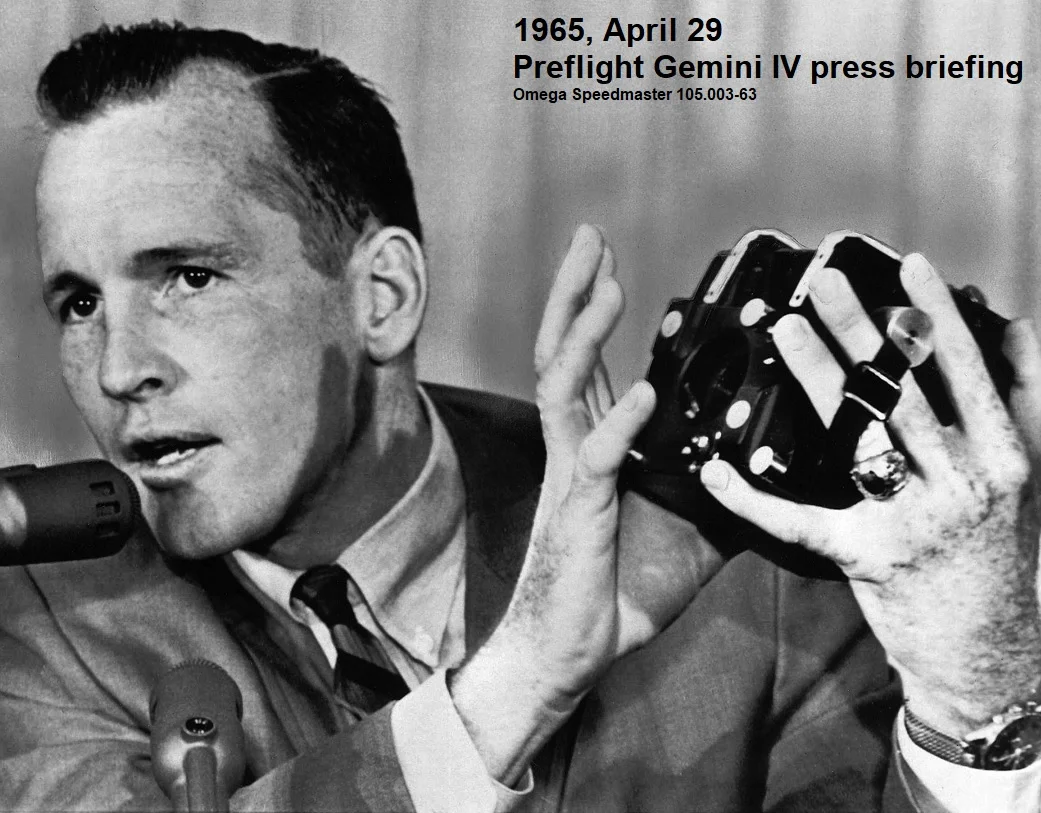 So on April 23, 1965 NASA received a first batch of 17 Omega Speedmaster 105.003-63 chronographs and a week later we saw some of these on the wrists of James McDivitt and Ed White during the Gemini IV preflight press meeting in Washington D.C.