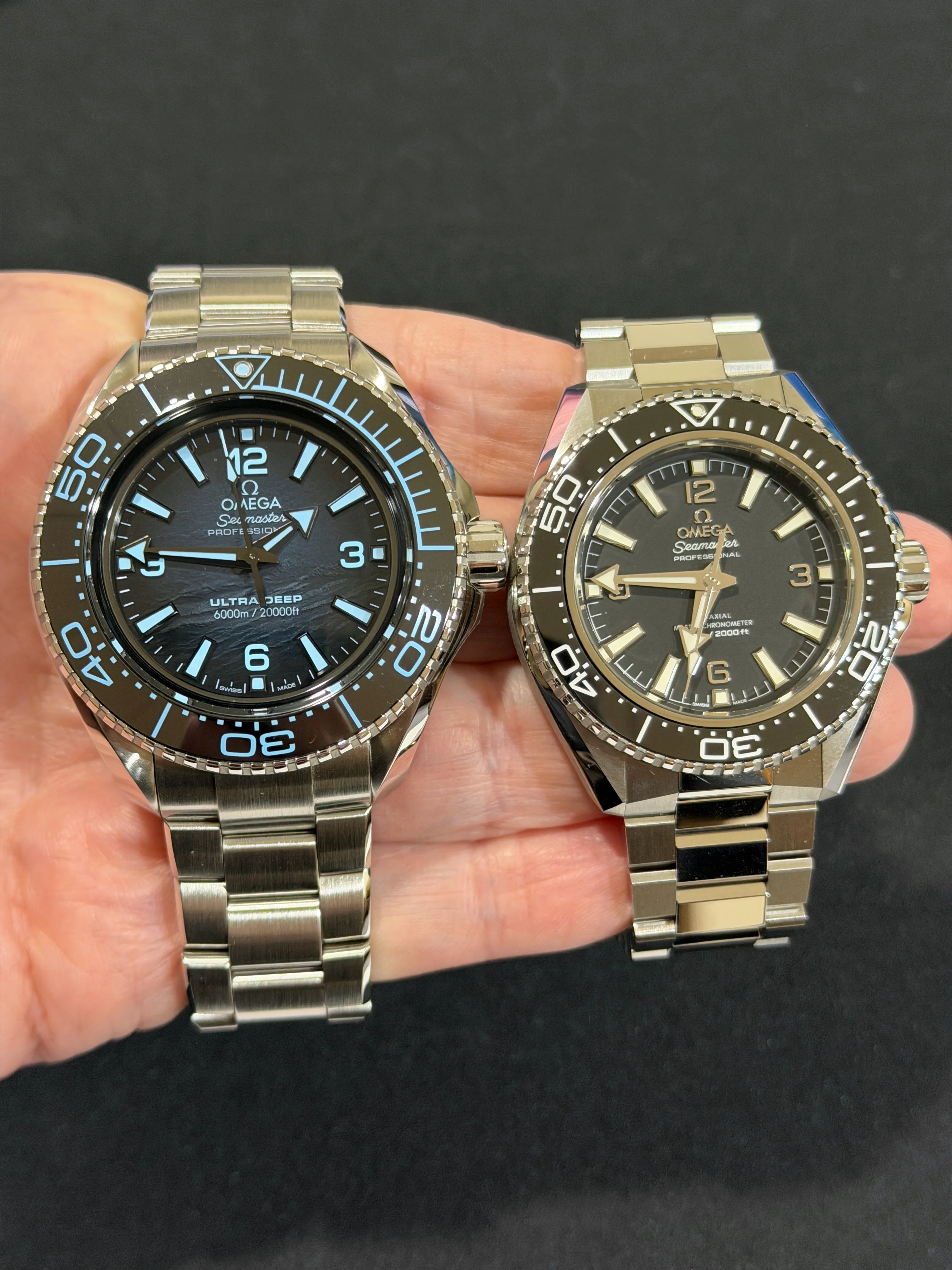 As pointed out my many people, one of the biggest changes is the thickness of the watch. They made it thinner by over two millimeters. Here is a thickness comparison between the Ultra Deep, the previous generation Planet Ocean and the new one.