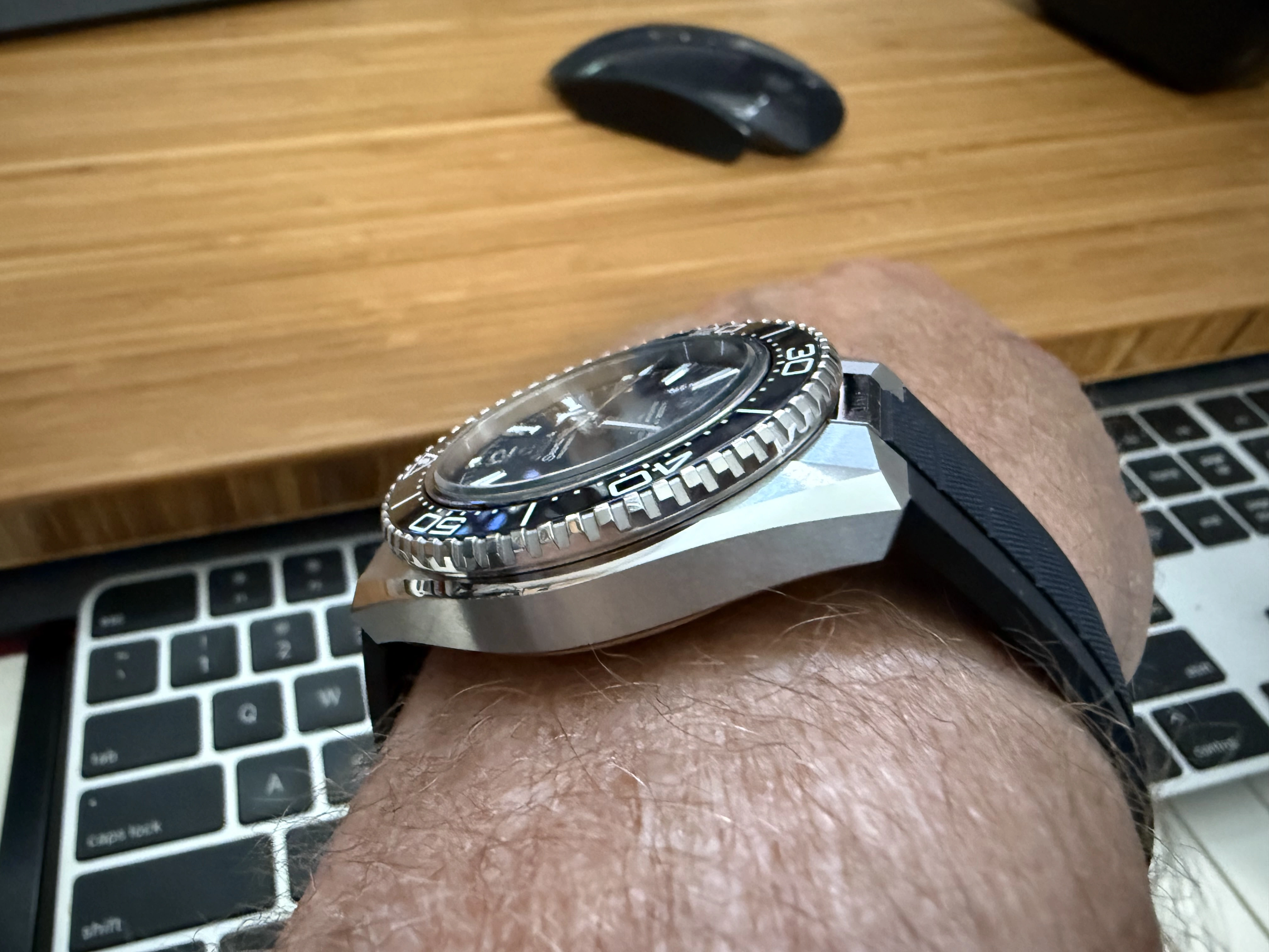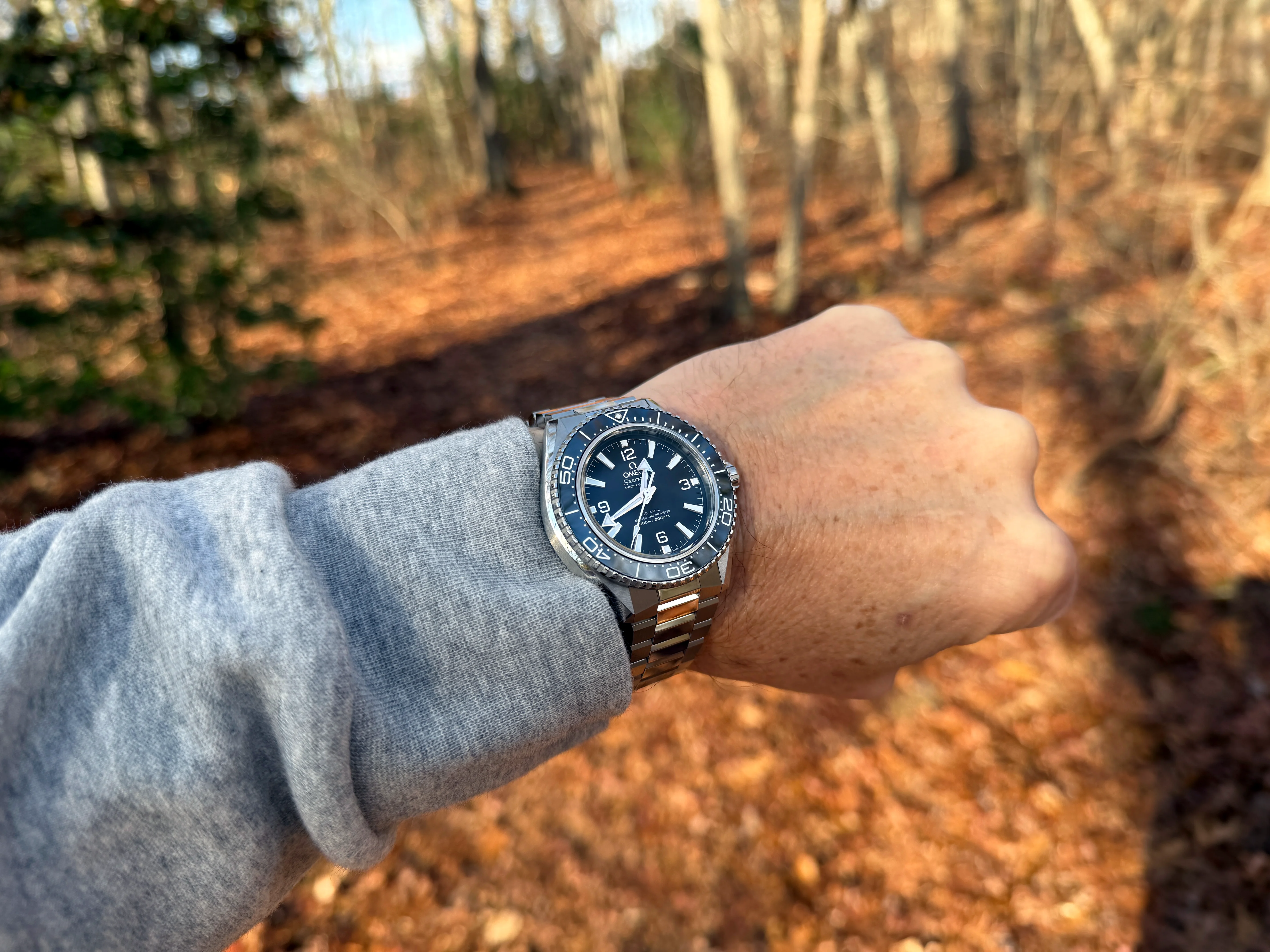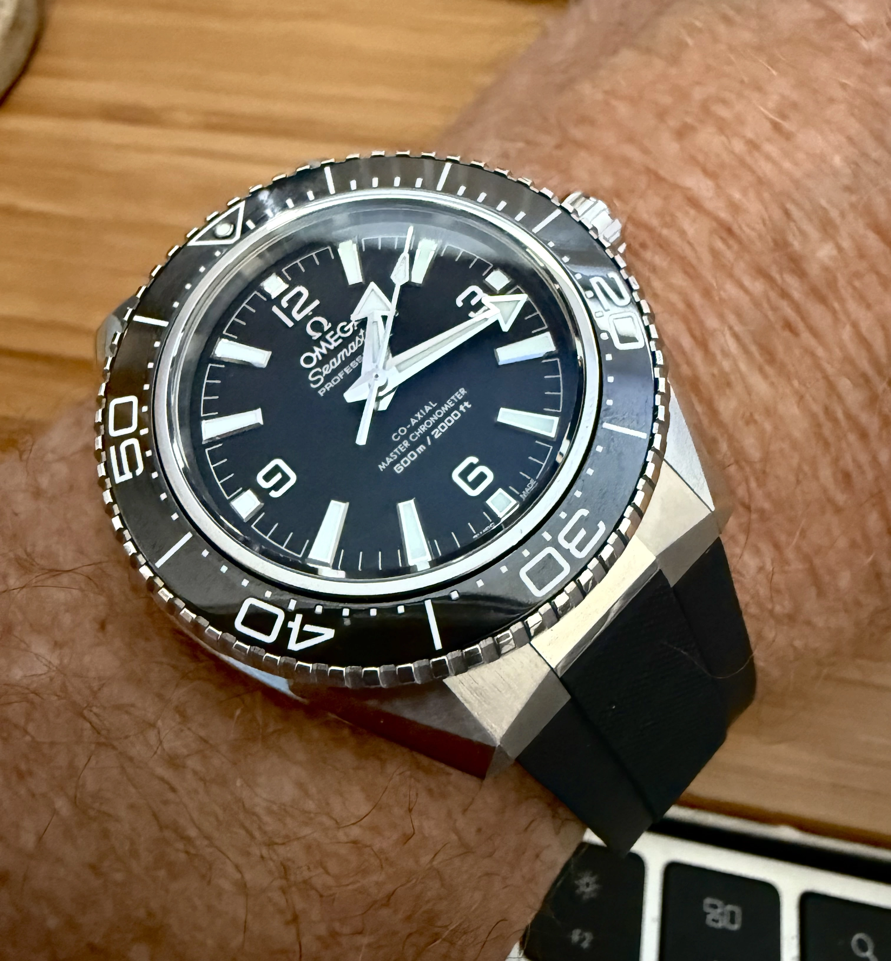·It can look that way because it's a matte black, it has a tendency to absorb the light, rather than reflect it. The sub has a very glossy dial and reflects the light However, the Planet Ocean will only look like that when it is hit with very bright, direct light. All other times it looks dark black. I like the matte black ability to have different looks depending on the lighting. As you can see in this pic, the dial looks dark black, even though its in the afternoon and no clouds in the sky. When I get a chance I will take a few pics outside, side by side, with the sub.