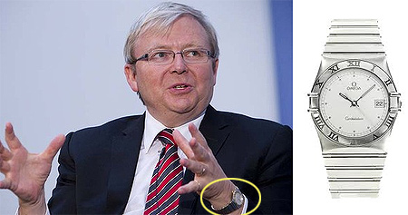 ··Ash @ ΩFAustralians probably recognise Kev immediately, he was the Prime Minister of Australia for 3 years until being shafted by his deputy and replaced in 2010. Since then Kevin's been servicing as the foreign minister and actively trying to screw the woman that usurped him leading to now, with everyone expecting him to challenge to take his old job back. Without going into any details of the politics, a video was leaked with Kev expressing his displeasure rather bluntly while recording a video... the watch on his wrist? Omega Constellation