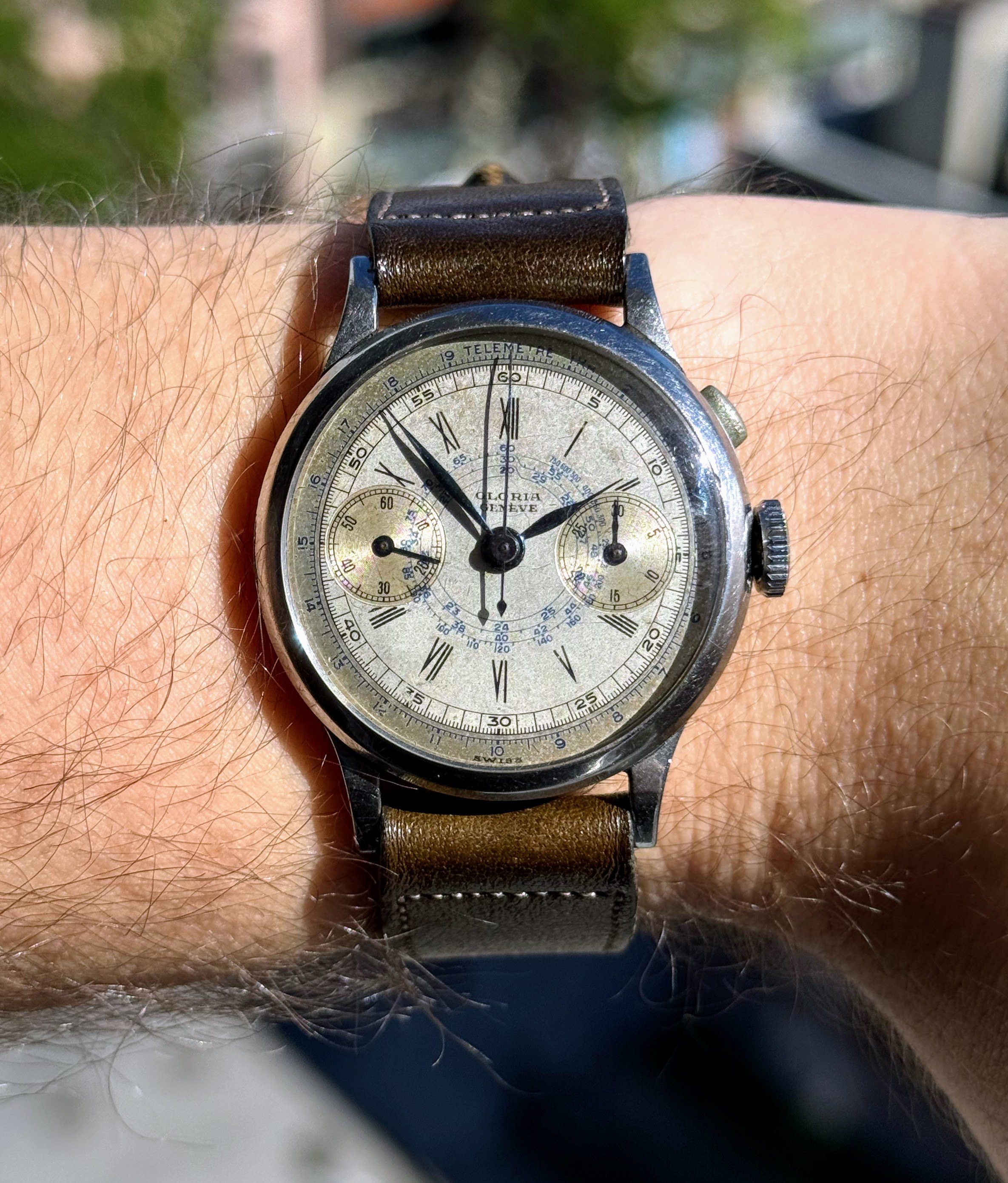 ·Hey guys! I received my new find today and I wanted to share it with the forum. It's a monopusher chronograph produced in the late 1930s with a (rare?) Landeron 13 movement. The brand is "GLORIA GENEVE" and the only information I found online about it is the following: