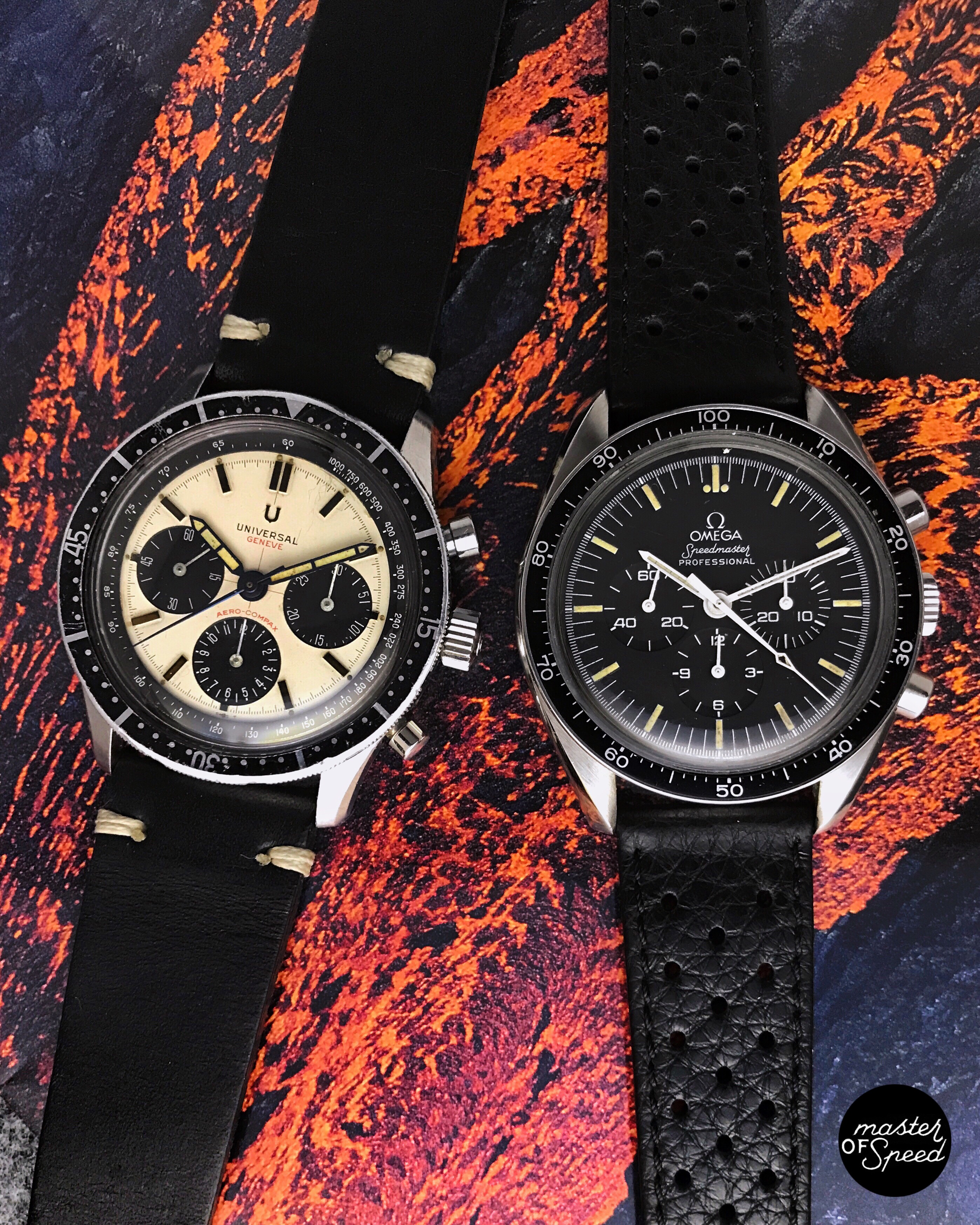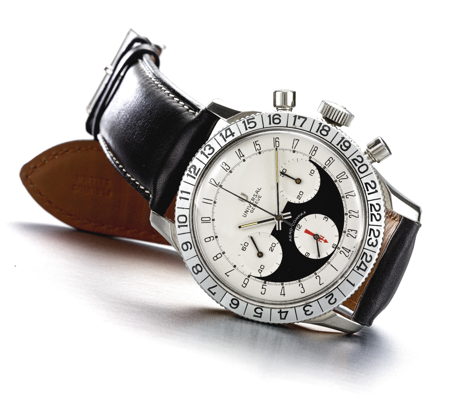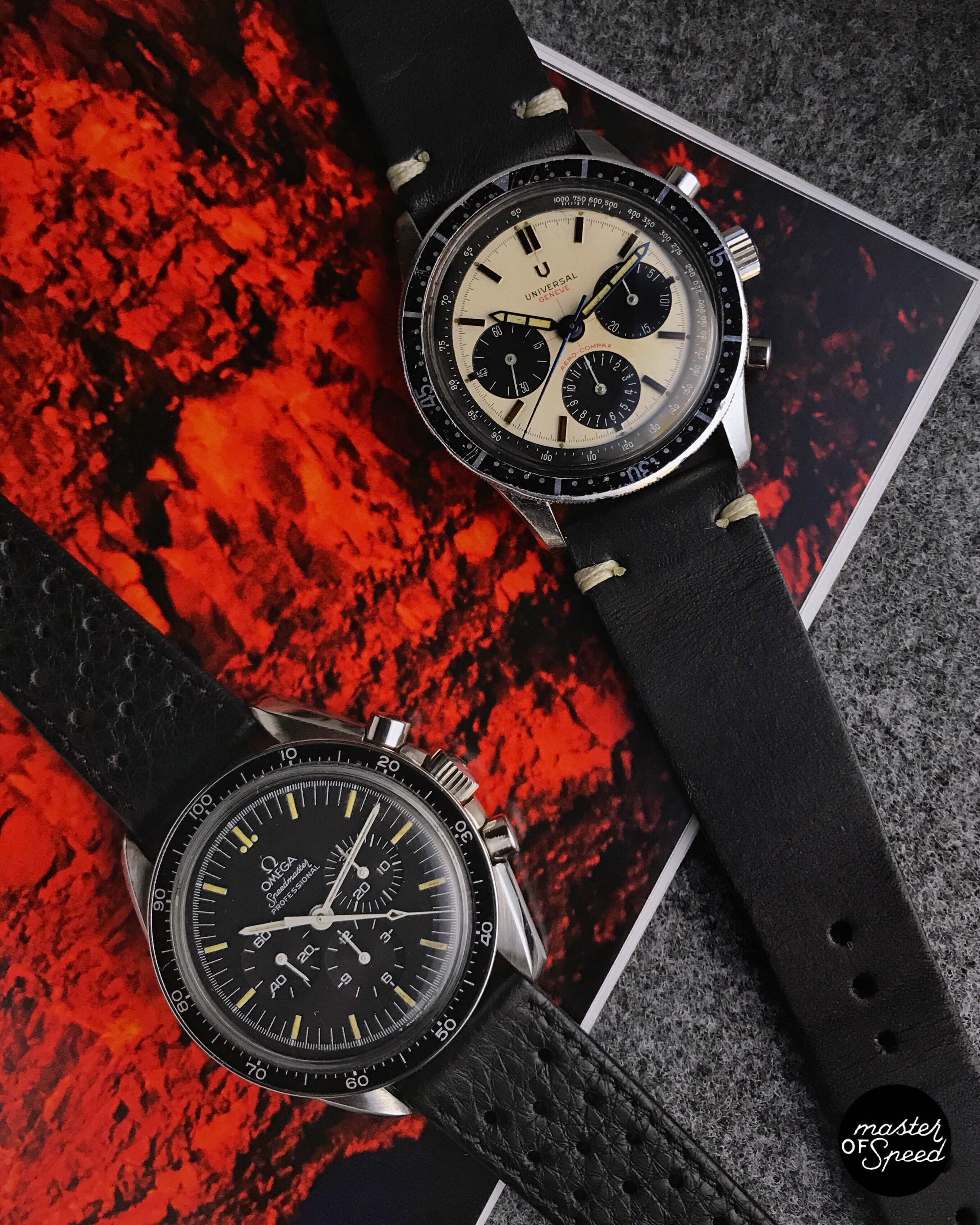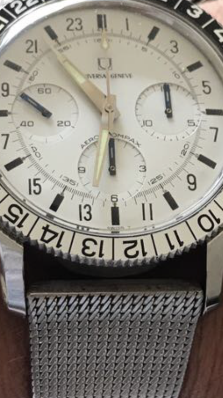 Both Ref 890100/01 and 890101/01 have 24h dials and have a 15min counter that actually ticks every 30 seconds (Breitling will later have the same thing on one iteration of their AVI chronographs but I believe UG was the very first to use such a modification) and same case, but they are otherwise different in terms of the bezel (black and silver for day and night in Ref 890100/01, all silver in Ref 890101/01) and also in terms of the fact that in Ref 890100/01 the hours are OUTSIDE compared to the minutes (only watch I have ever known with such a characteristic) whereas in Ref 890101/01 the hours are more traditionally inside the minute track: this fact is reinforced by the hands, as in Ref 890100/01 the hour hand is LONGER than the minute hand (and they are both silver, more on this later), whereas in Ref 890101/01 the hour and minute hands go back to be "standard" lengths and they are black.