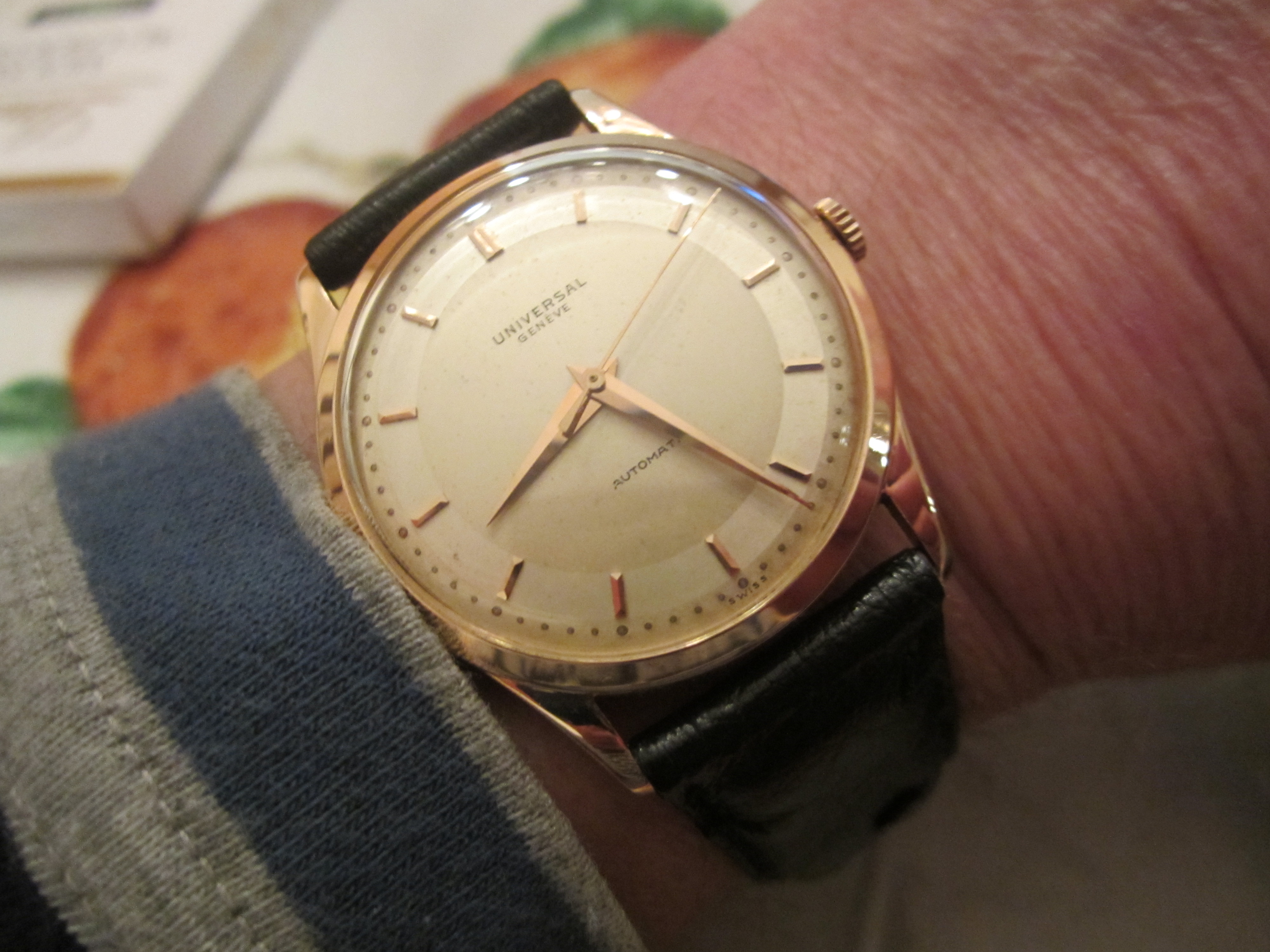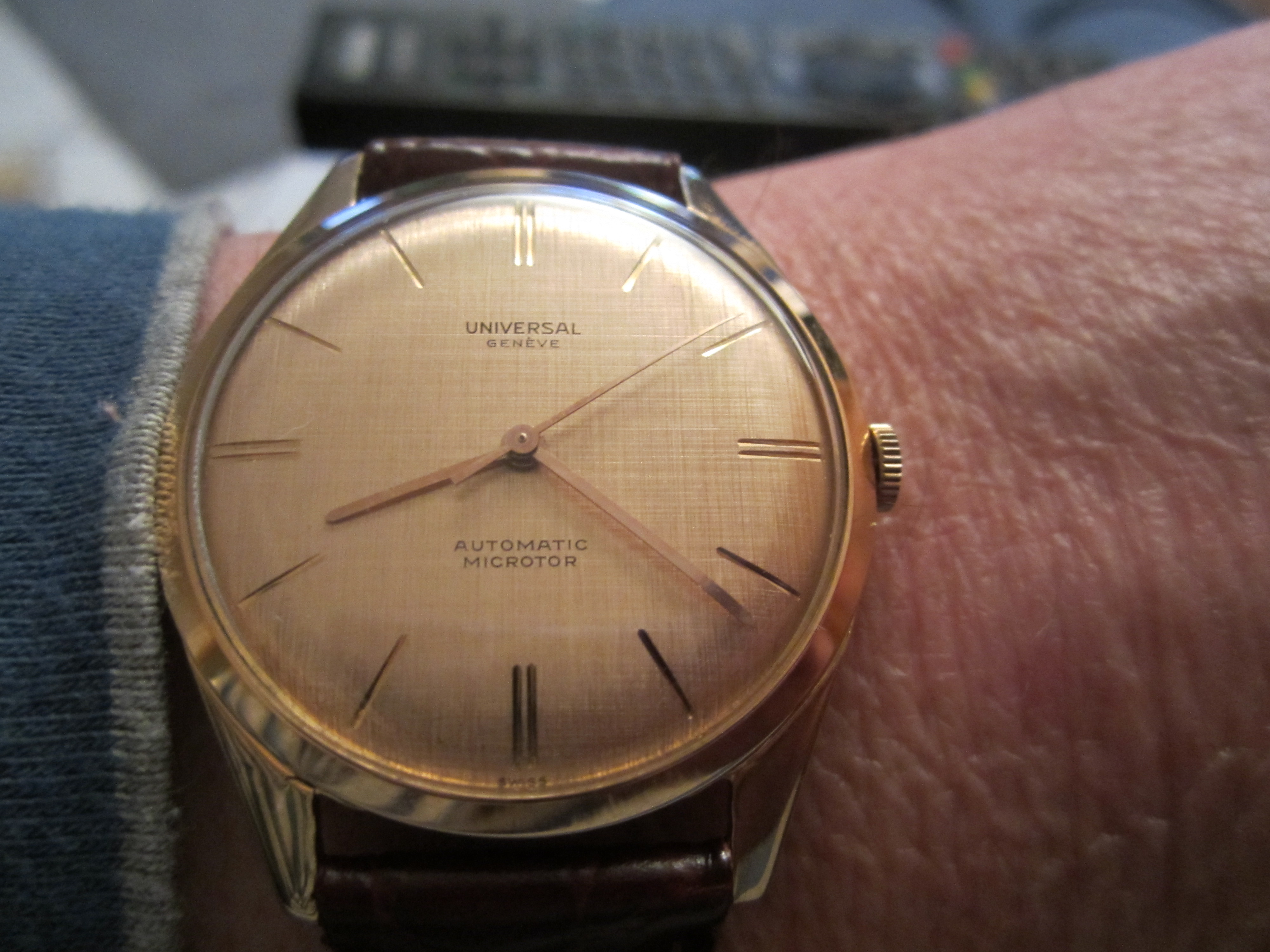 Posts 1,113 Likes 7,821 Alpenschneerot 路Sep 3, 2013 Latest Arrival: Universal Geneve Automatic Microtor, Cal.215, 18 Karat Rosegold,copper coloured dial....馃榿 Pics of movement and inner caseback will follow... Reiner