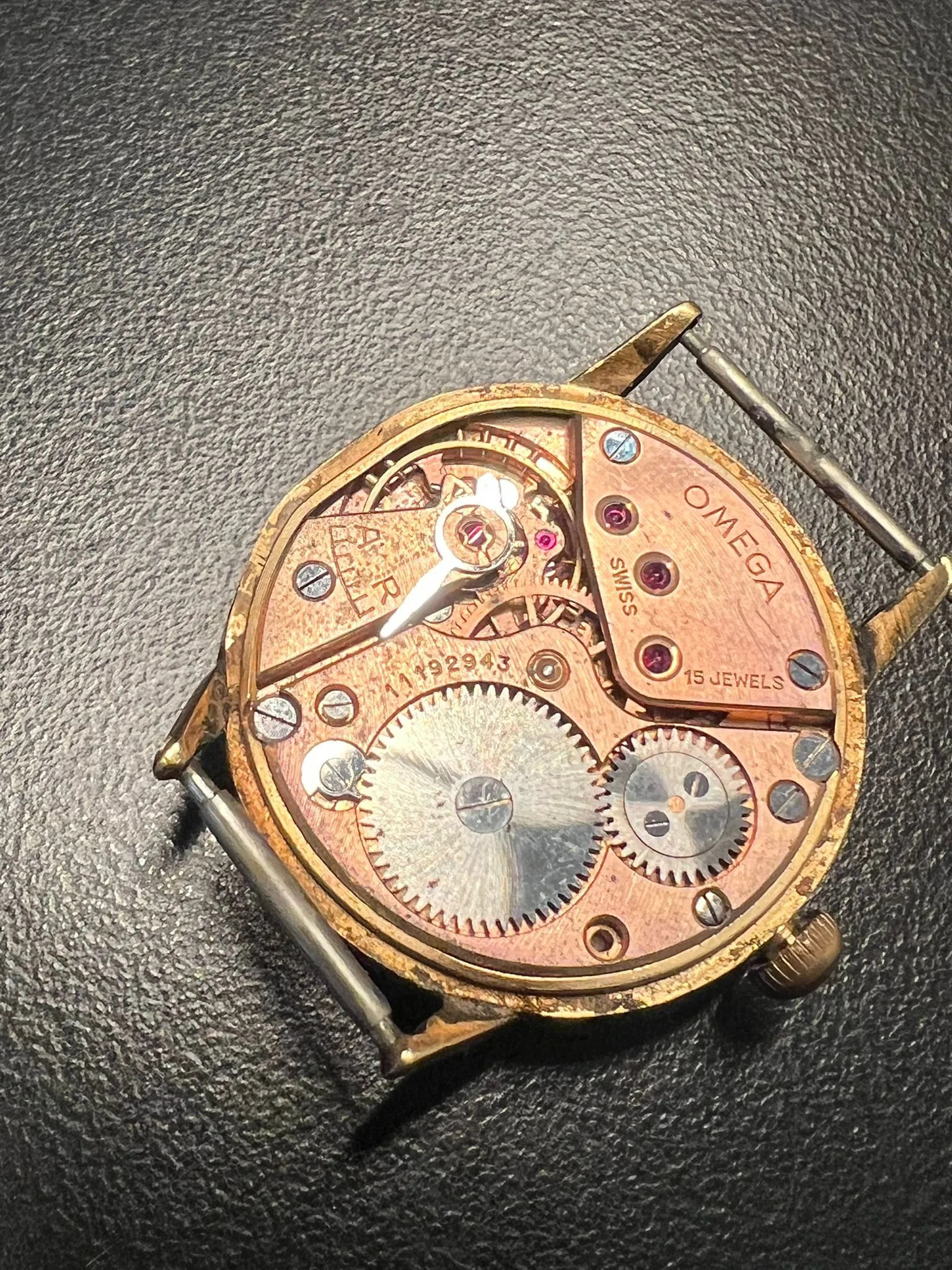 Last year, the watch came into my possession when my grandfather gave it to me. Over the years, the watch had stopped working, and it no longer kept time. There’s a dent on the side of the gold case, and the various elements have done their job for 82 years. As a result, it’s not immediately clear to a layperson (like me) that it’s an Omega watch.