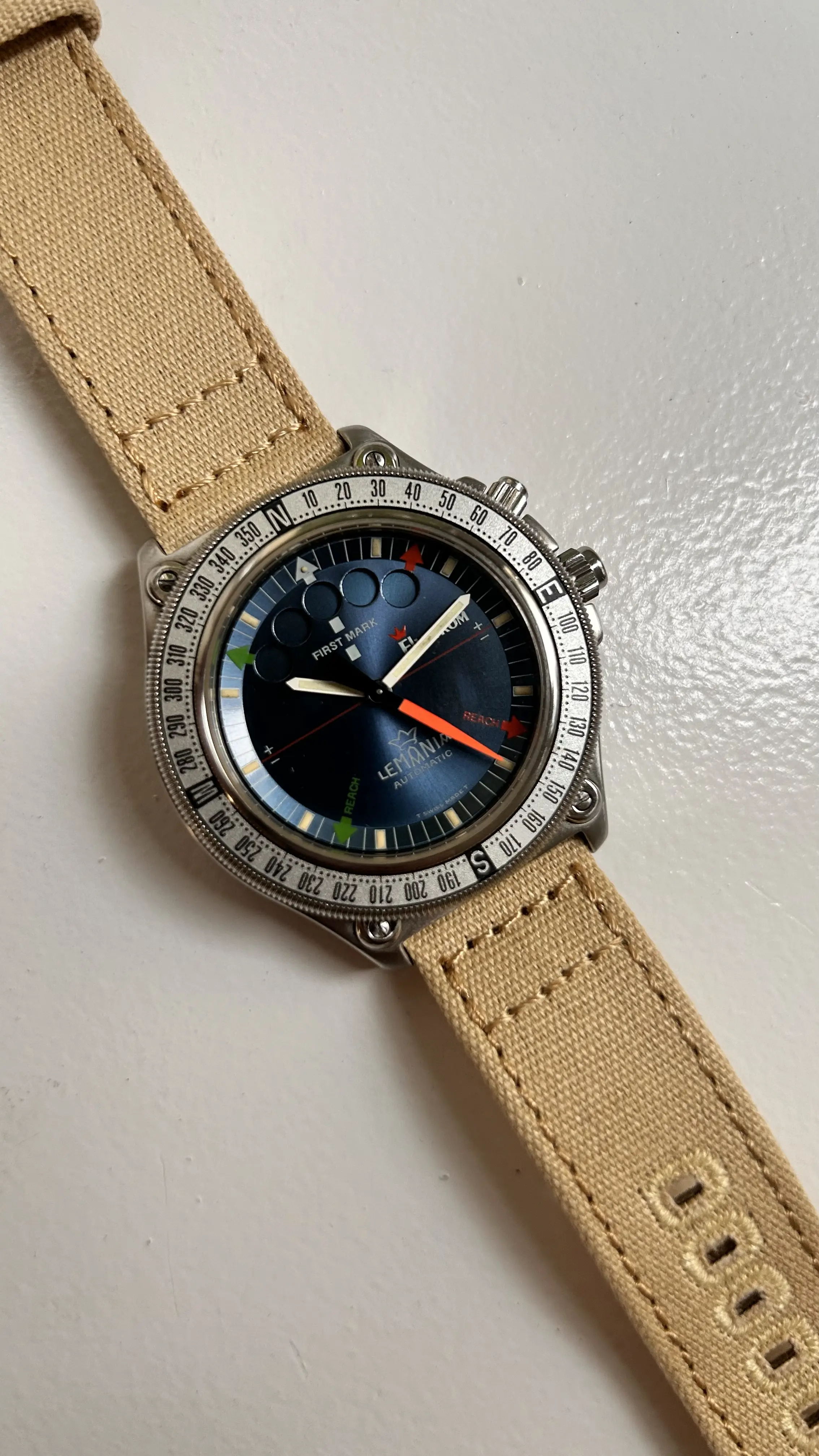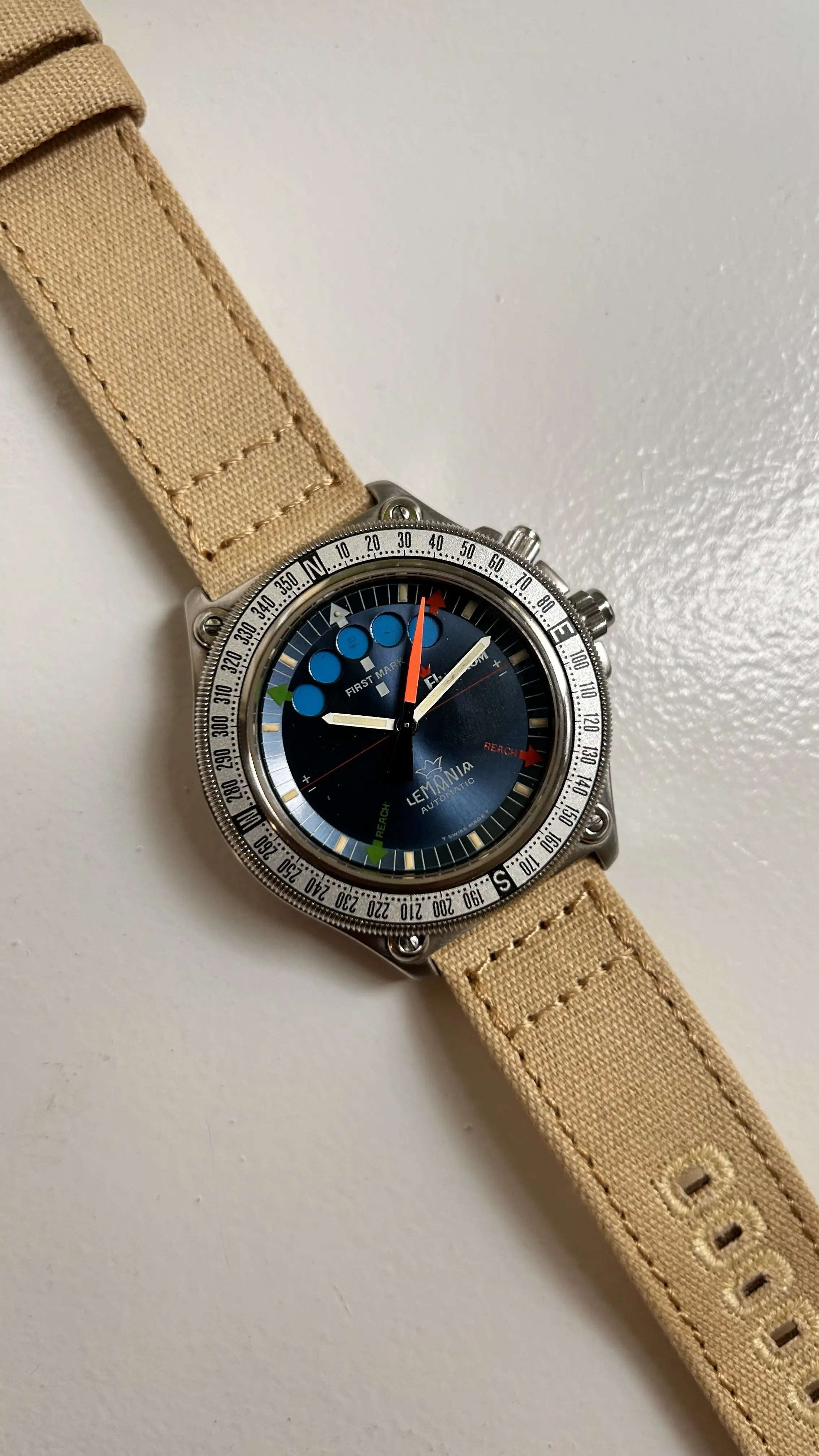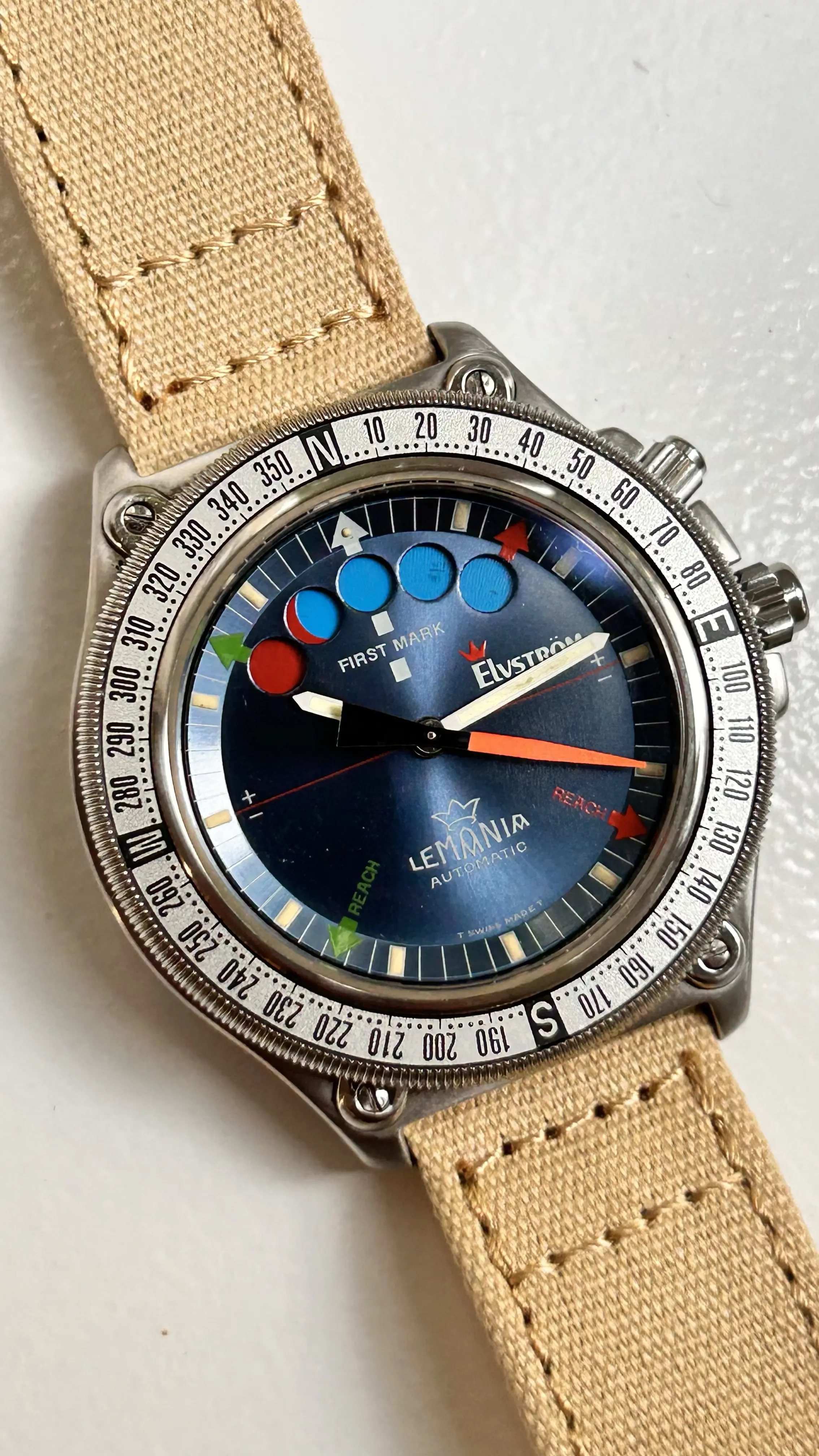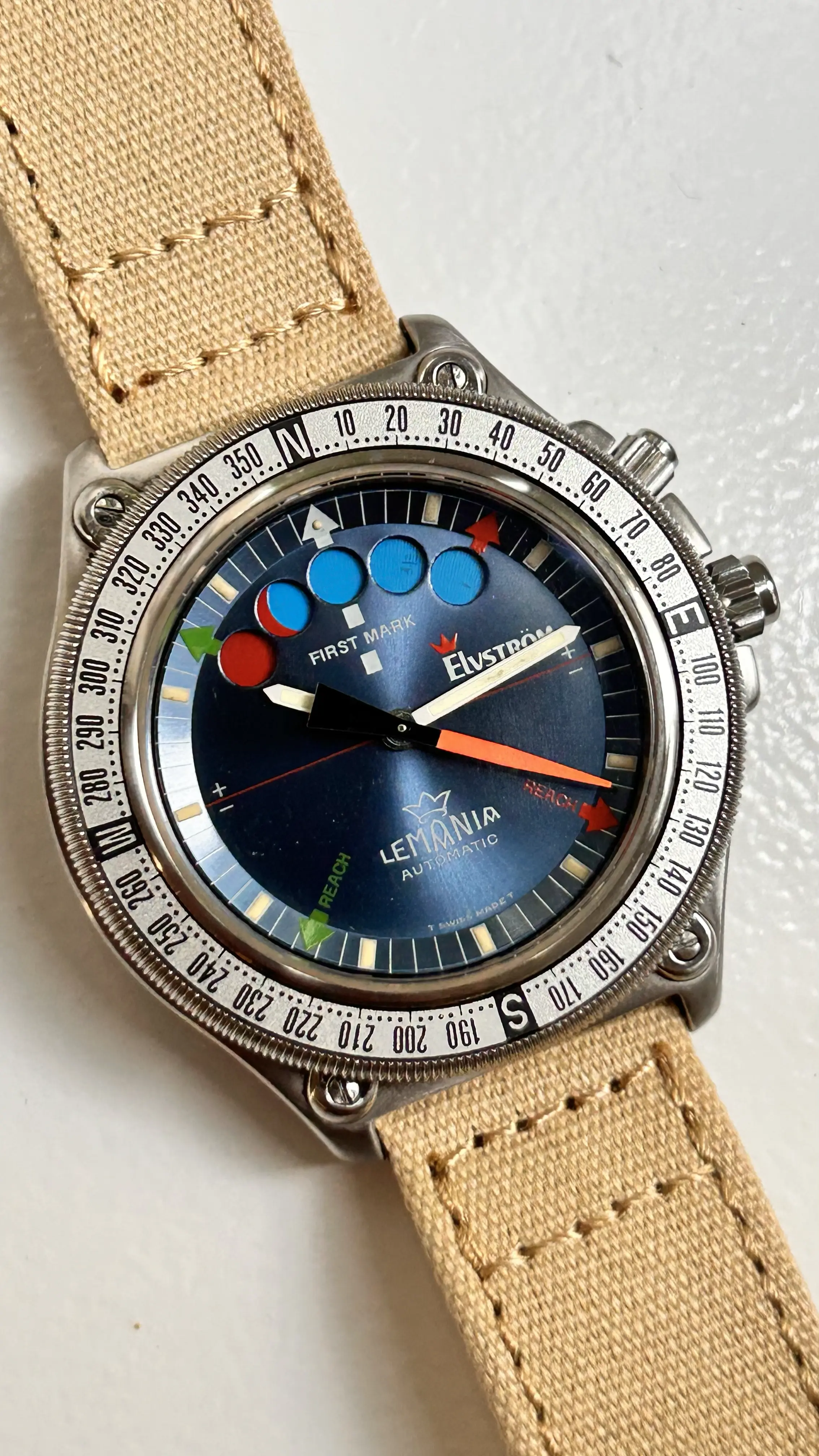 ·For sale is my stainless steel Lemania Elvström Regatta Timer with blue dial on a Canvas-strap.