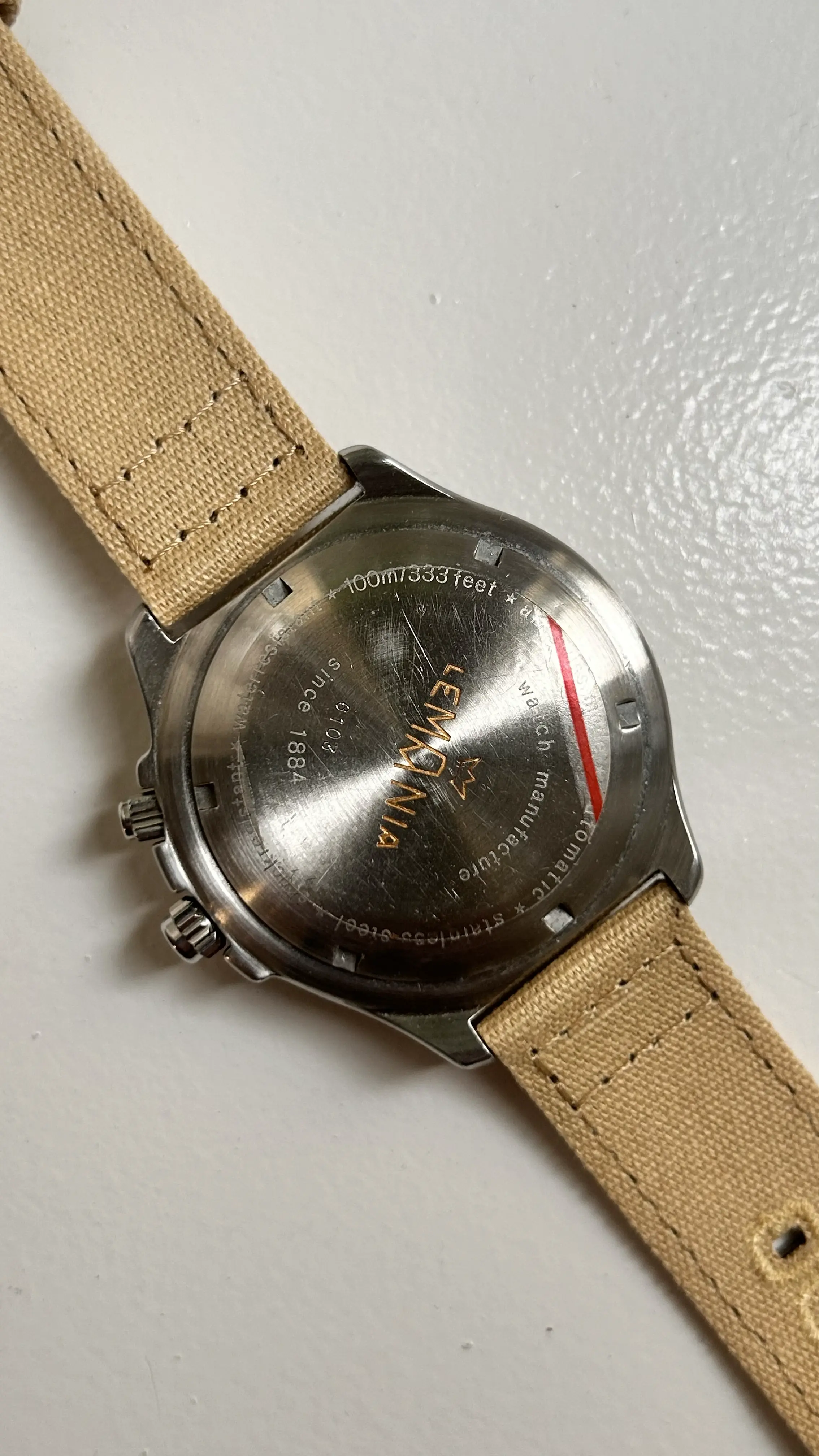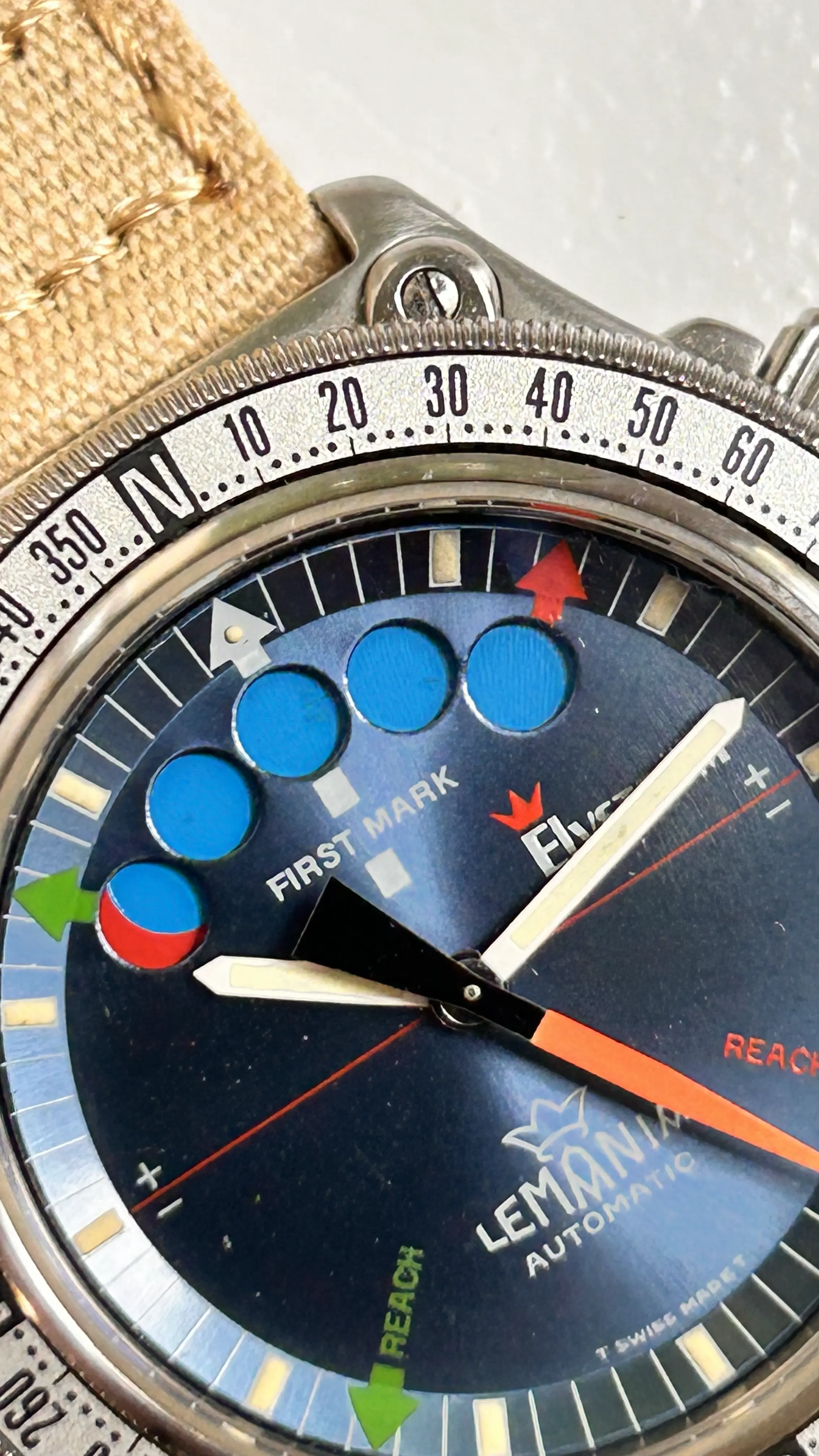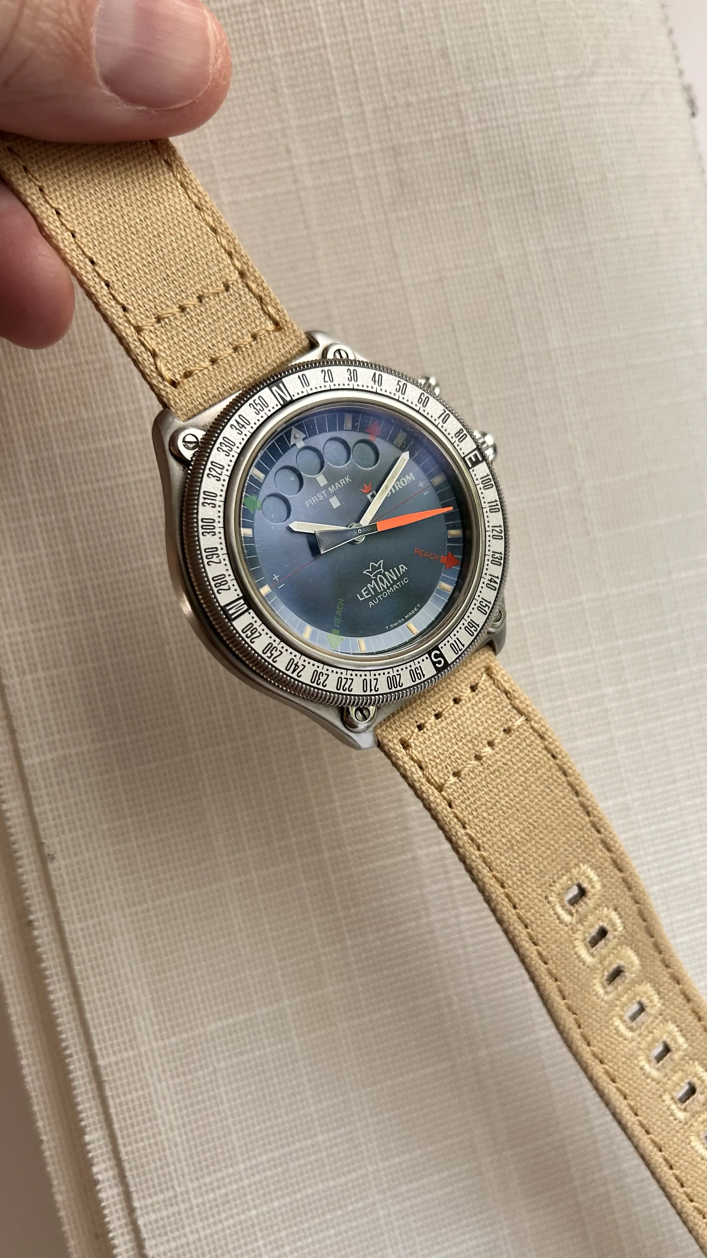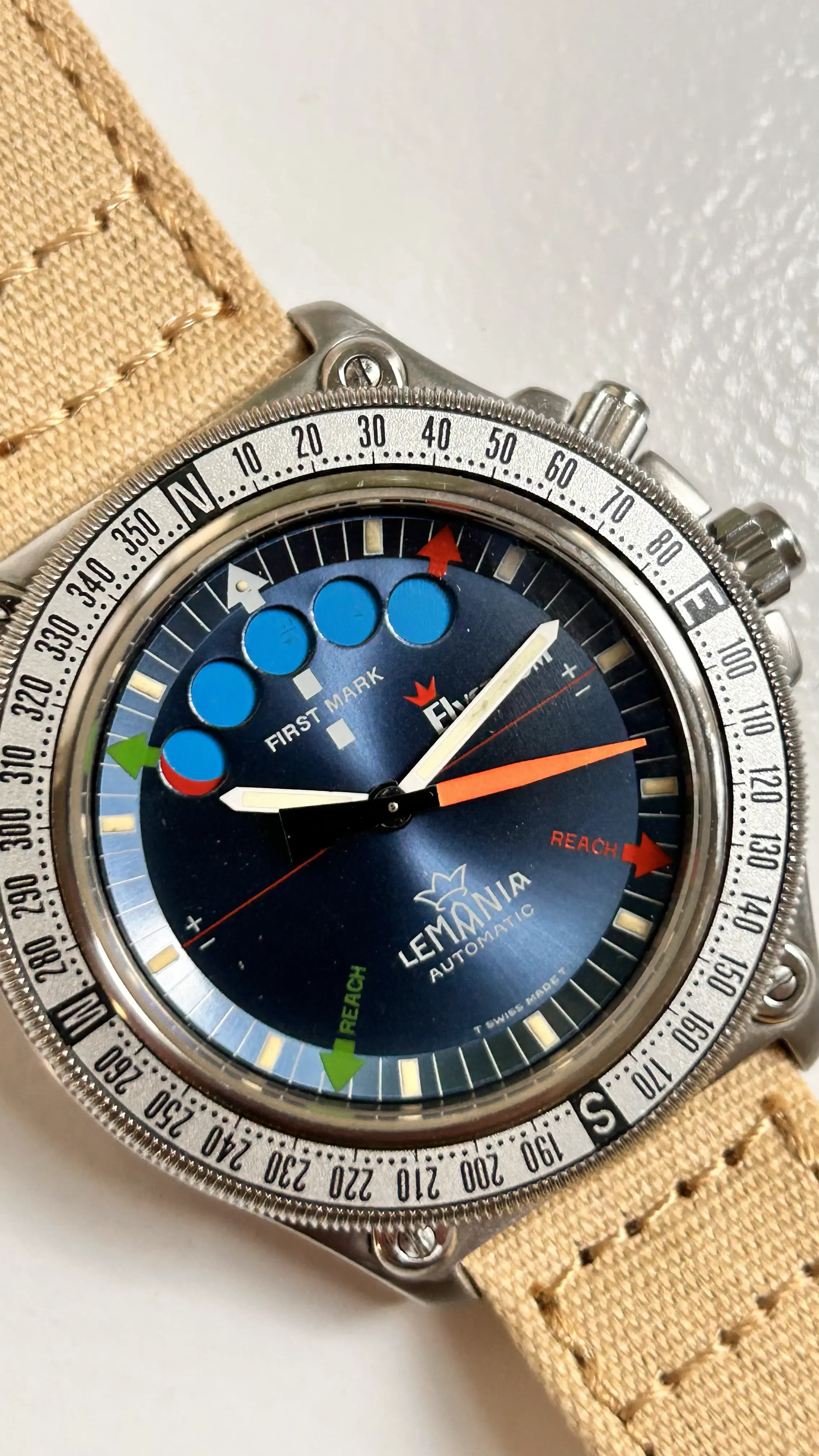 ·For sale is my stainless steel Lemania Elvström Regatta Timer with blue dial on a Canvas-strap.