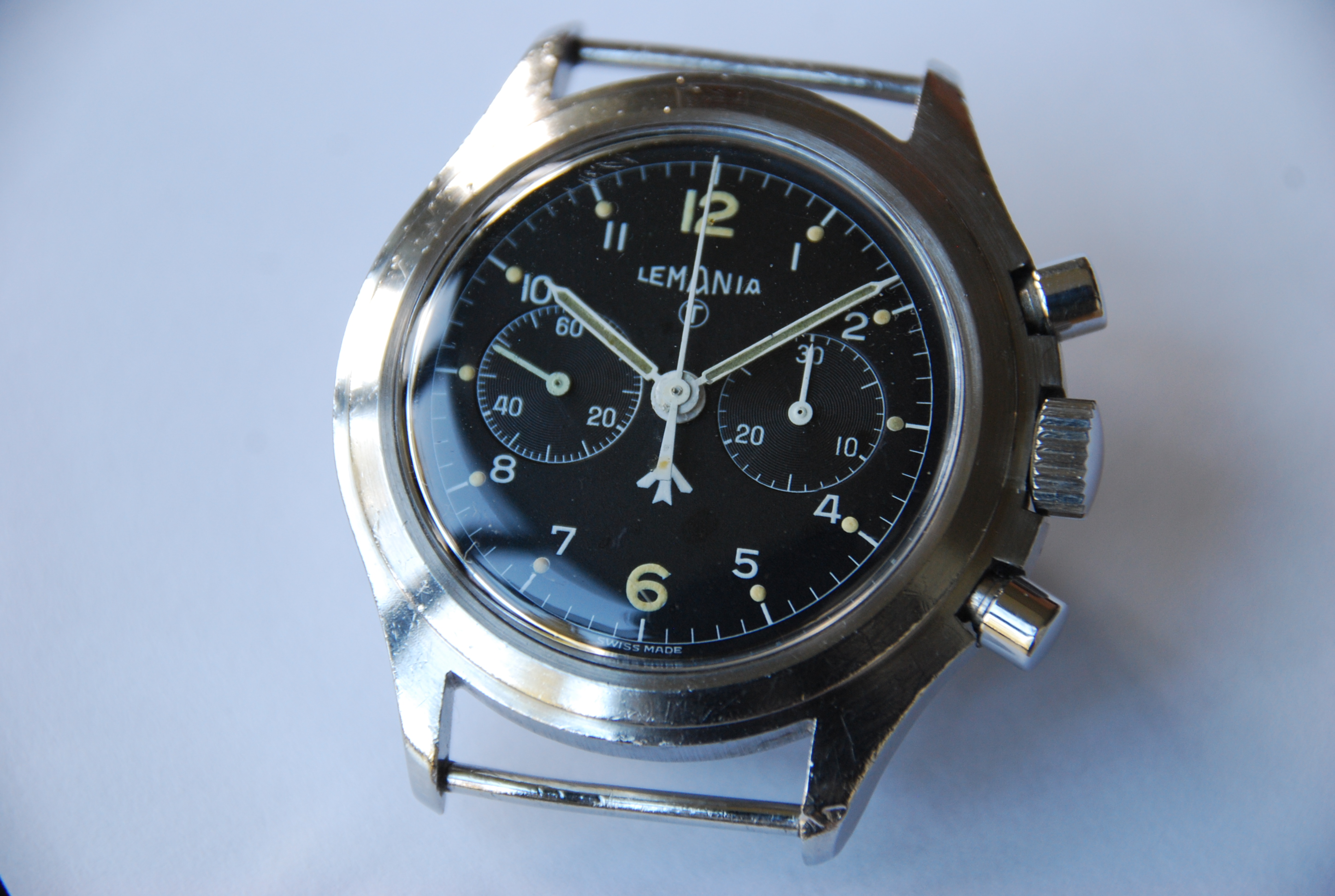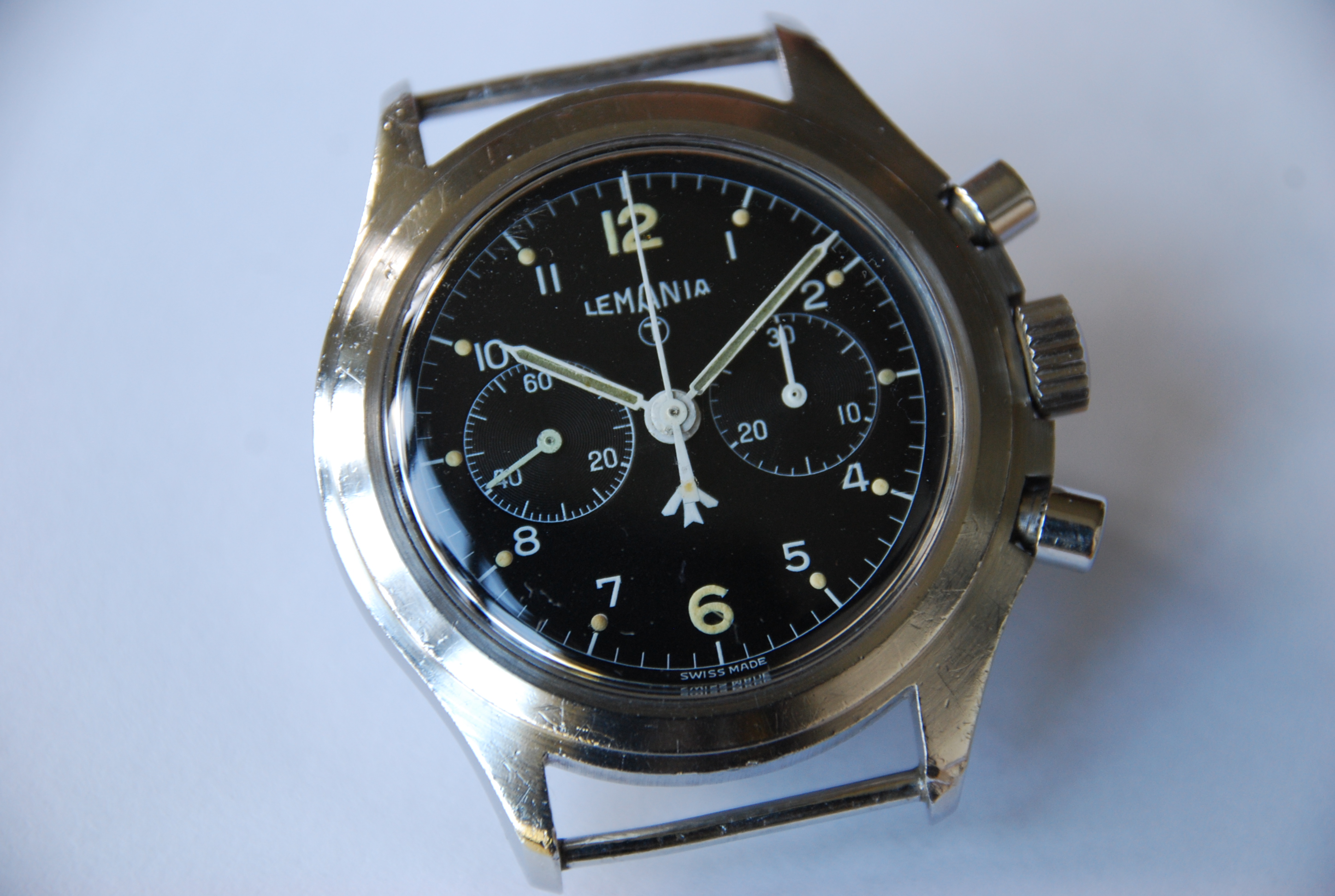 I know there are some Lemania fans here, so thought this might be of interest, Lemania Royal Navy 2 button Chronograph issued in 1975, this version was only issued in '75 and '76, so pretty rare. Powered by Lemania Calibre 1872. There are many other issued Lemania chronographs issued to other armed forces, but this is distinct in it's case is assymetrical. Hence commonly referred to as an assymetrical chronograph. I believe there is only this version in 2 button configuration form, from Lemania, other assymetrical cased issued chronograph exist made by CWC, Hamilton, Precista and Newmark. More common is the single button chronograph, again issued to British and other armed forces.