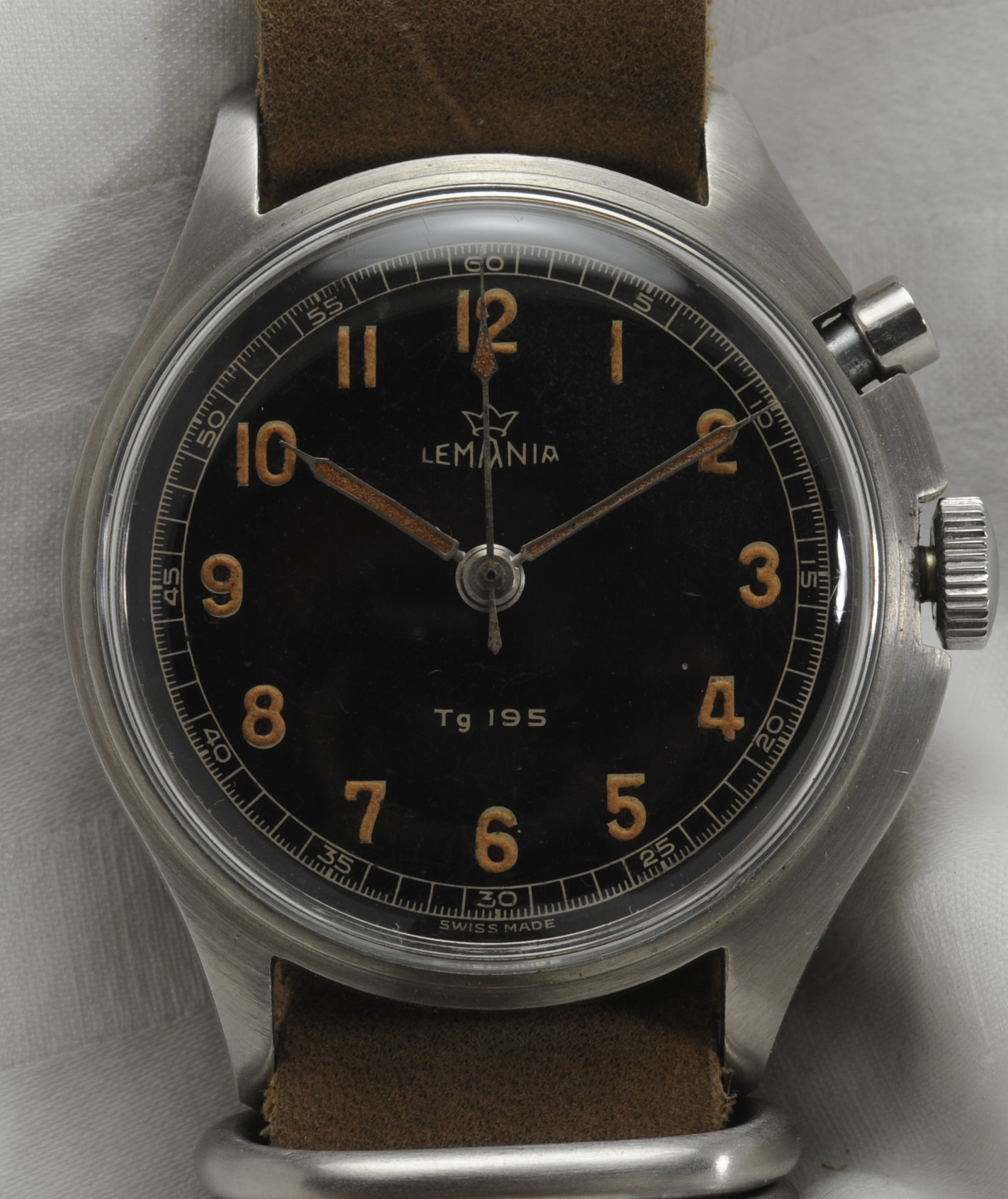 The case is looking very much like the contemporary one-pusher chronographs used by the RAF and others. They also share the same basic movement which is the Lemania caliber 222x (15TL). Omega used this design as caliber 33.3 / 170 / 171.