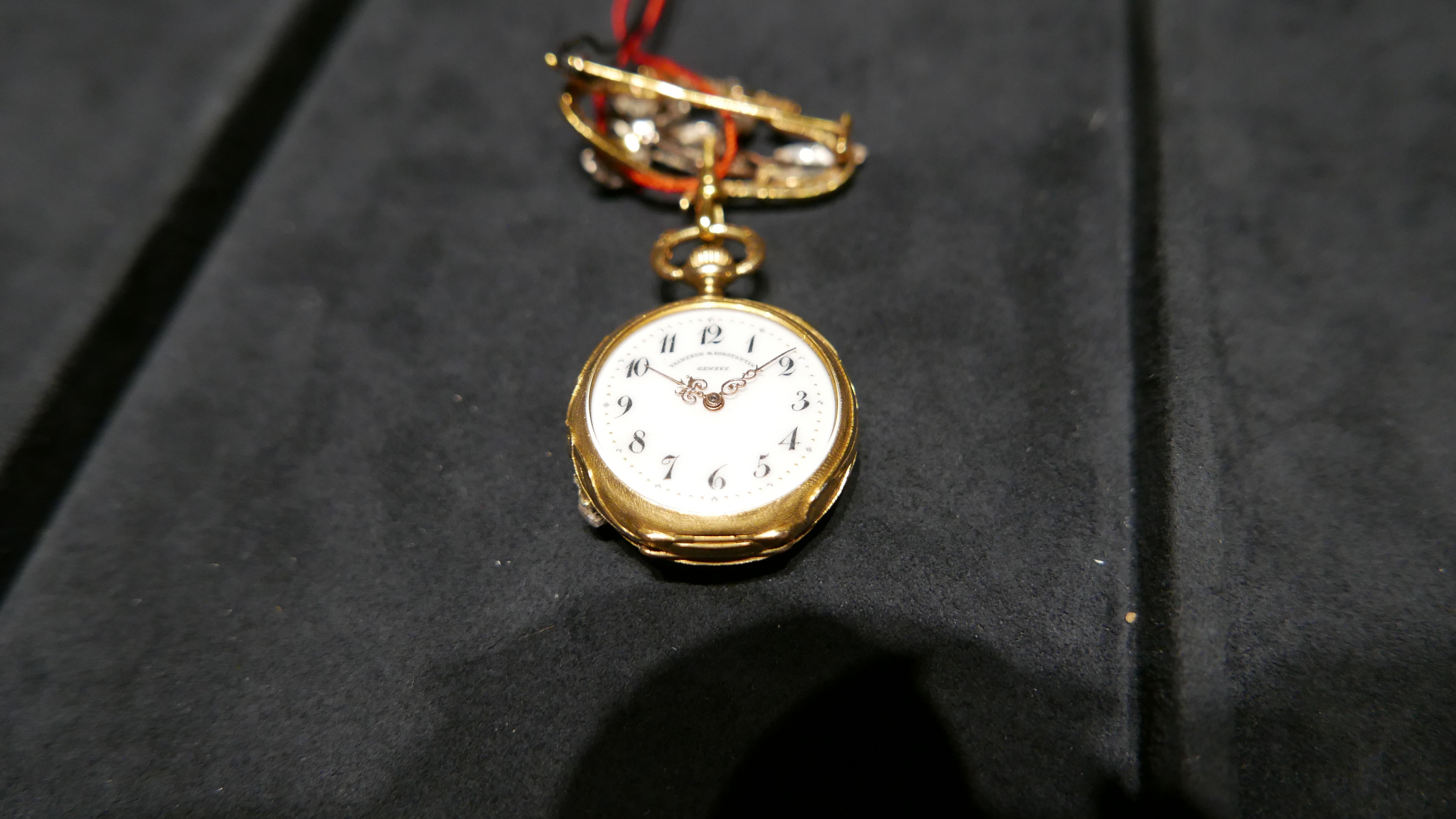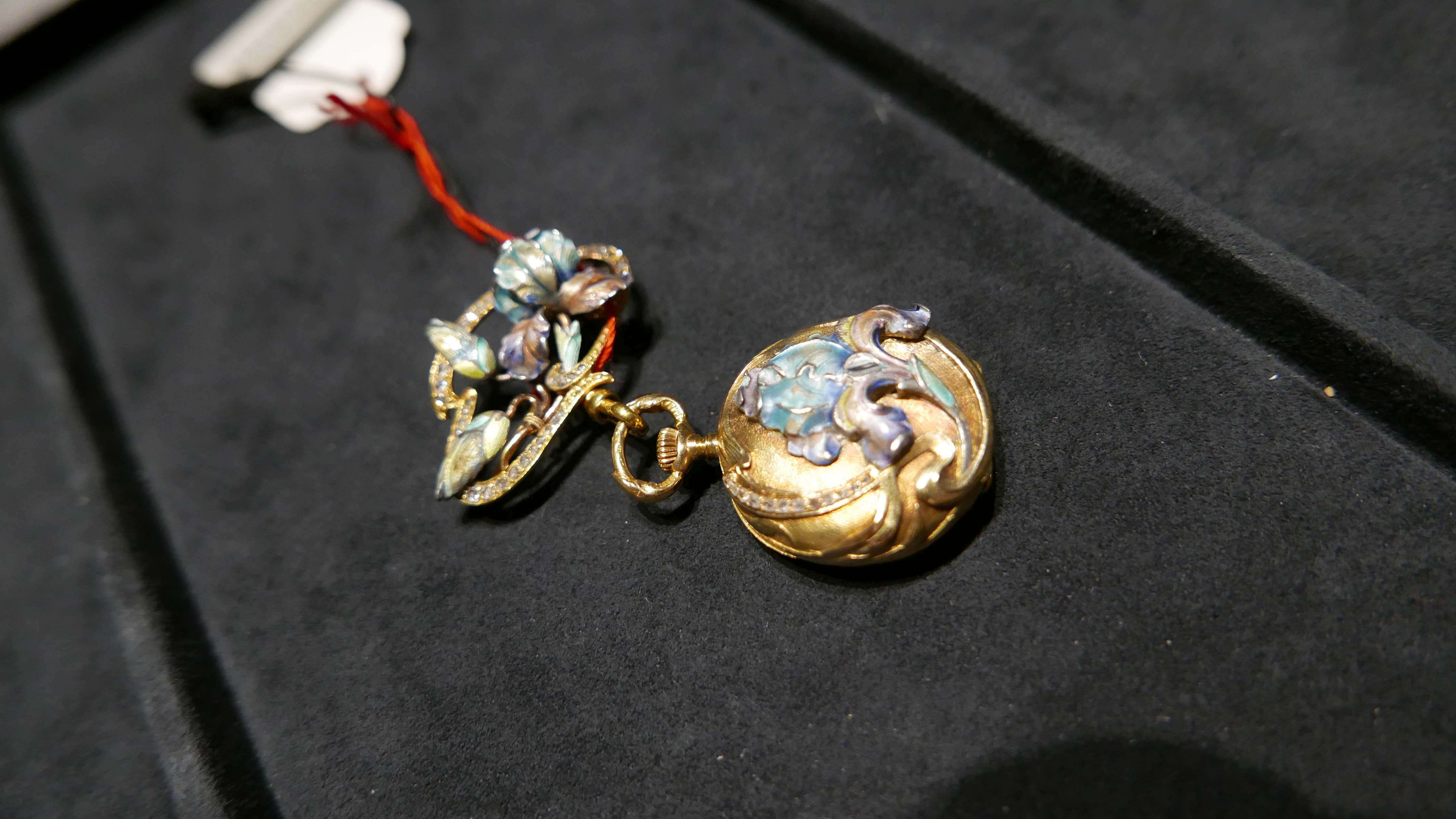 And finally this delicate fired enamel dial and enamelled gold watch broach. Lovely.