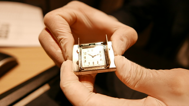 This miniature travel / purse clock was my favourite piece, of the amazing vintage pieces our host shared with us. The clock is hardly wider than my thumb. To open and close it, you press the channel set rubies on each side - popping open the little doors and lifting the clock into place. Press them again to drop the clock back into the case and close the tiny shuttered doors. Exquisite workmanship from 1929.