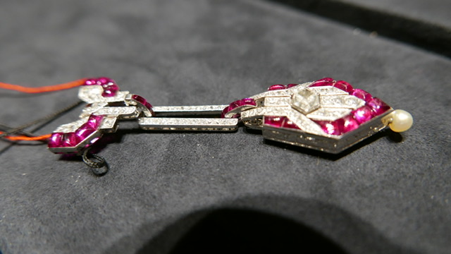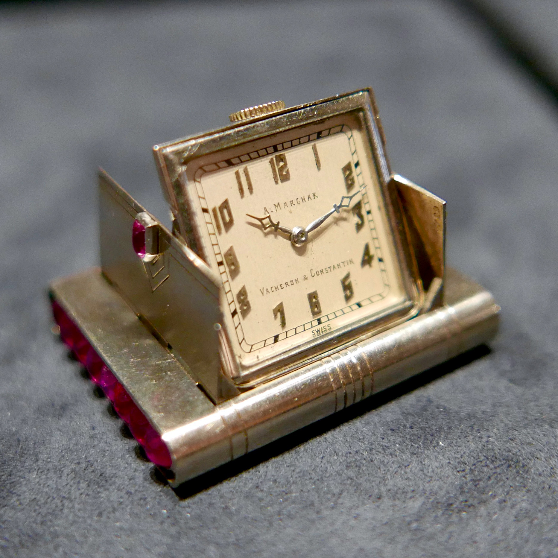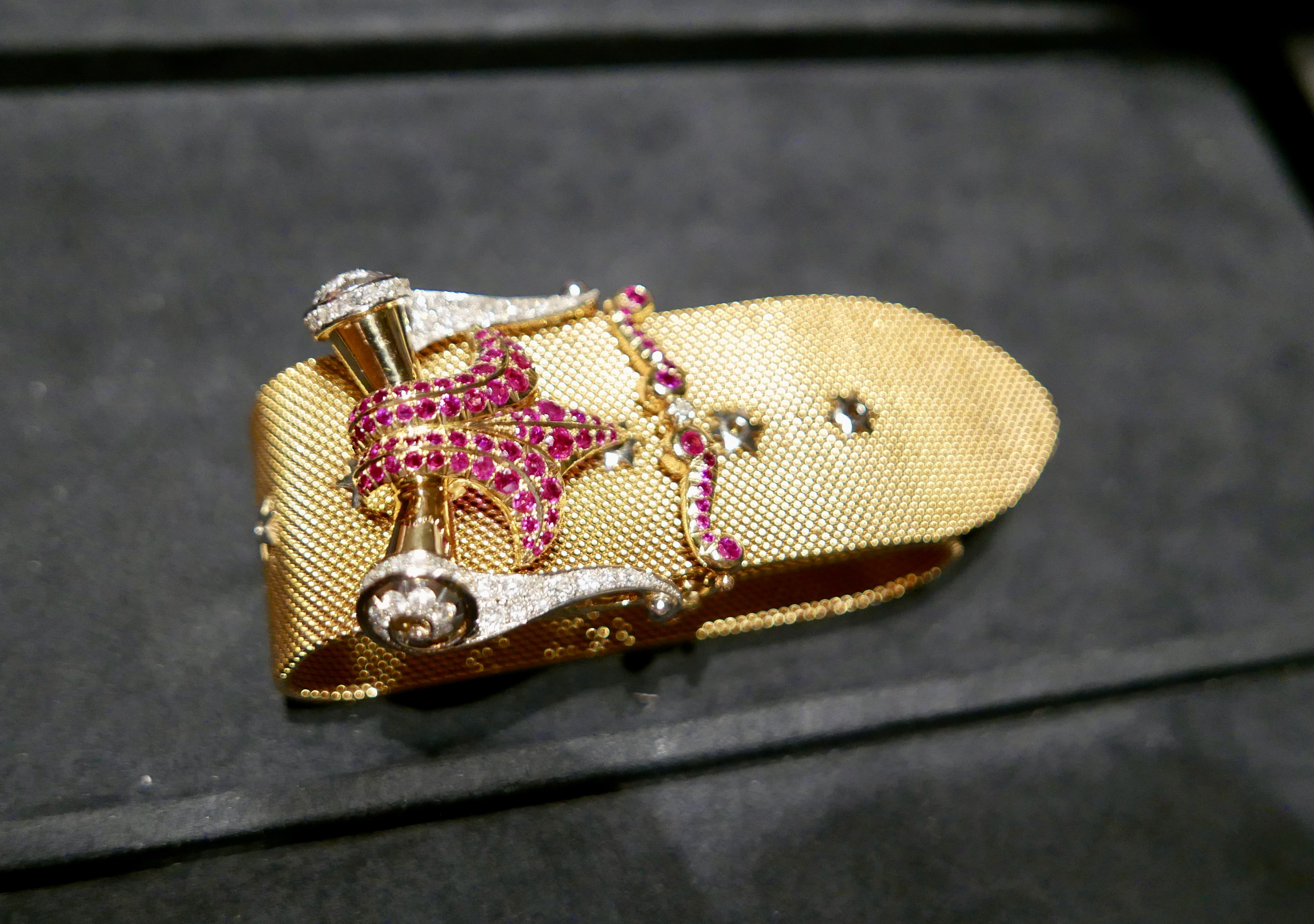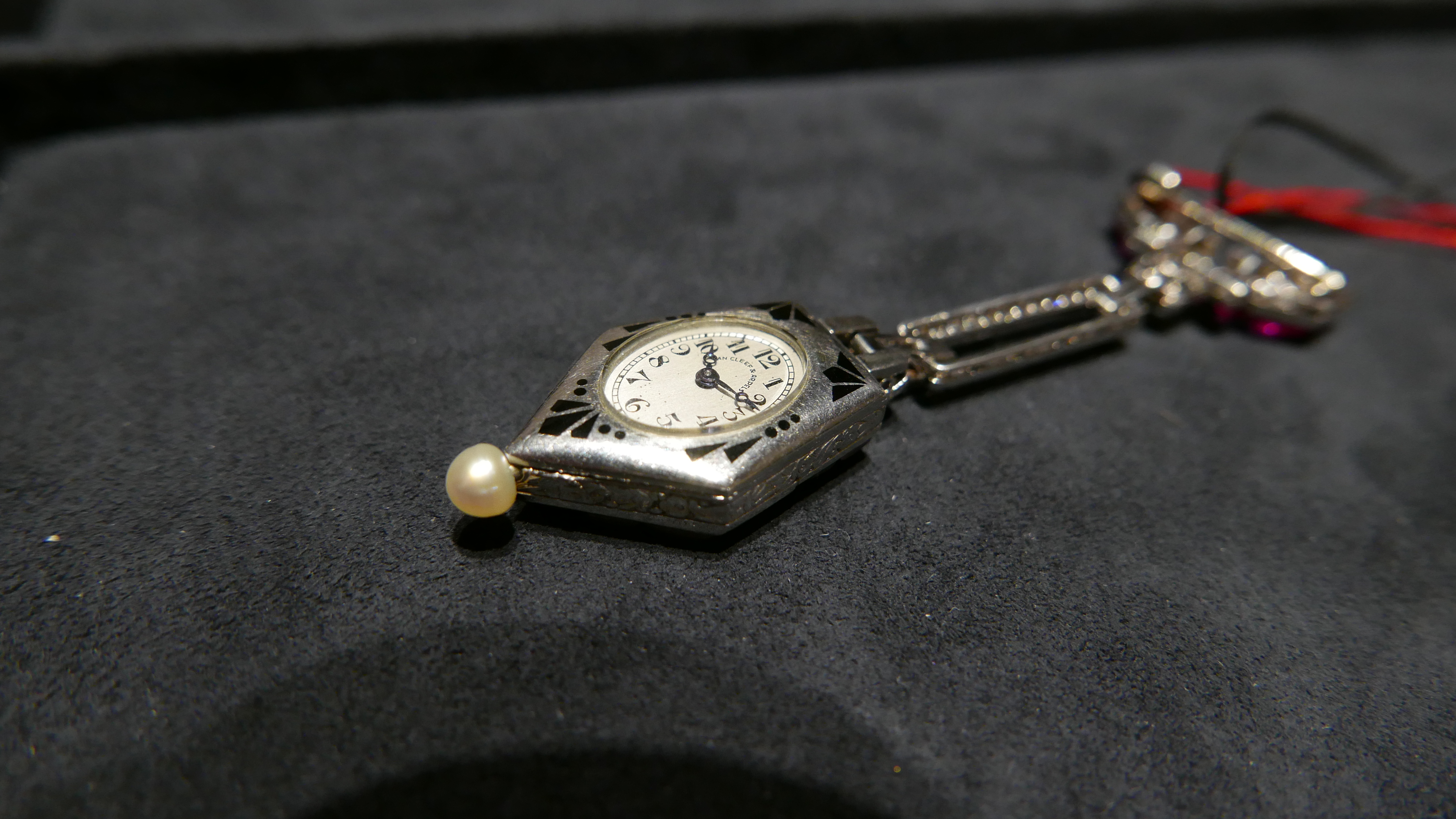 Another unusual piece, a watch broach exquisitely worked with channel set and "magic" set diamonds and rubies.