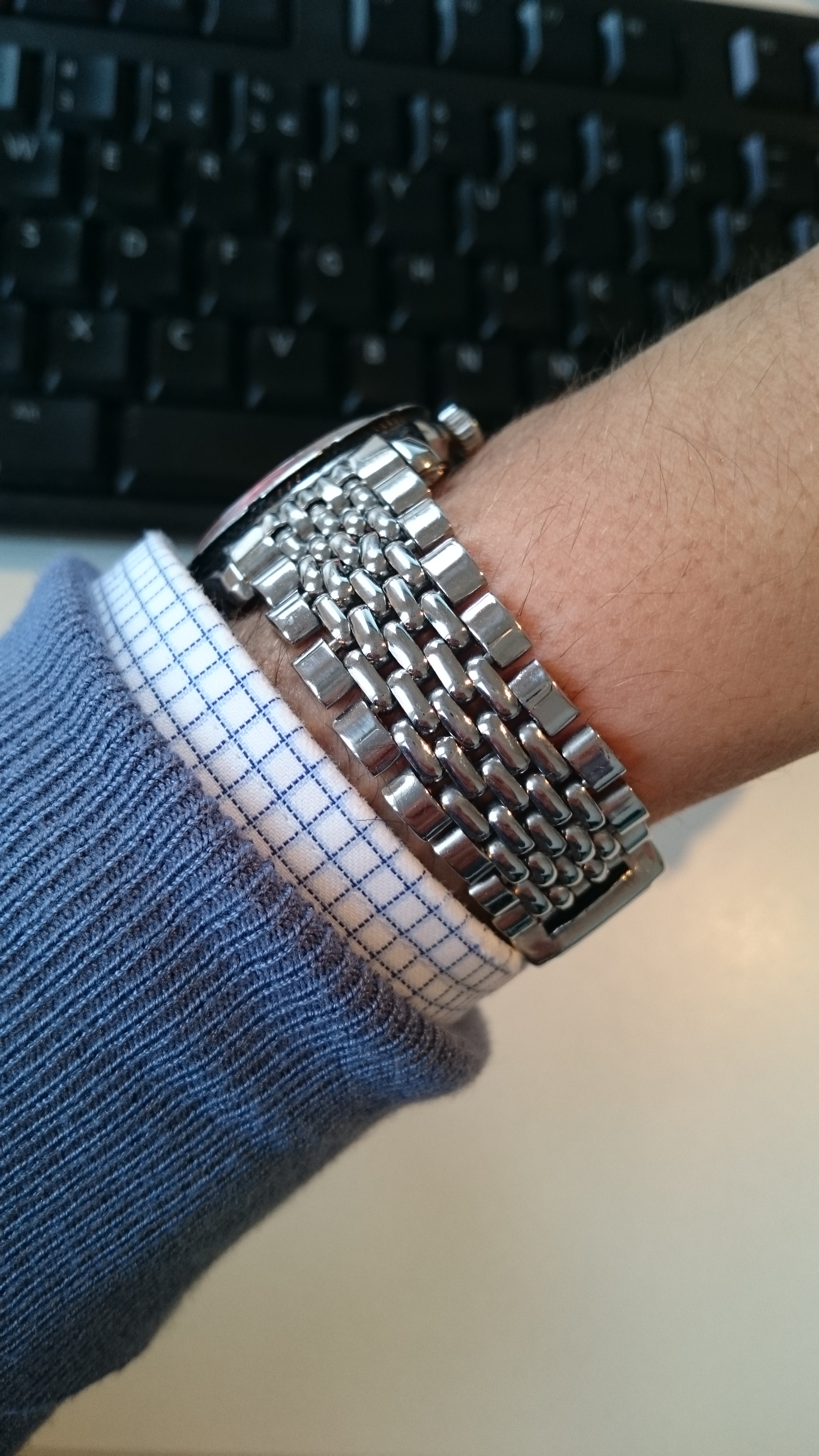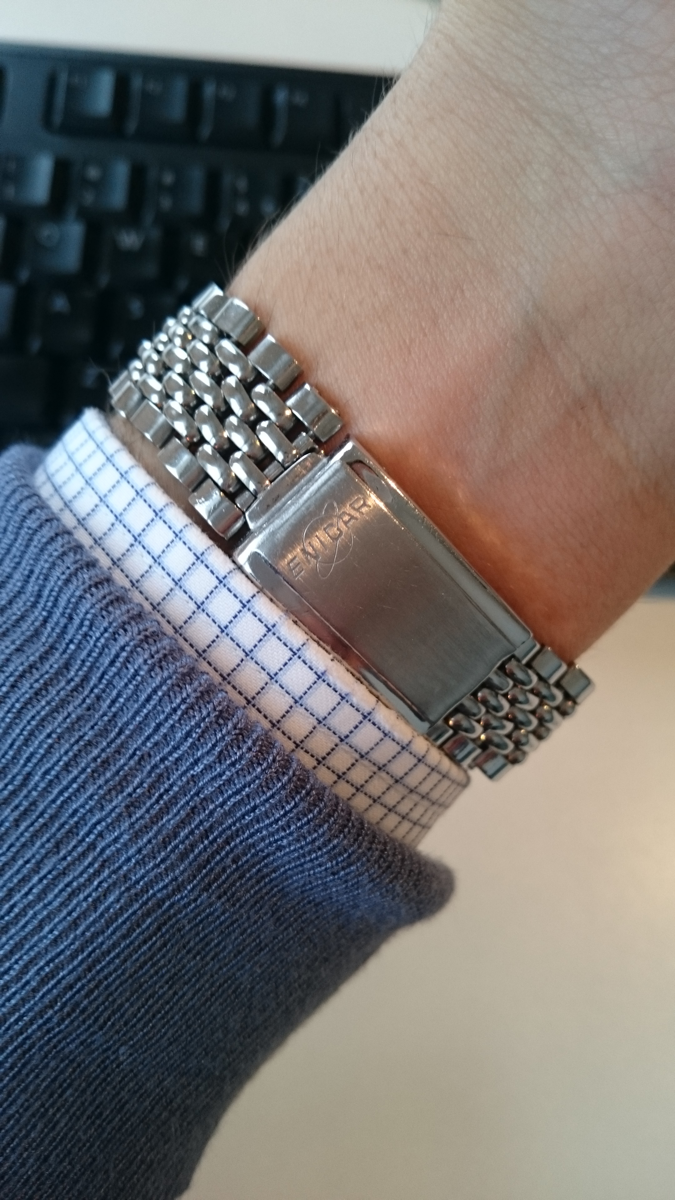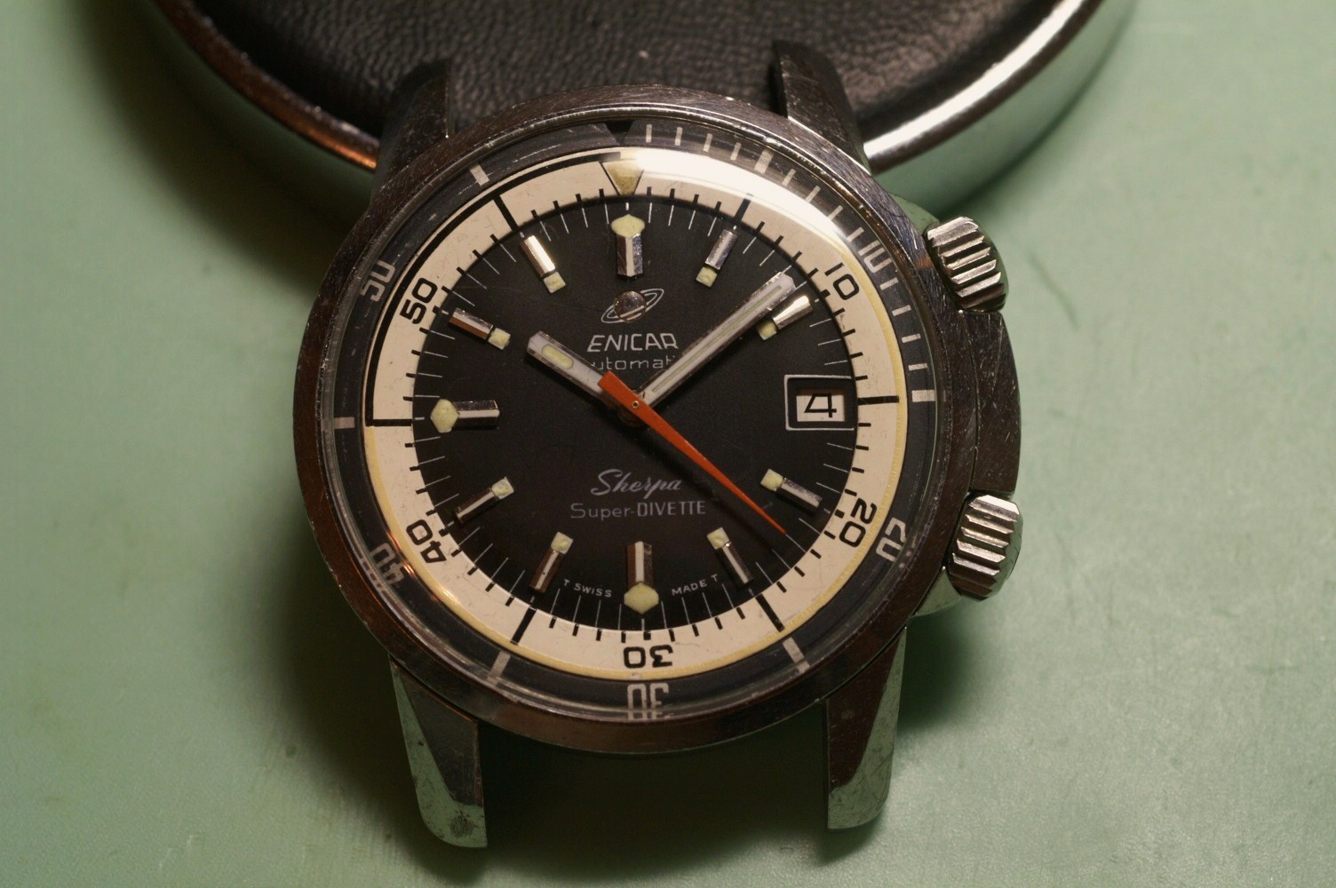 Although the dial looks rather traditional (but note Enicar's signature square arrangement of the lume dots) the compressor case with bayonet back features these special heavy faceted lugs we know from, e.g., Enicar's dive watches.
