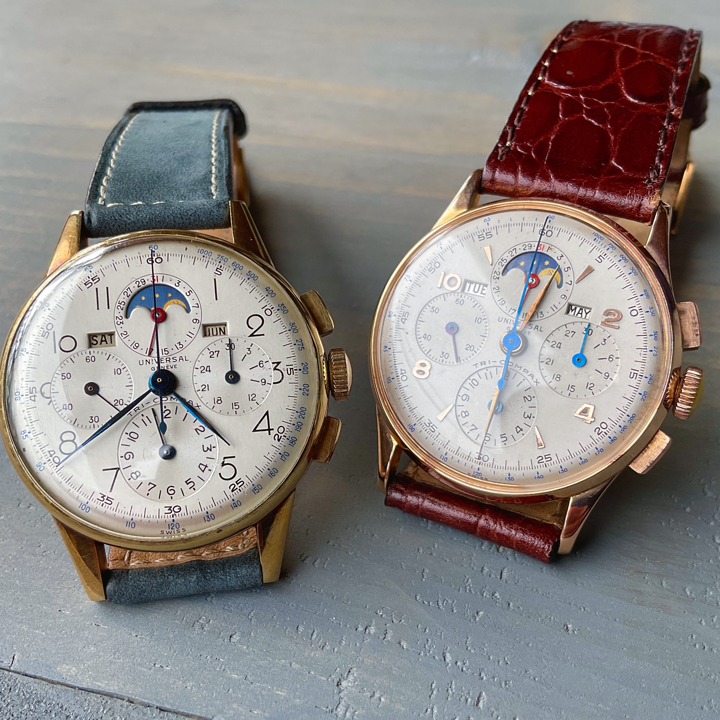 Side by side, 14k Yellow gold with art deco numerals printed on the dial, alongside 18k rose gold with applied Arabic numerals. Hard to pick a favorite! The designers and artisans of Universal Geneve during their golden era just knocked ‘em out of the park! 😀