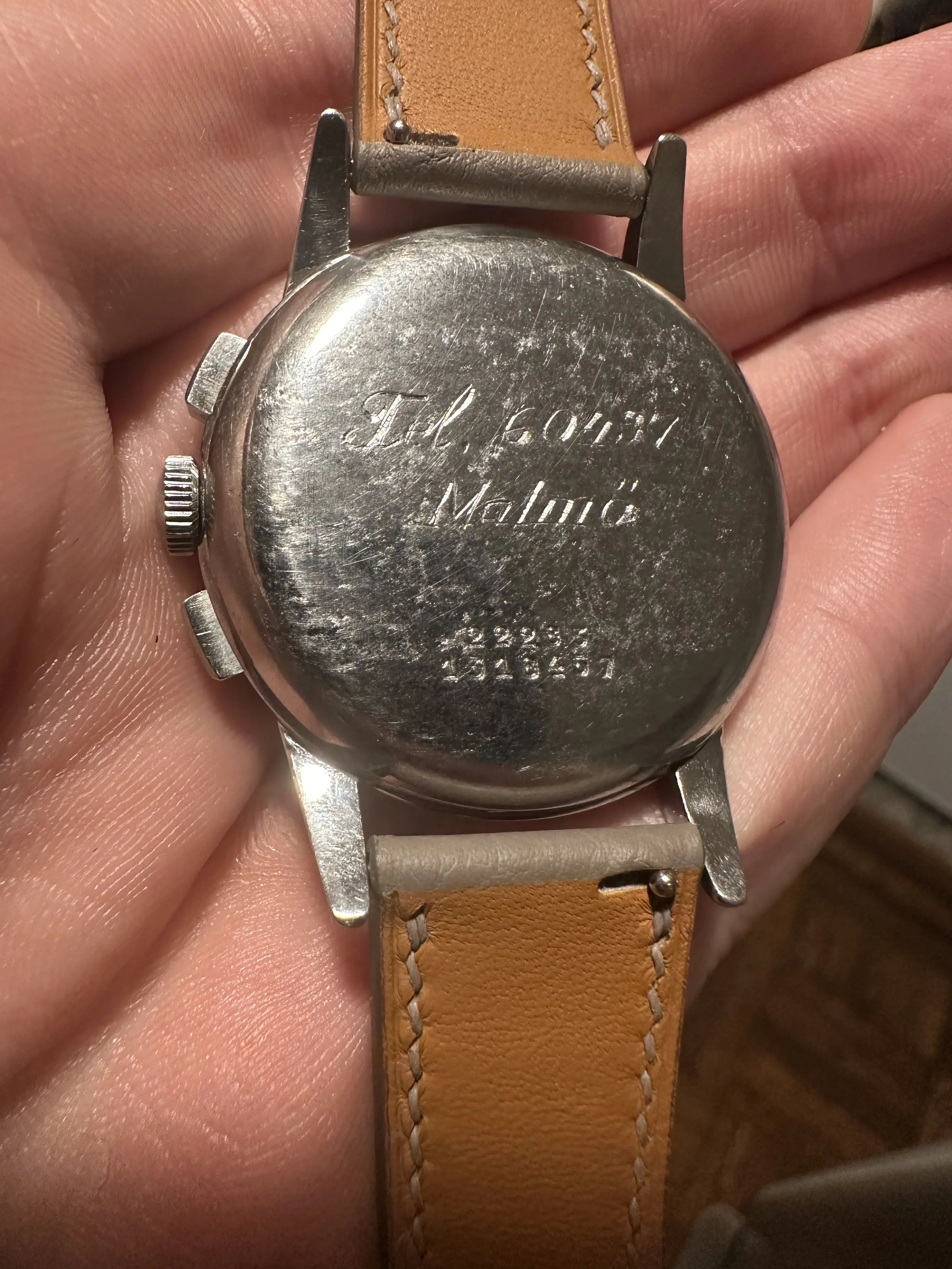I picked this up a few months ago from an Auction house in Malmo, Sweden. The previous owner engraved their telephone number on the caseback in case the watch was ever lost (I guess they were an optimist).
