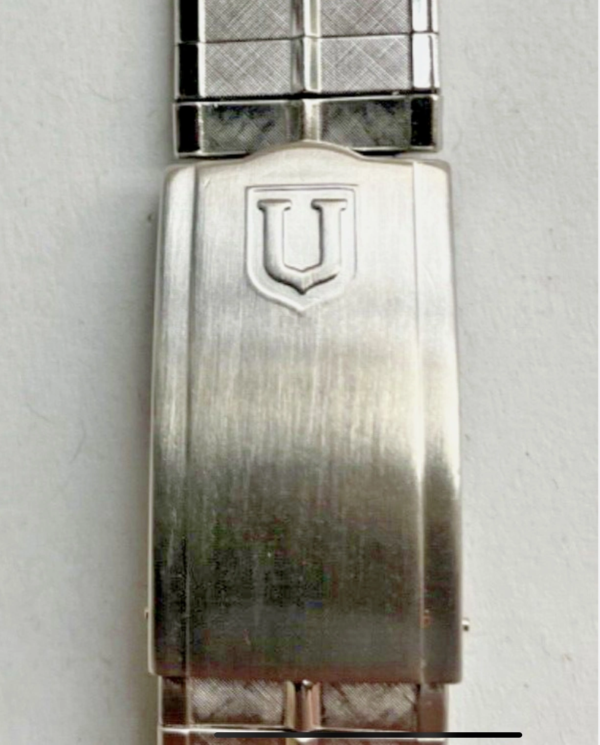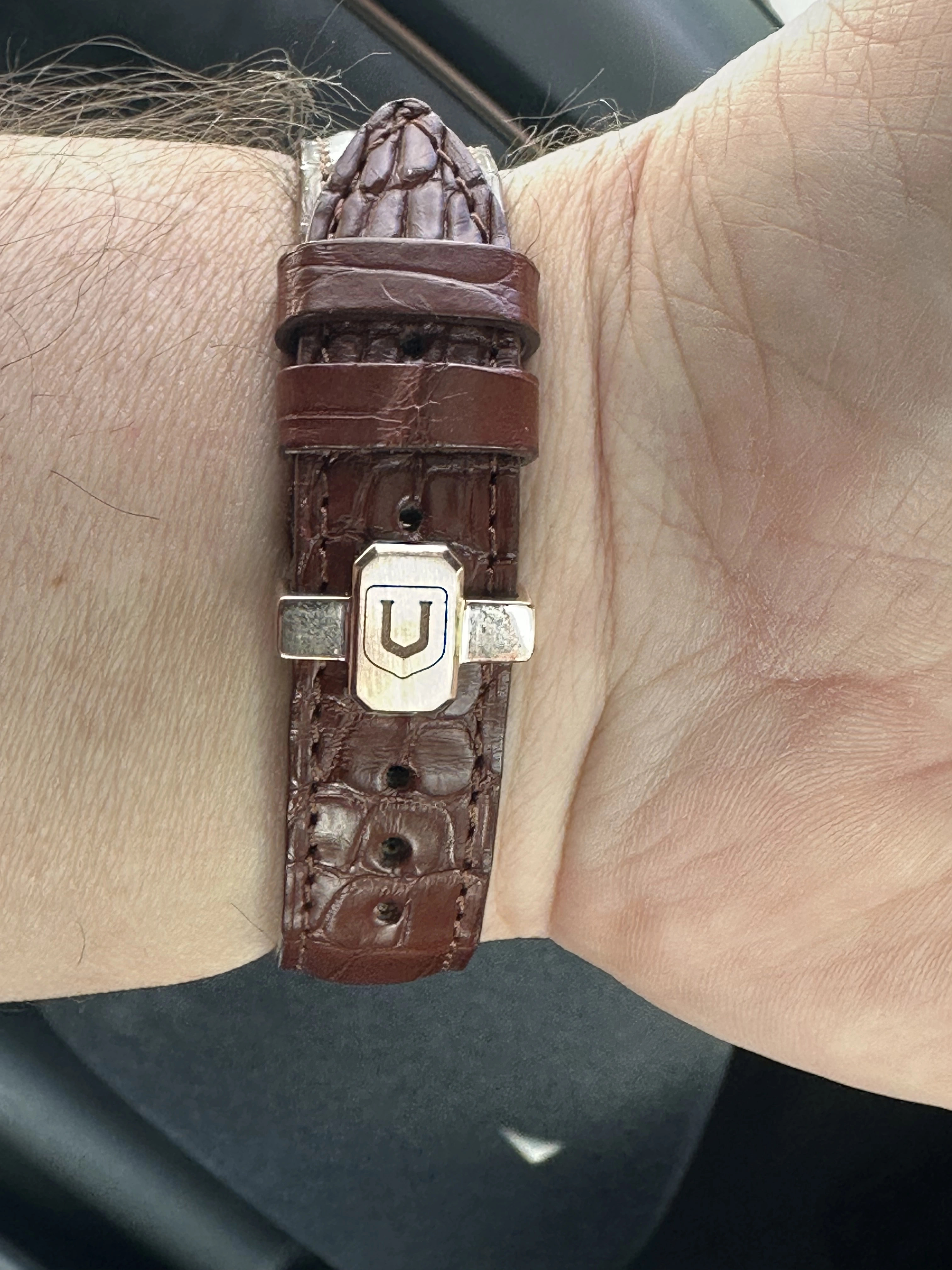 Updated photo of family heirloom with Harry Winston deployment buckle customized with 1950s UG logo.