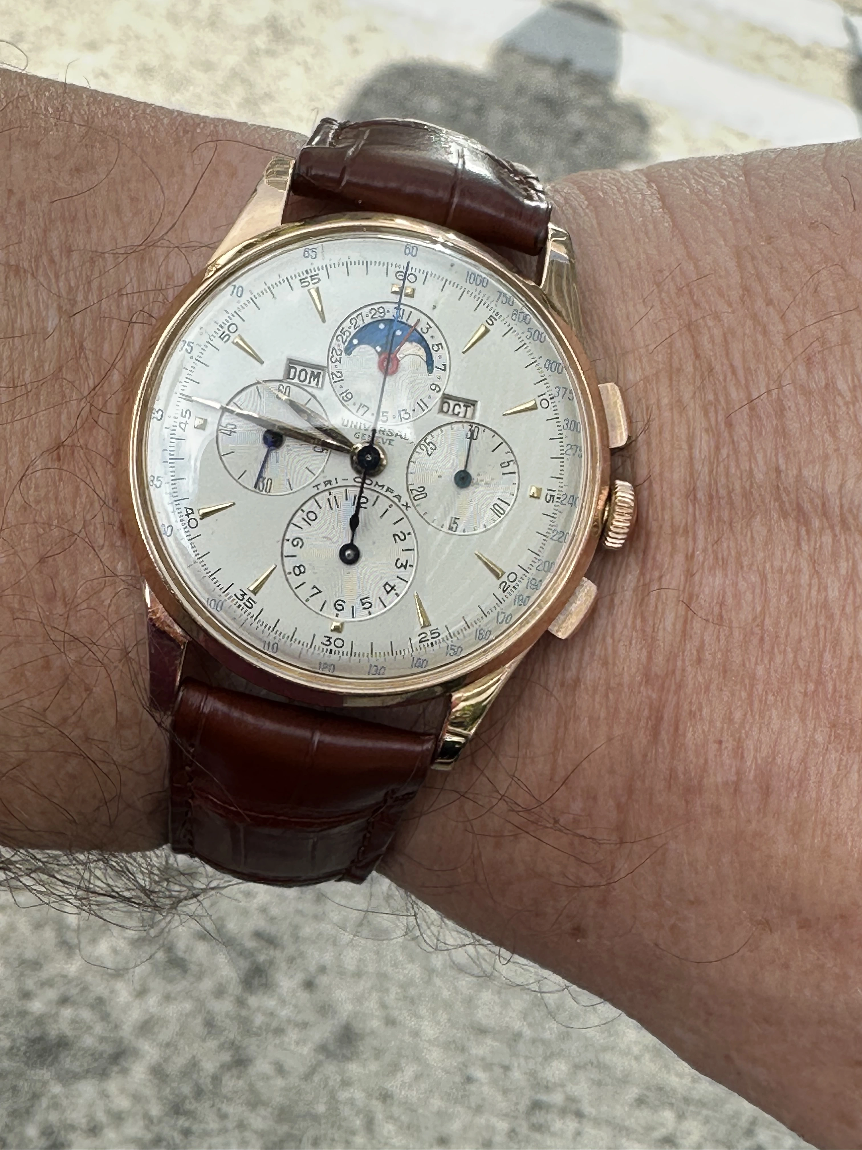 My Tri-Compax was manufactured in the early 50s, perhaps 2-3 years before this logo was registered, regardless I think "it works well" on the watch. I am a fan of deployment buckles as they seem much safer and easier to use. After some research I learned they were invented by Louis Cartier in 1910, so I felt less bad then putting one on the 1950s UG.