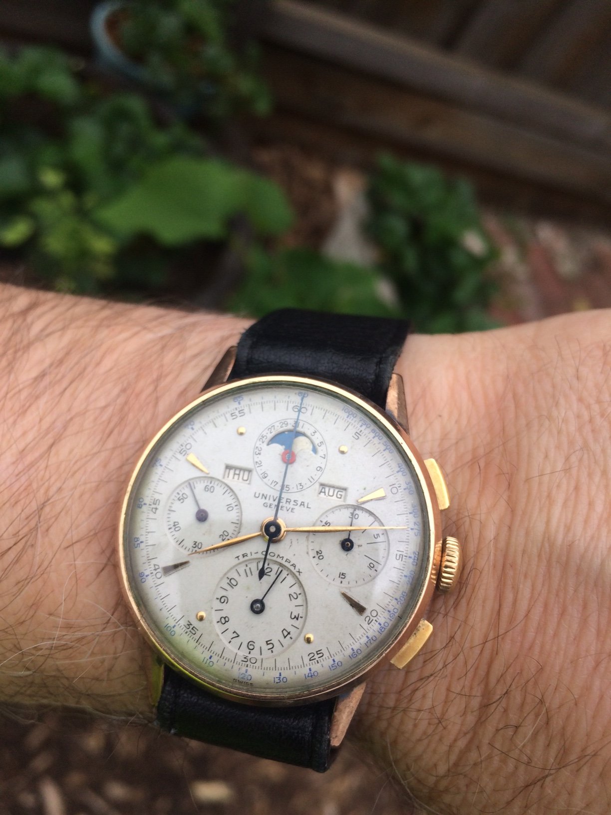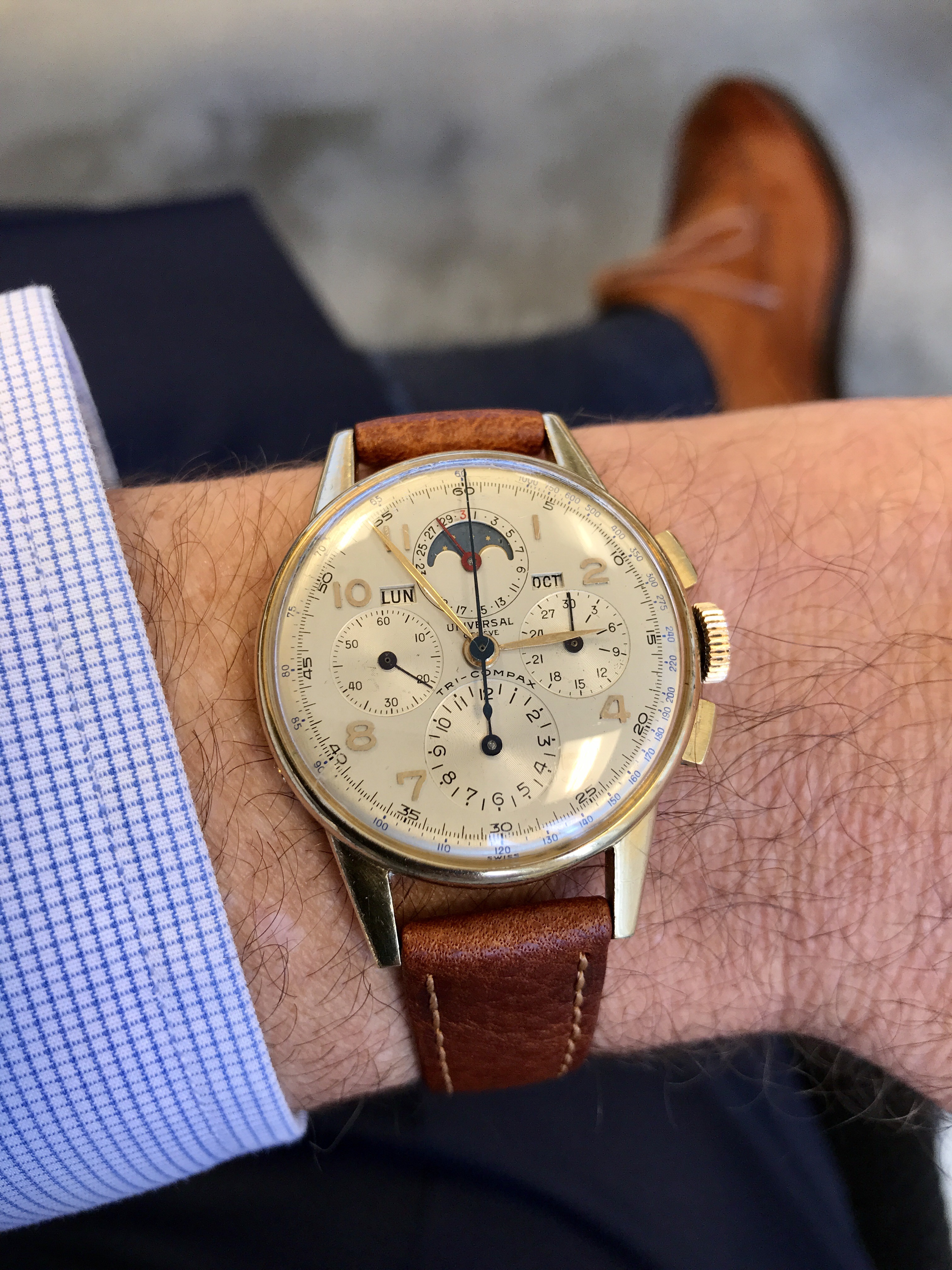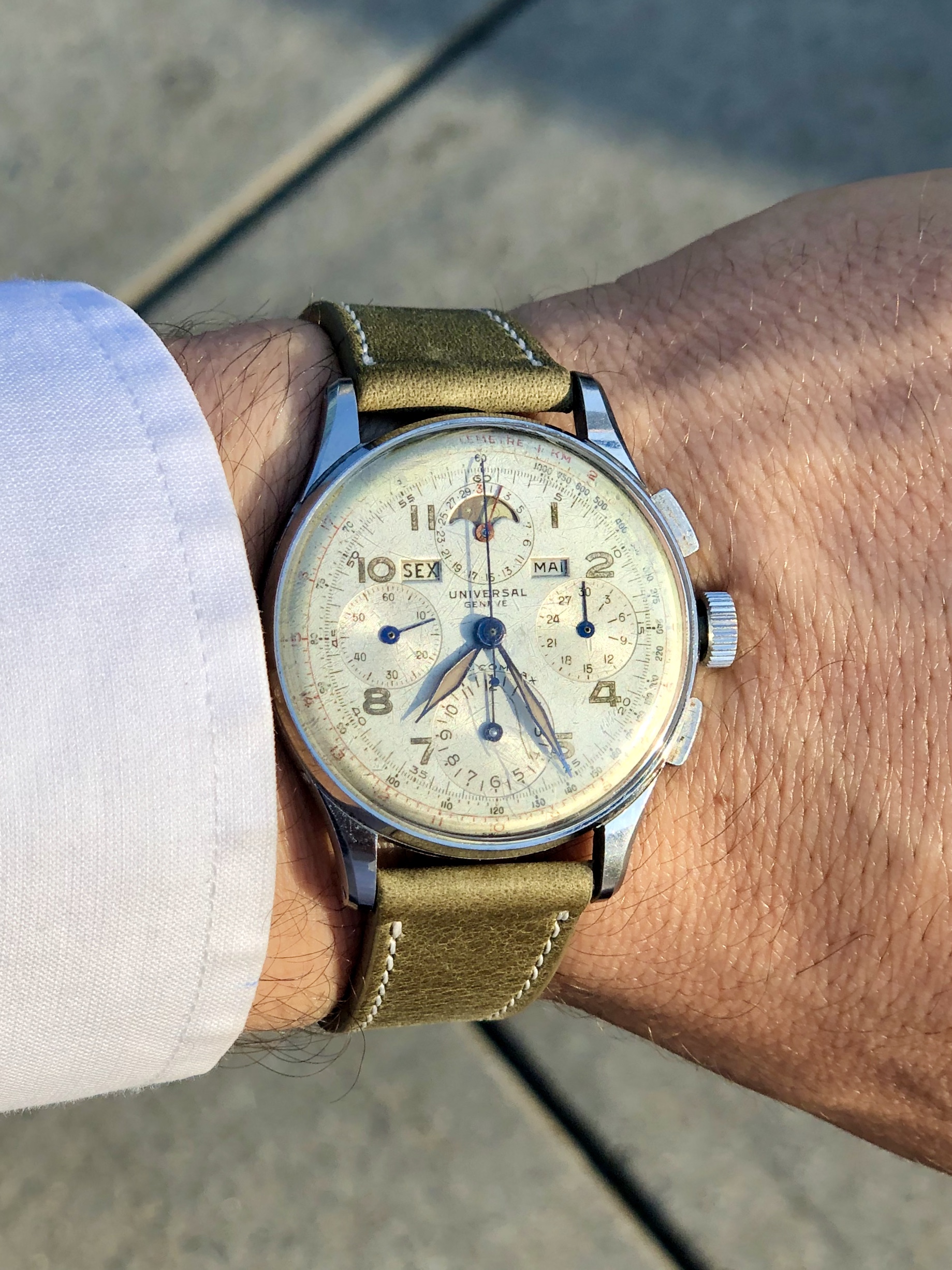 I didn't notice your particular comment/question until just this morning on the lugs. For whatever it's worth, I'll note that 3 of my 4 Tri-Compax from the 1946-49 period (all with smiling moons) have male springbar holes, original to the watches (you can see the models earlier in this thread, and the latest with yesterday's post). Only my rose gold Tri has the "dreaded" female springbars. So I can concur that some of the models from this period - particular with "chunkier" lugs, did originally come with drilled holes for springbars. Let me know if you (or @Larry S ) want additional pics for any reason.