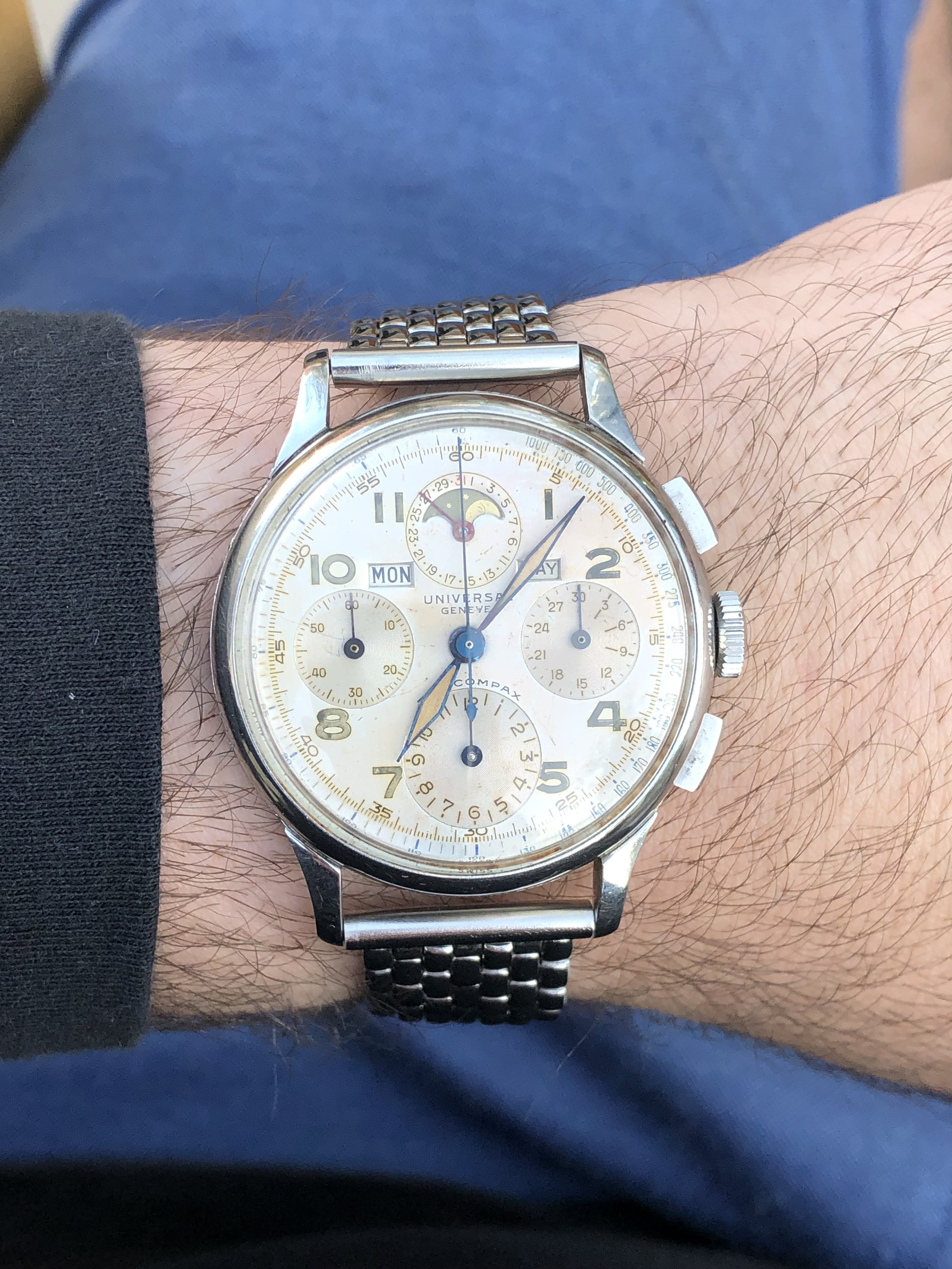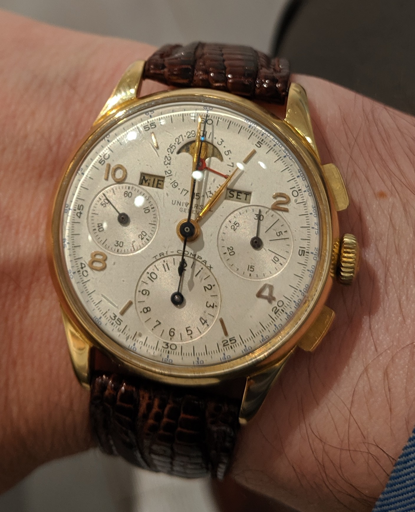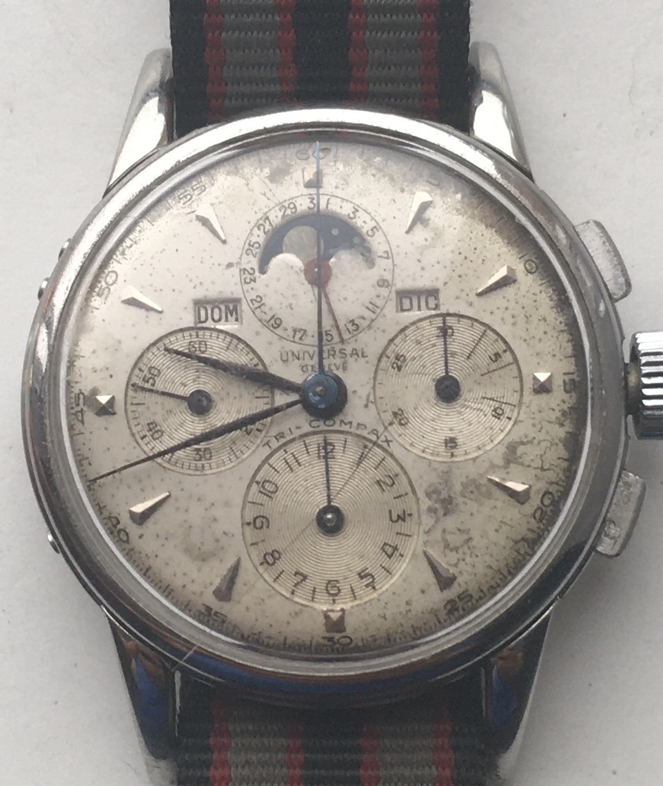 I didn't notice your particular comment/question until just this morning on the lugs. For whatever it's worth, I'll note that 3 of my 4 Tri-Compax from the 1946-49 period (all with smiling moons) have male springbar holes, original to the watches (you can see the models earlier in this thread, and the latest with yesterday's post). Only my rose gold Tri has the "dreaded" female springbars. So I can concur that some of the models from this period - particular with "chunkier" lugs, did originally come with drilled holes for springbars. Let me know if you (or @Larry S ) want additional pics for any reason.