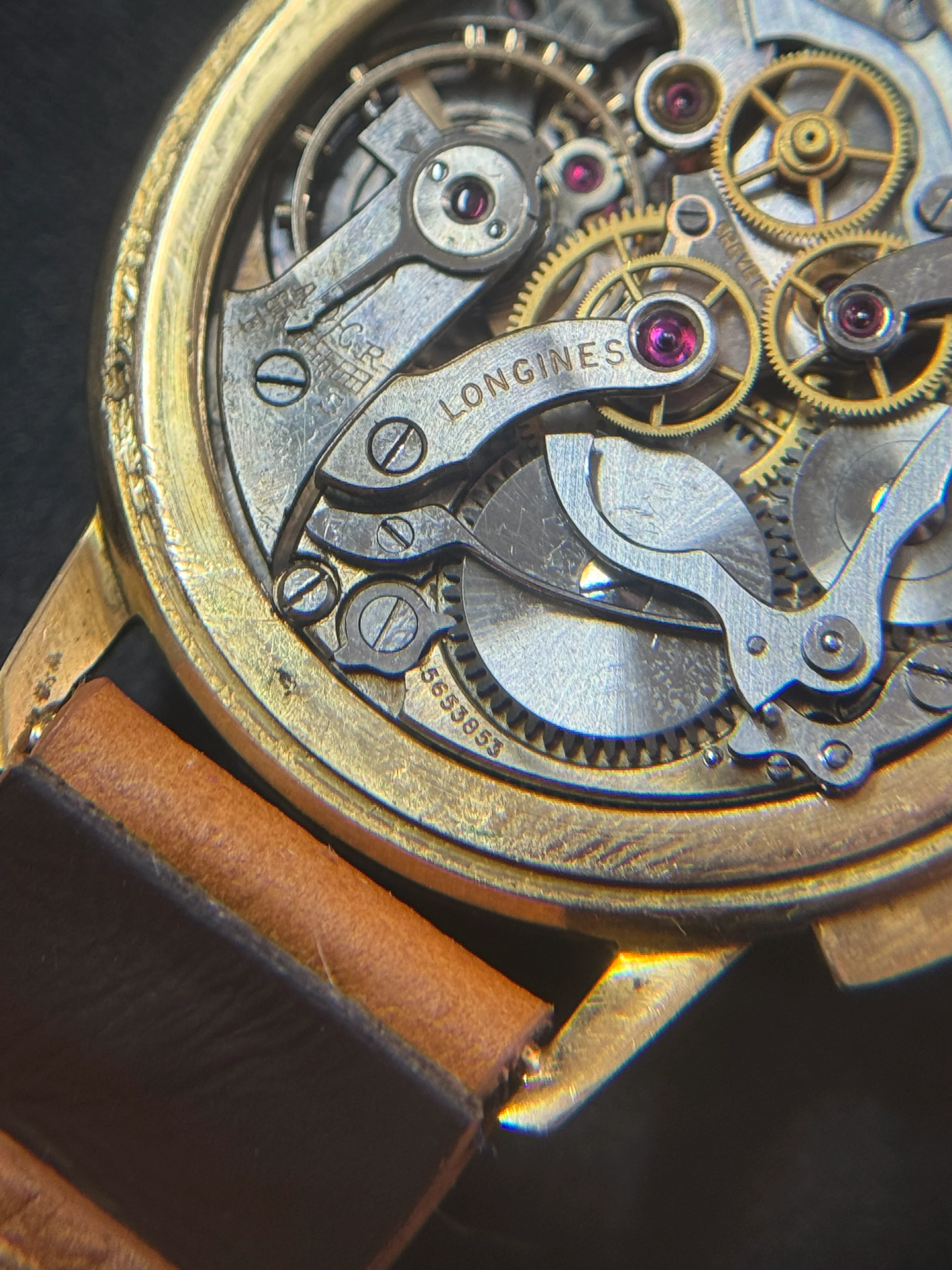 I purchased this watch from a French vintage dealer, who acquired it from an Italian gentleman who had inherited it from his grandfather. Based on the serial number, the watch was produced in 1937 and features the Longines caliber 12.68Z with a continuous flyback chronograph.