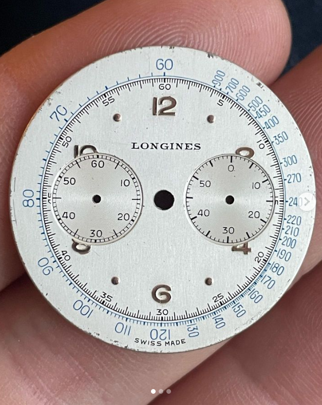 Firstly, the design of the sub-dials is anomalous. I have never seen an original 30CH dial with similar sub-dials. The font of the numbers is not right. It looks more reminiscent of UG dials. The 'entirely open' design of the individual hash marks is also not right. By 'entirely open', I mean not connected to a printed circle. Early dials (no winged-hourglass emblem) with large sub-dials like these should have a closed track. Finally, the elongated markings at 3, 6, and 9 in the minute totalizer are not found on this type of 30CH dial.