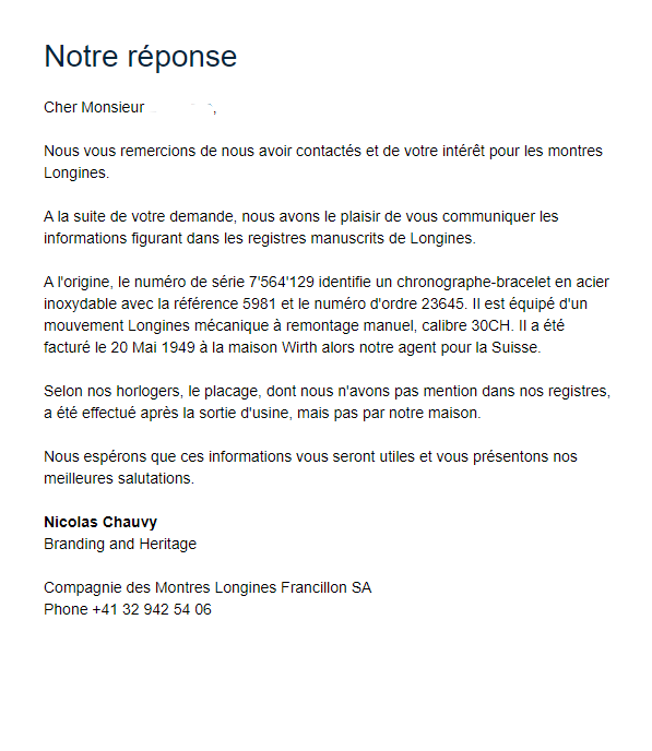 From the letter, it looks like Longines got pictures which appeared correct for the watch, the letter states that according to their watchmakers the plating was added to the queried watch after it left the factory. They’re not saying the watch was recased afterr it left the factory.(which they could have said).
