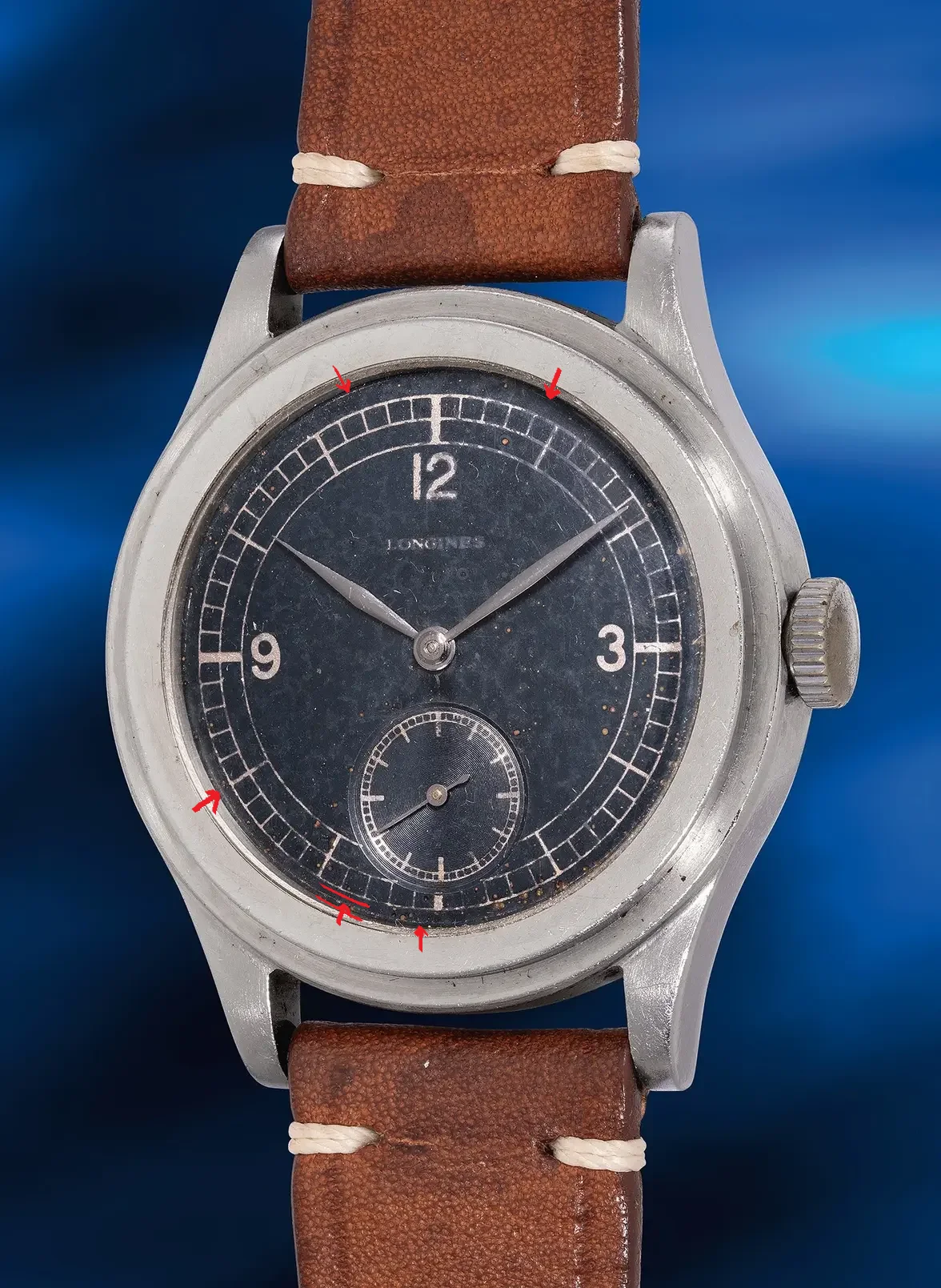 Also, the dial condition is very poor as well, and damage marks around the edge of the dial suggest this dial originally came in a smaller watch, and was swapped later on.