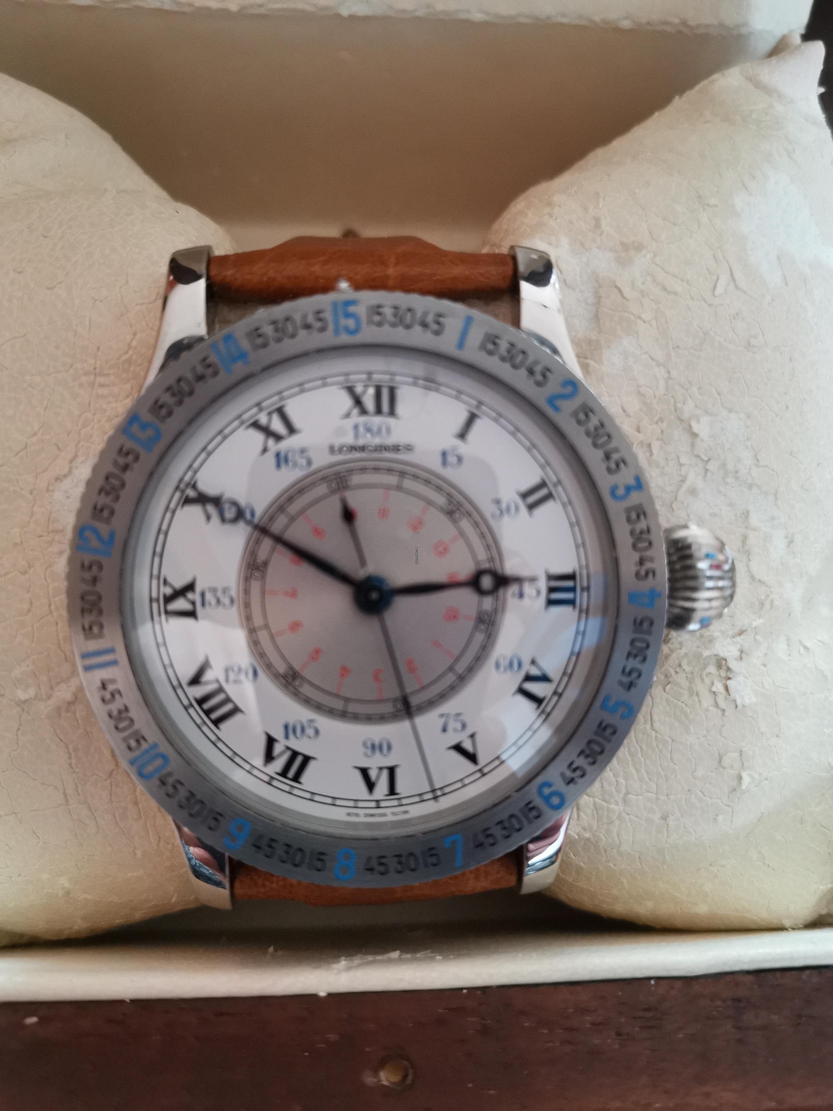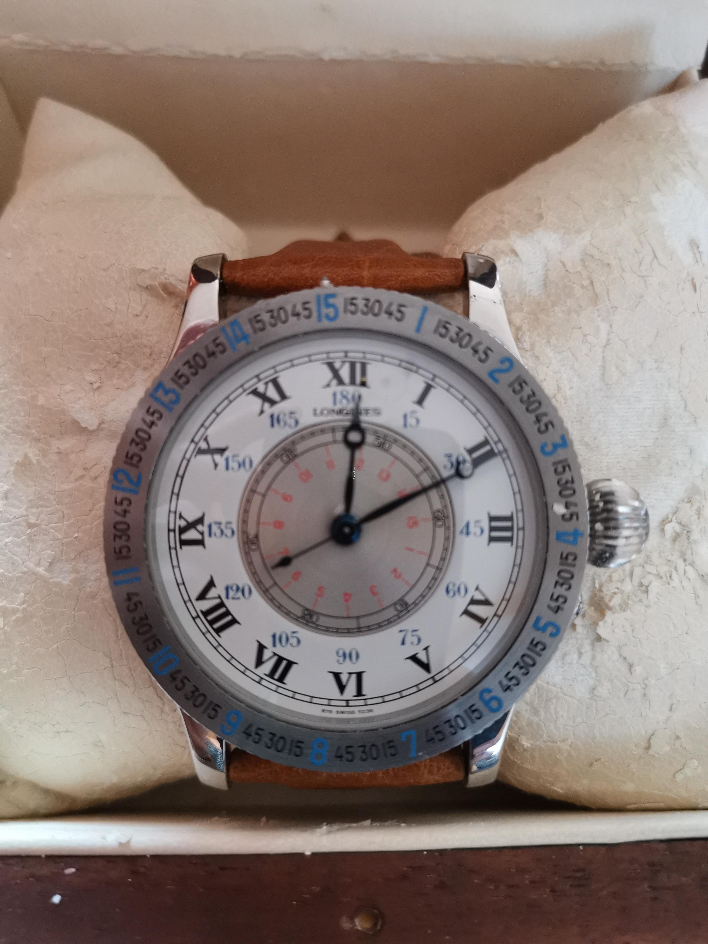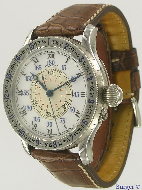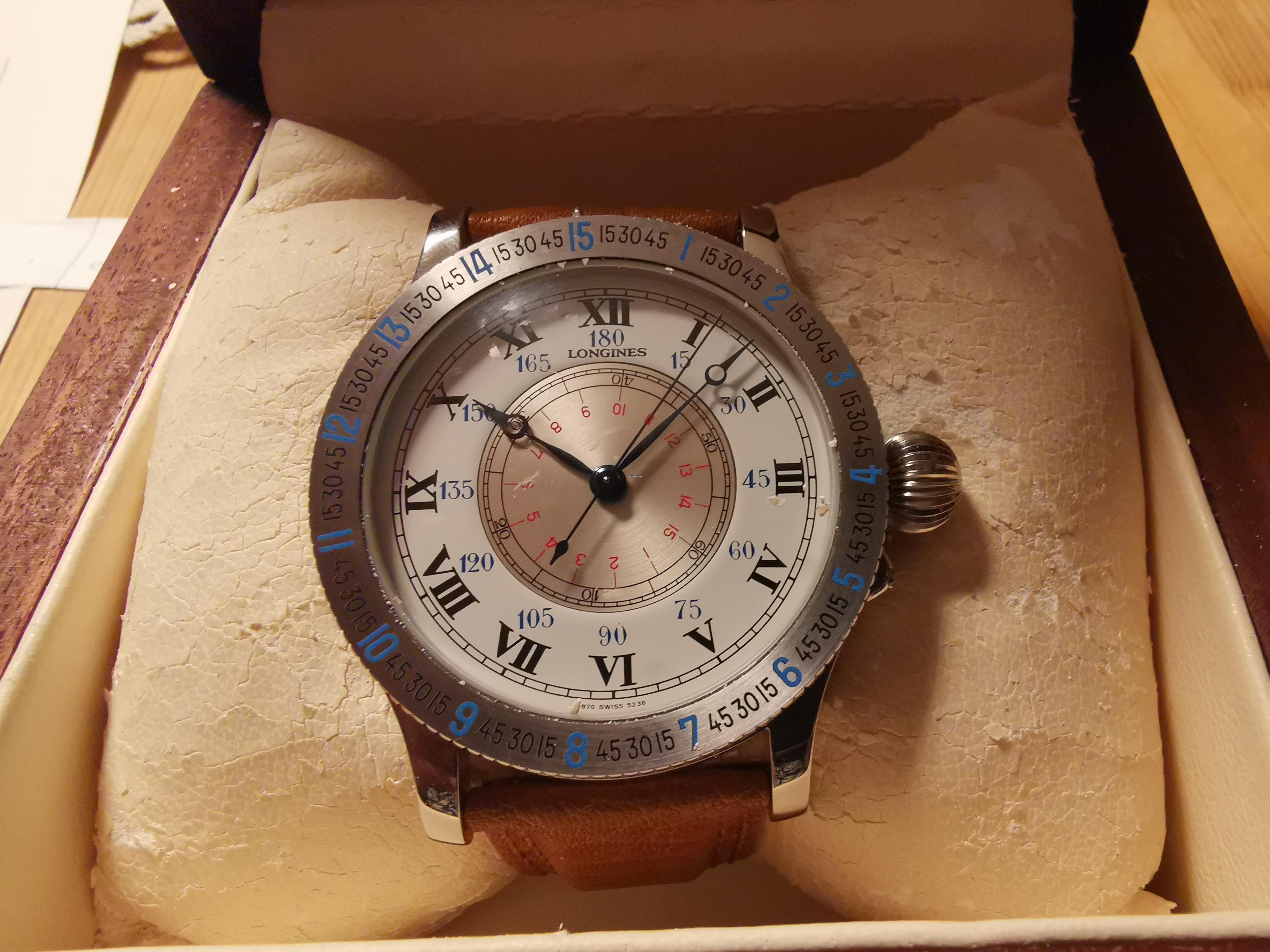 According to the images, we identify the model reference 5238. This Lindbergh Hour Angle Watch in stainless steel is fitted with a Longines manually wound mechanical movement, caliber 876 and was launched in 1988.