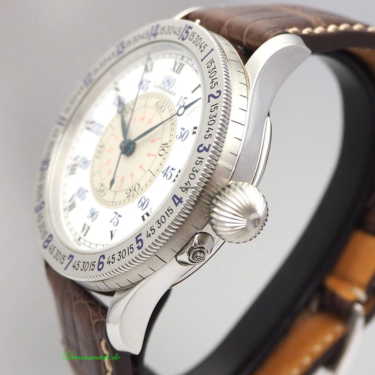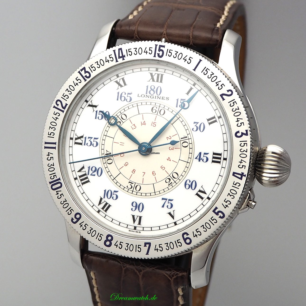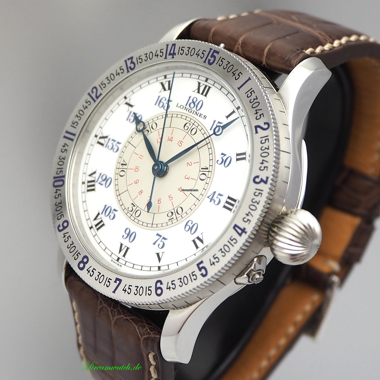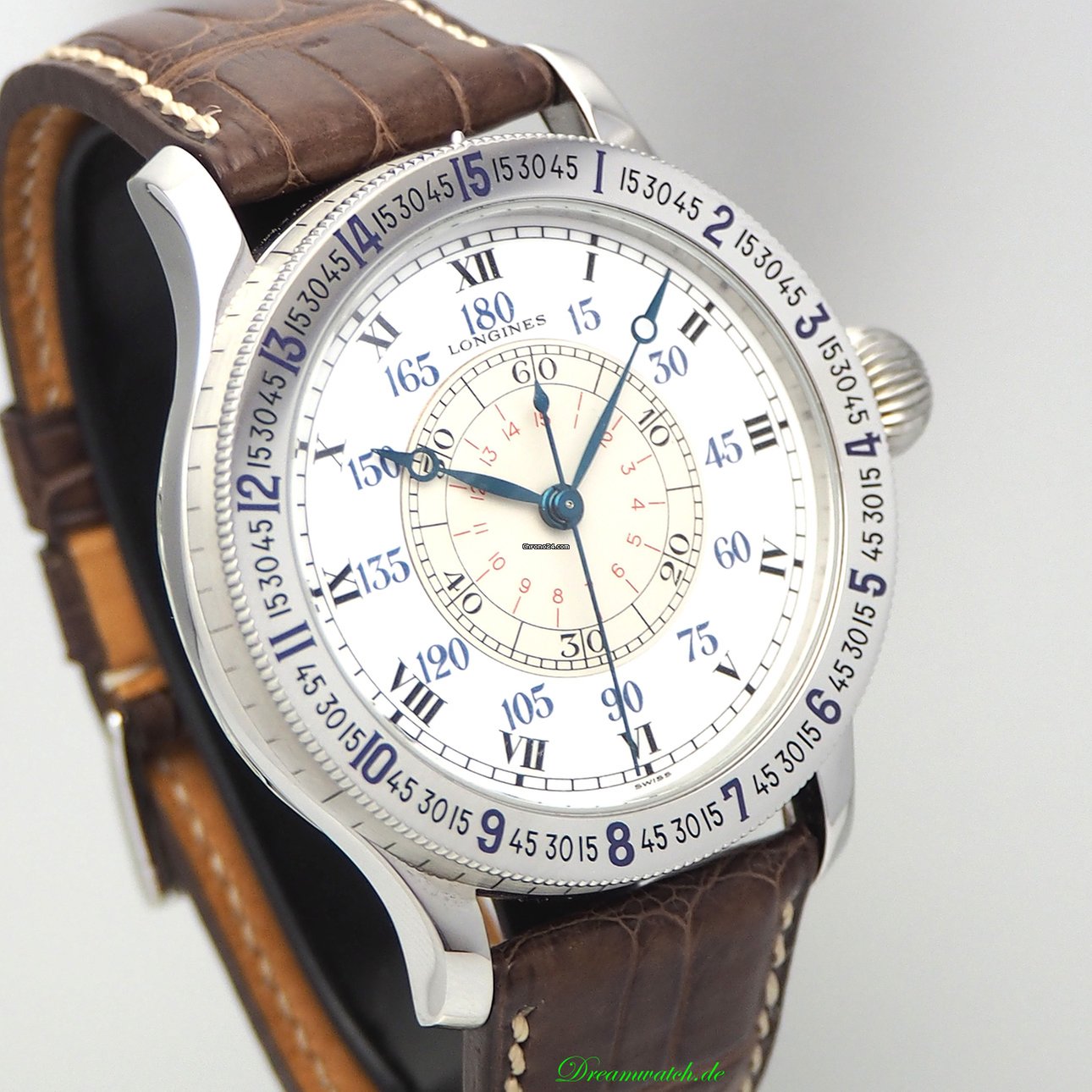 According to the images, we identify the model reference 5238. This Lindbergh Hour Angle Watch in stainless steel is fitted with a Longines manually wound mechanical movement, caliber 876 and was launched in 1988.