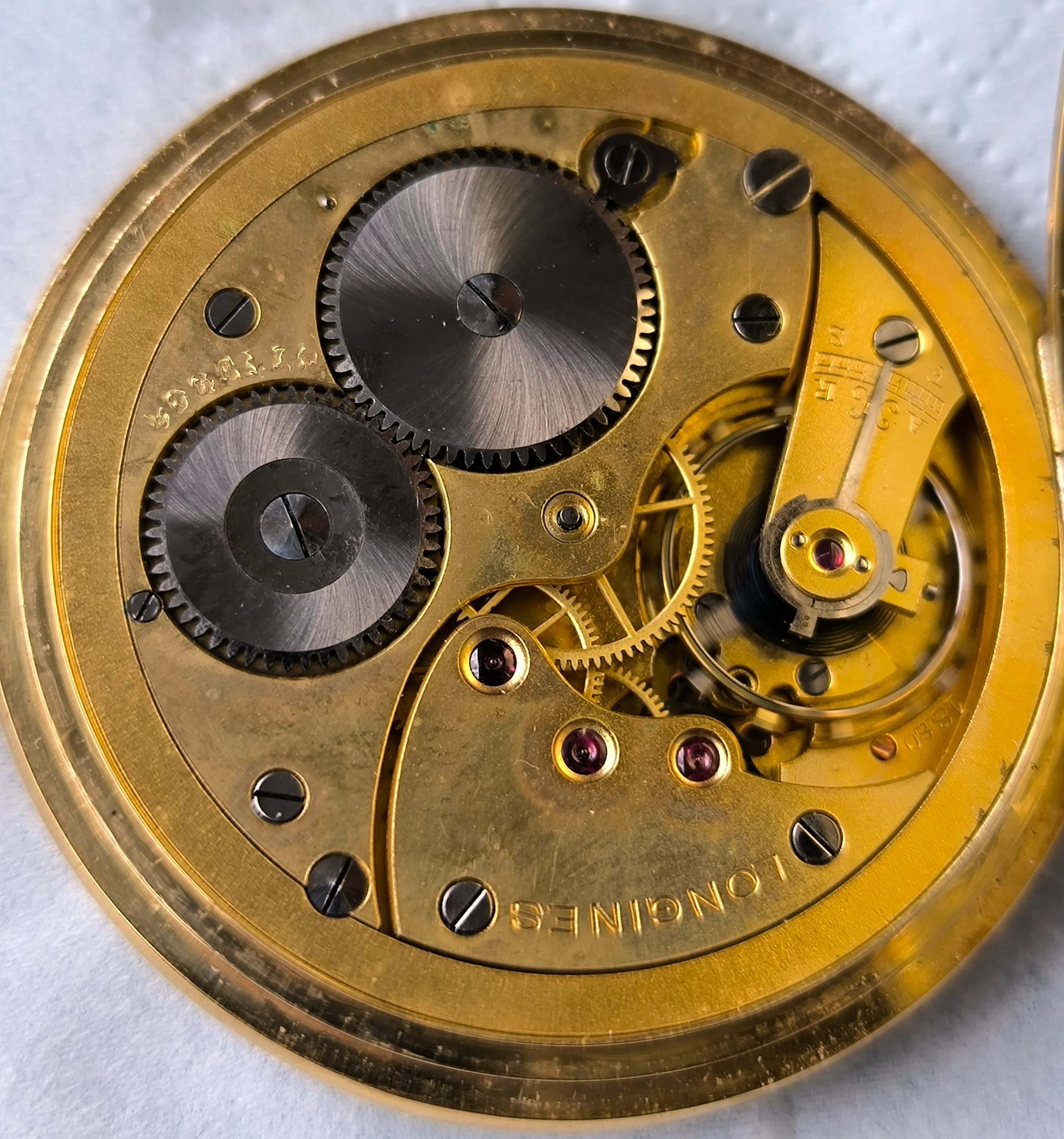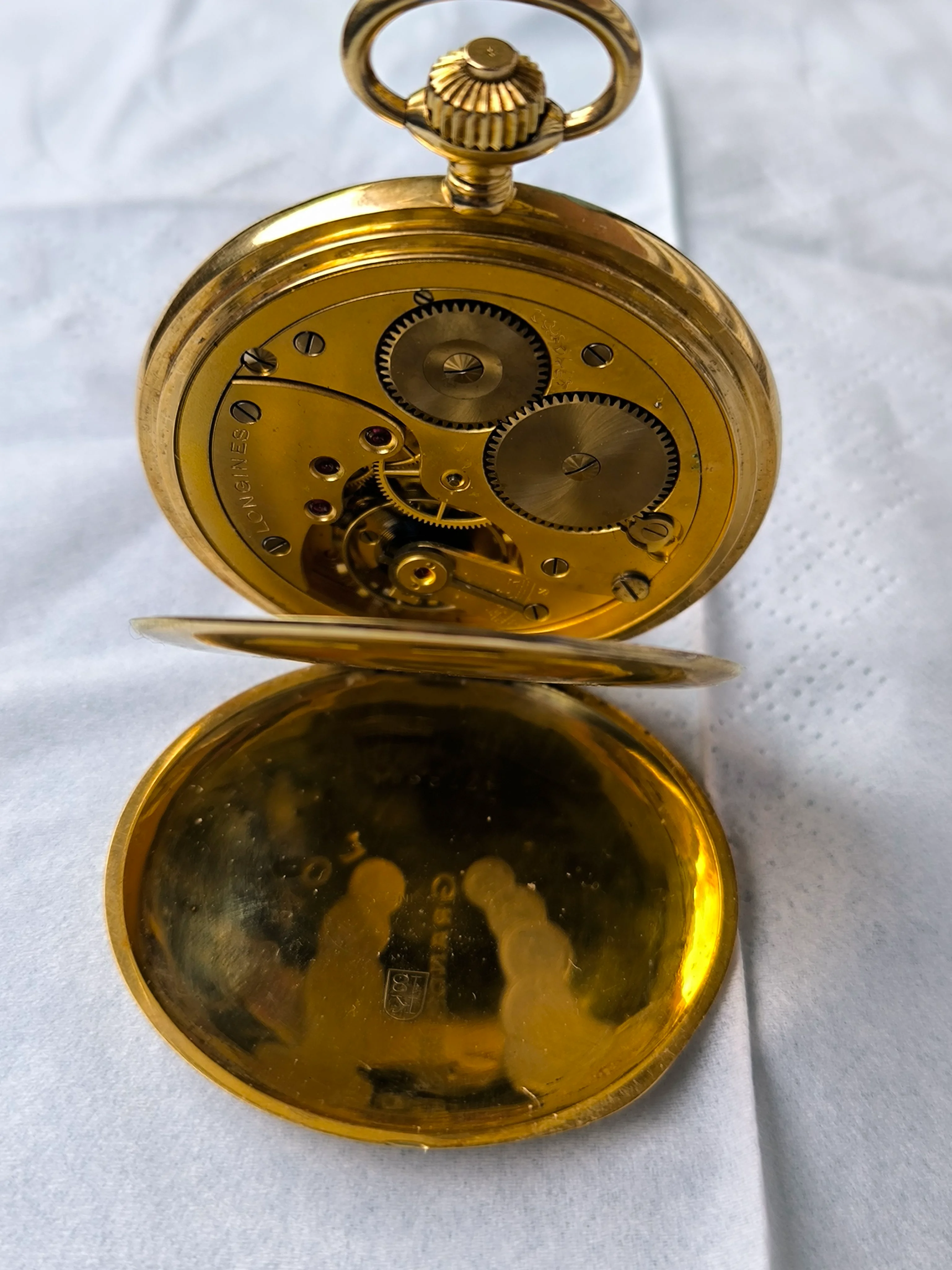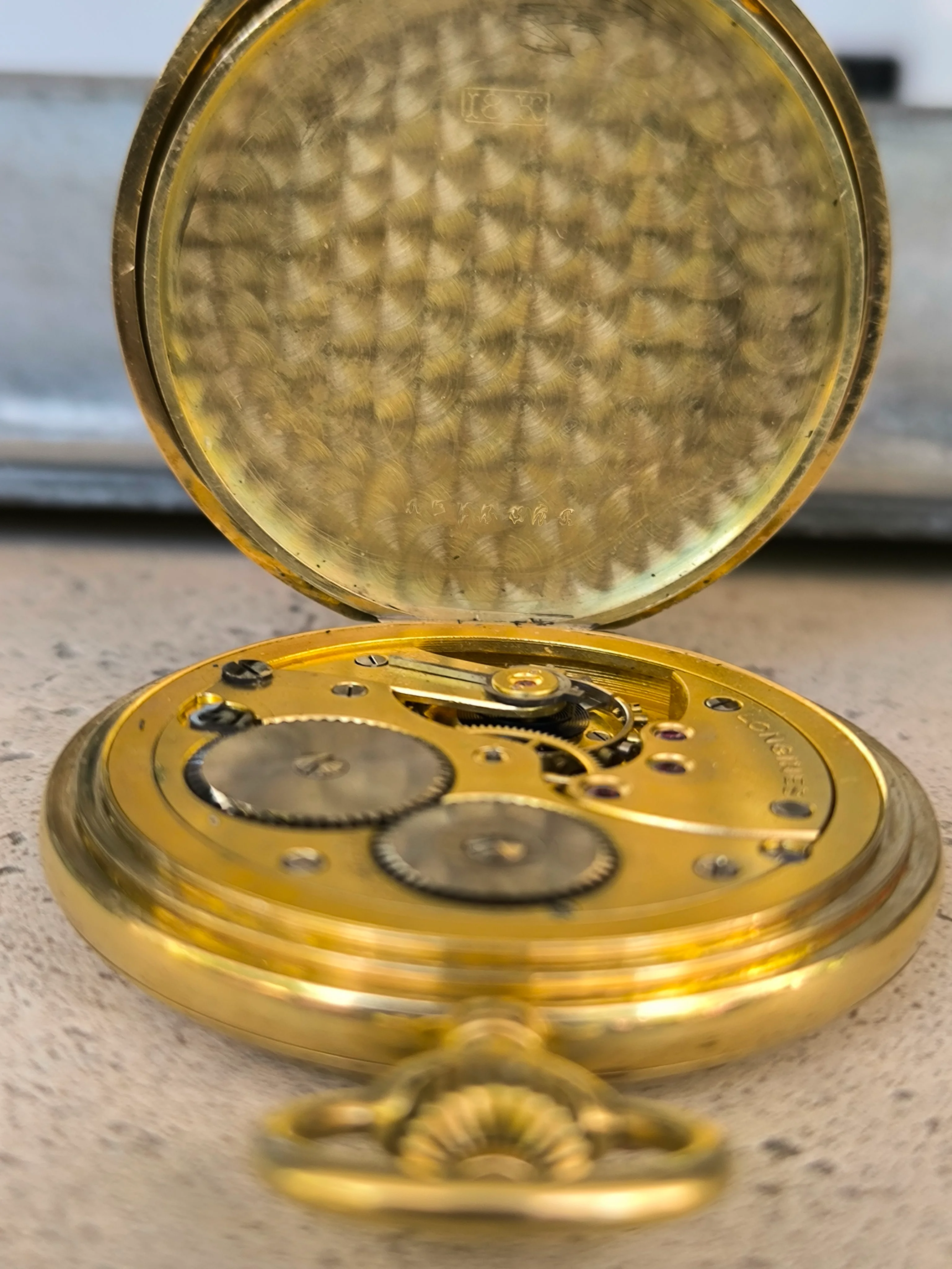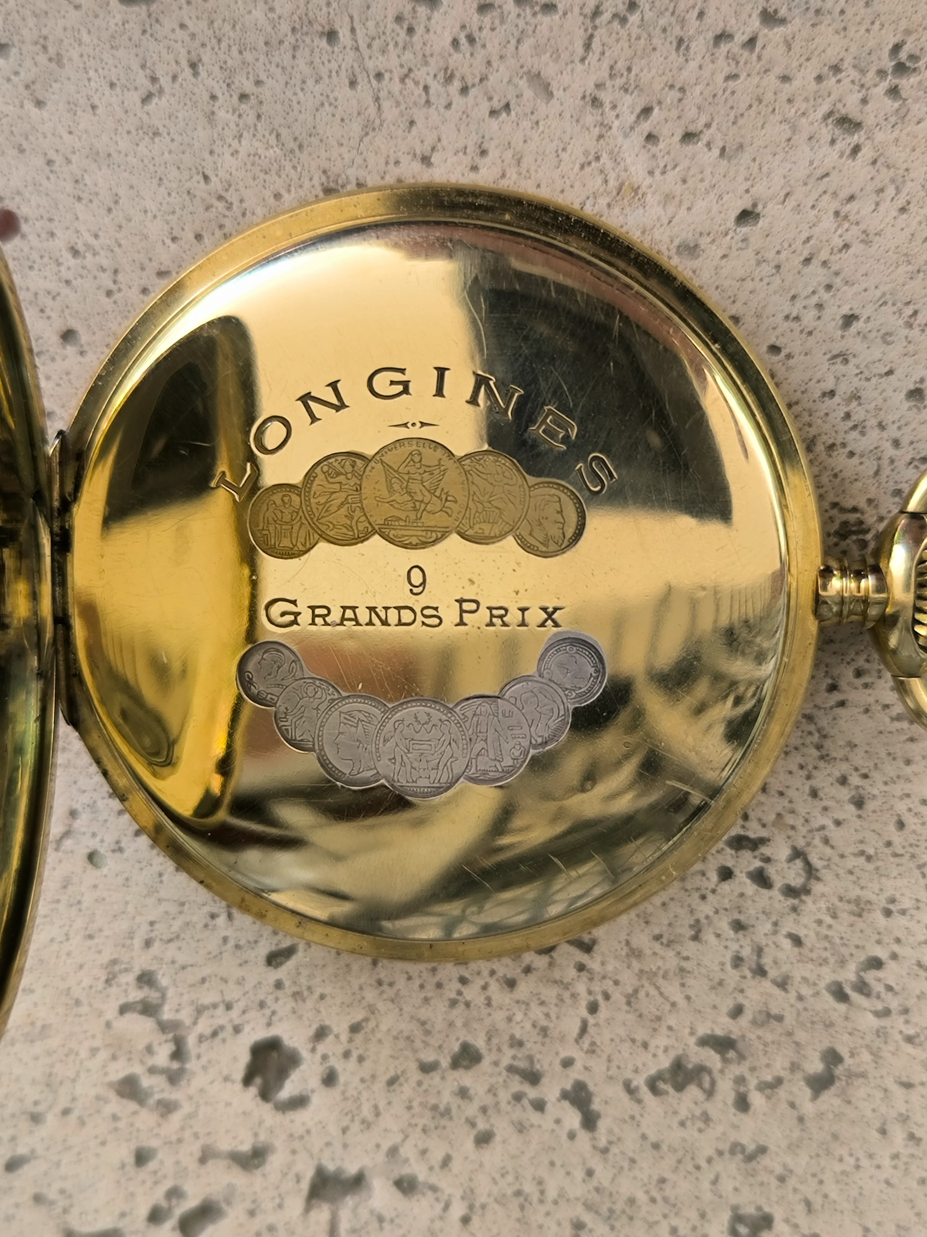 The dust cover is carved with allusions to the 9 “Grand Prix” obtained to date by the firm in various exhibitions and in two colors. The interiors of the front and back covers are engraved with the 18K stamps, framed in an oval, the Longines brand, and the serial number of the case, which coincides with that of the movement. Both the front and back covers are absolutely smooth.