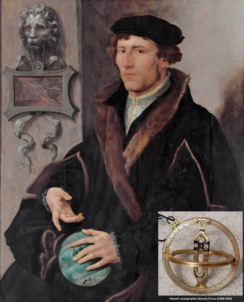 In 1553, Flemish mathematician/cartographer Reinerus Gemma Frisius, who perfected astrolabe & cross-staff astronomical instruments, was the first to describe how an accurate clock could be used to calculate longitude.