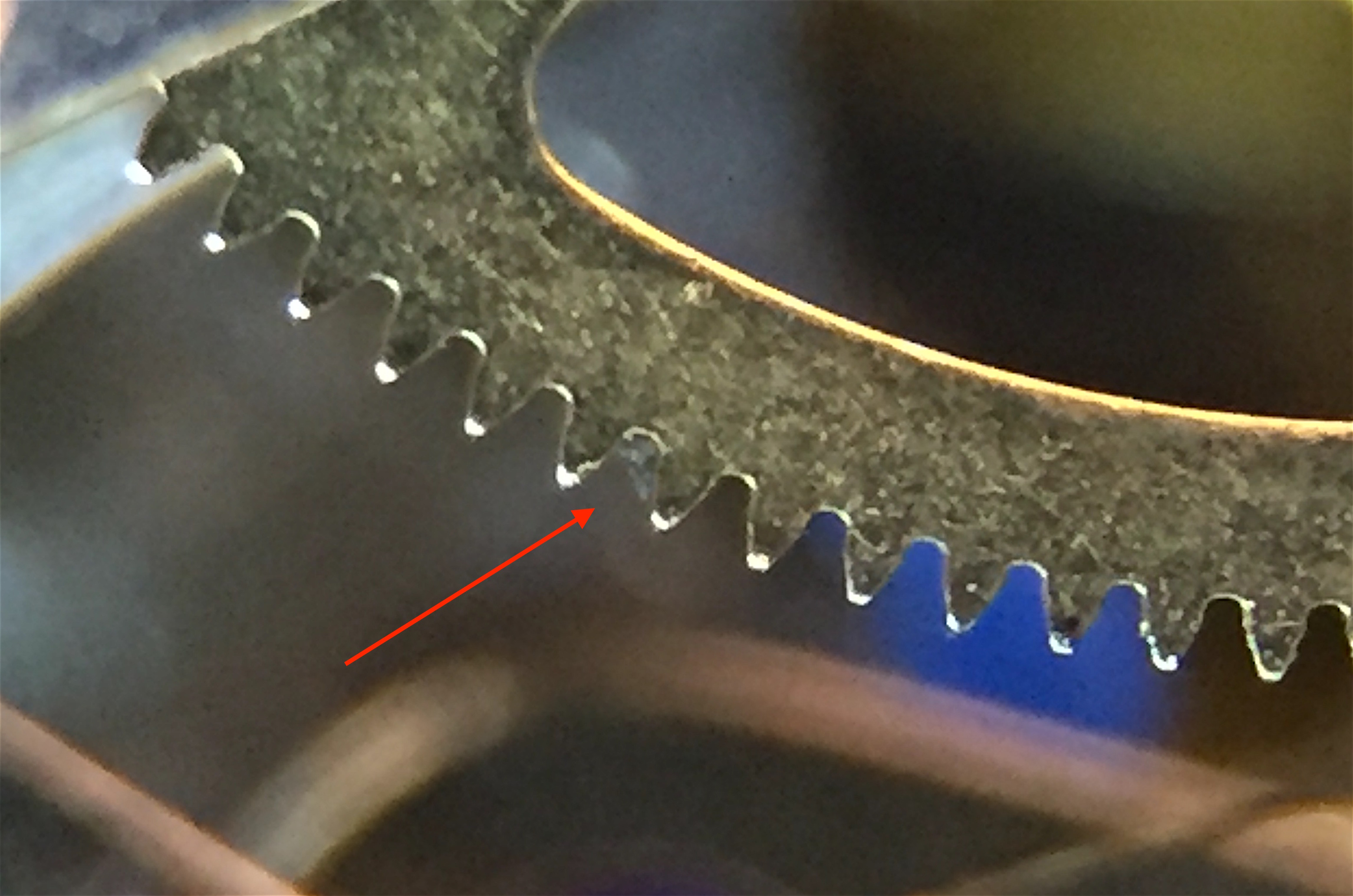 This caused the blocked gap to come up against the pinion of the escape wheel and jam. There was also a lack of power which would have overcome the blockage, and as the watch had never been serviced in its 20 year life I decided to look further.