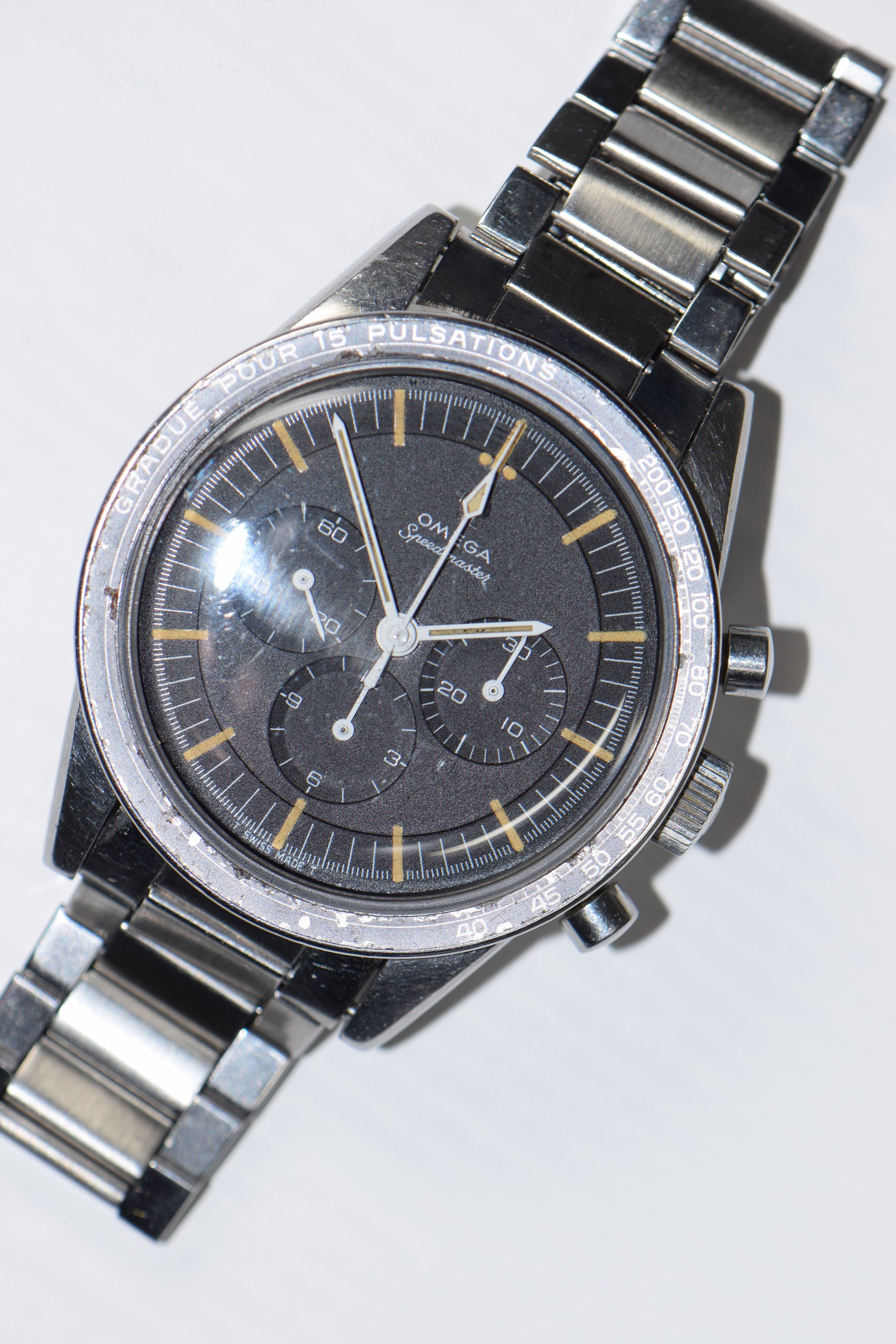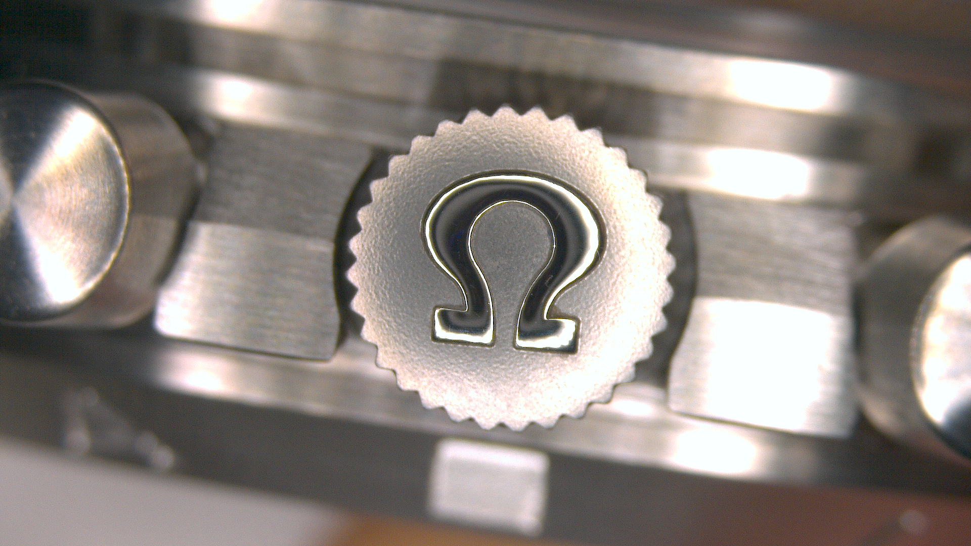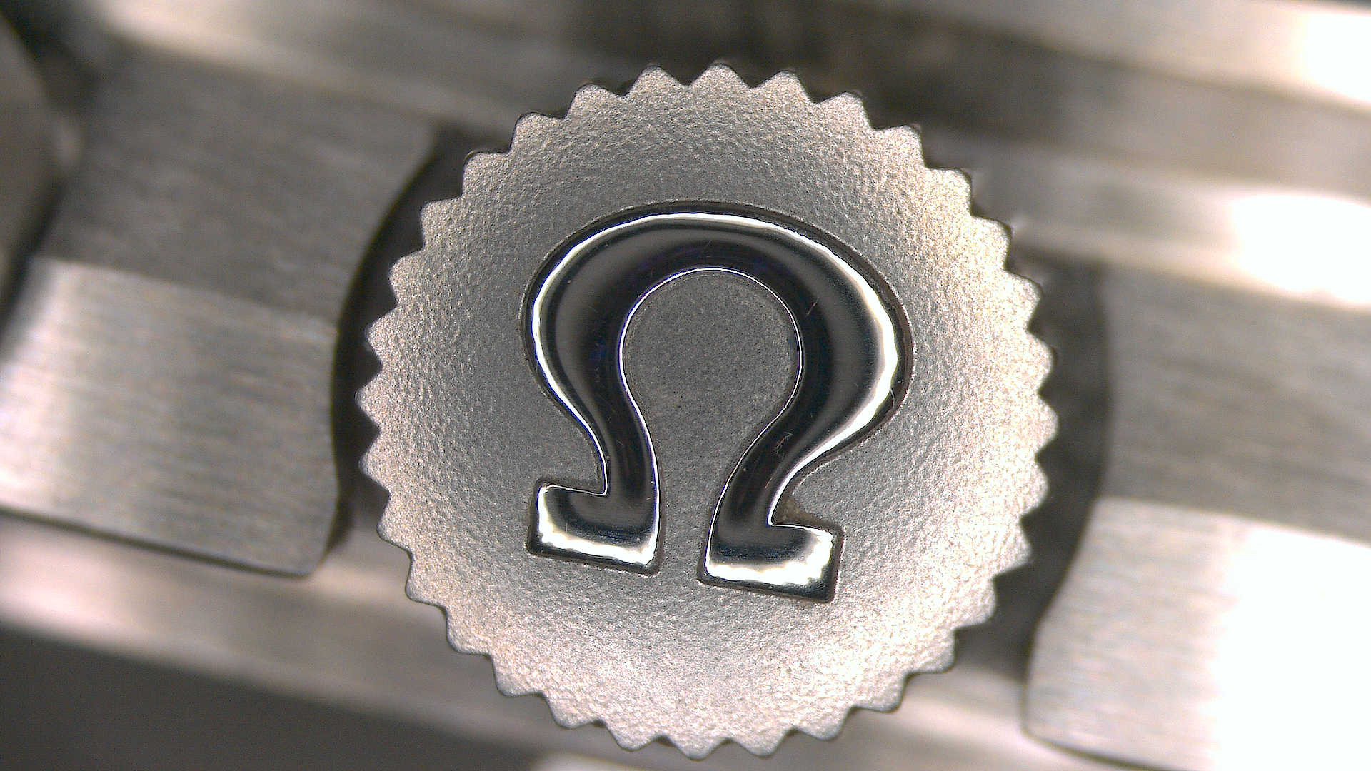 The contrast of the polished old style Omega logo with the crown brushed stainless steel is beautiful :