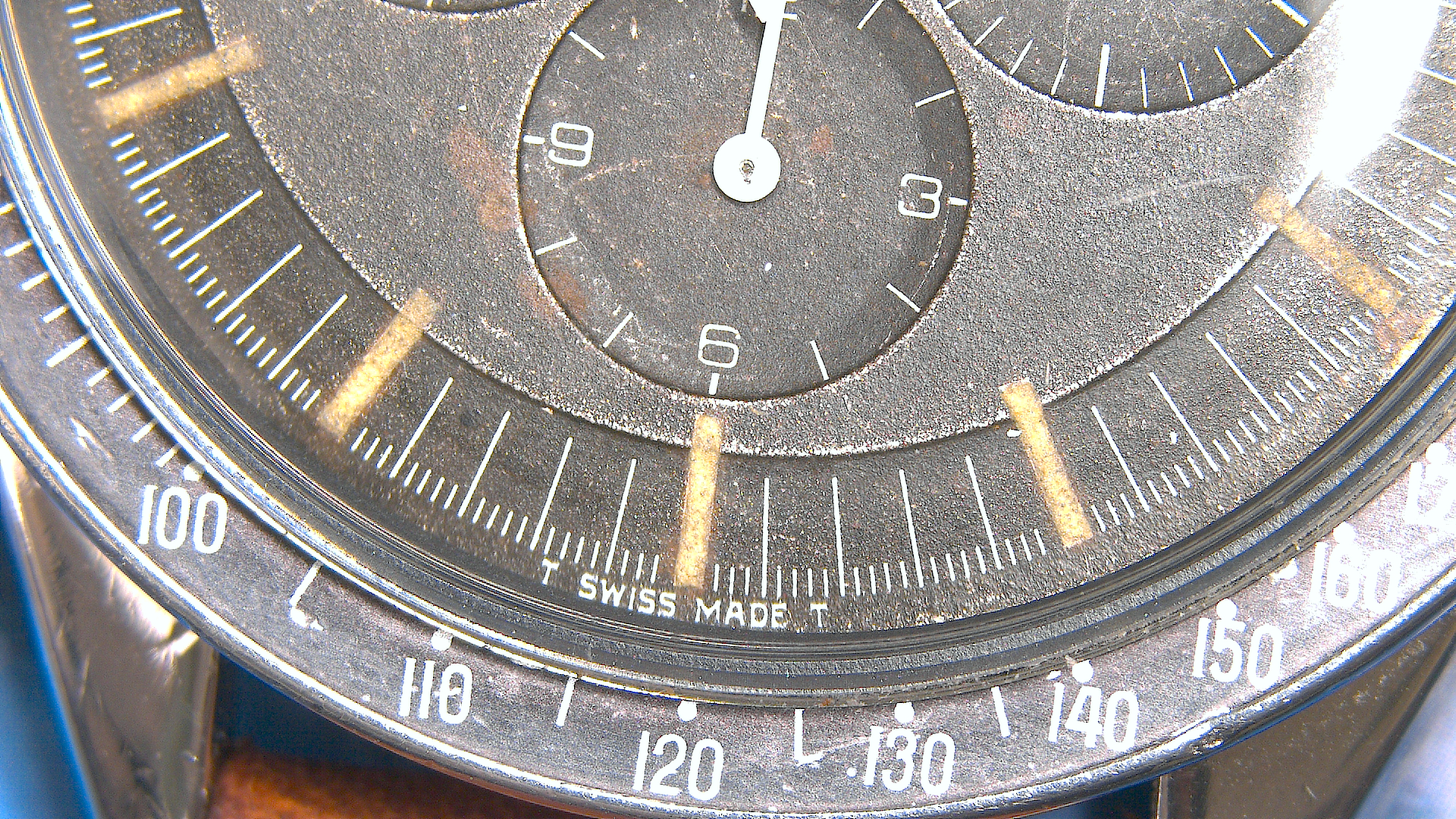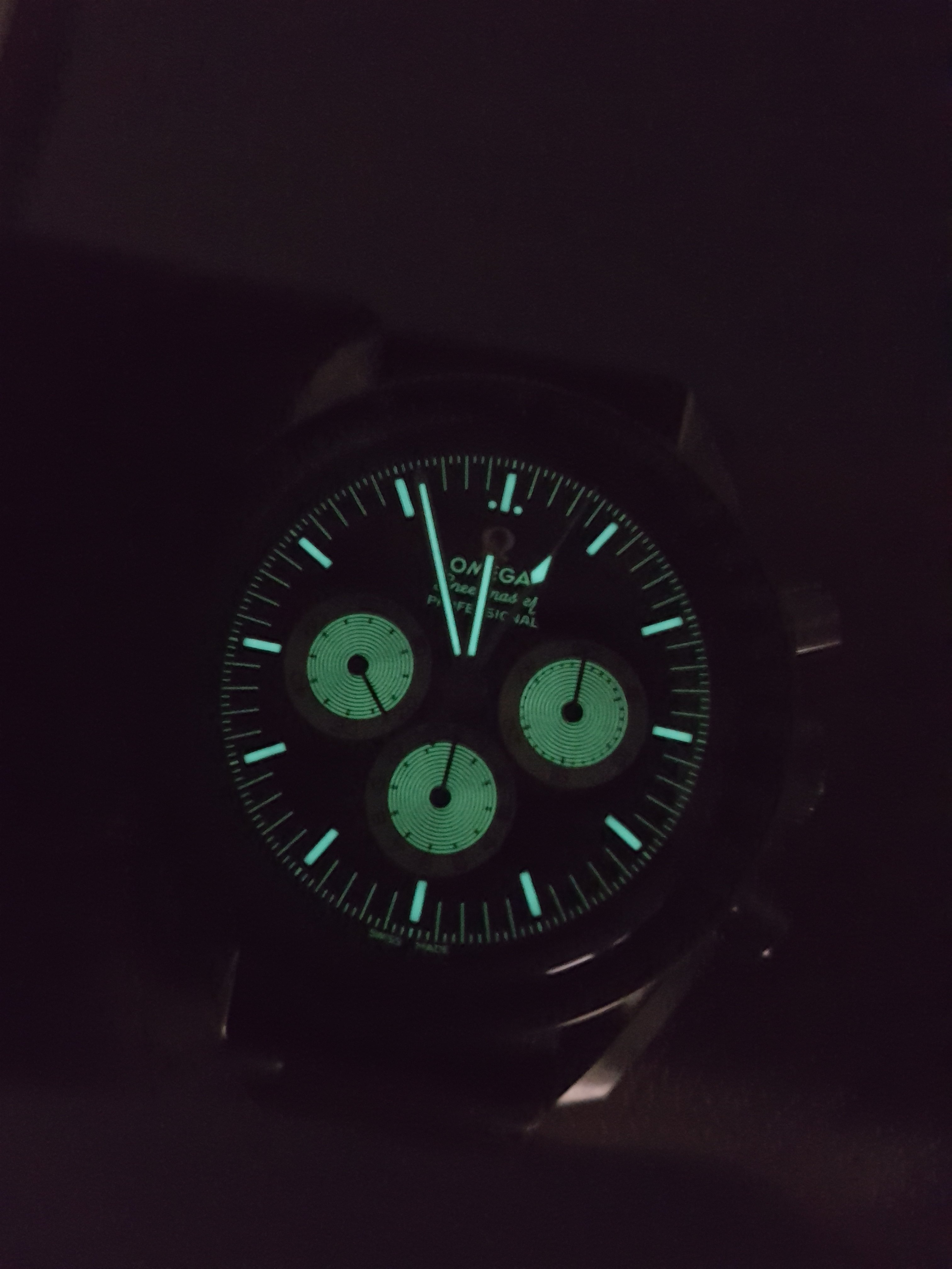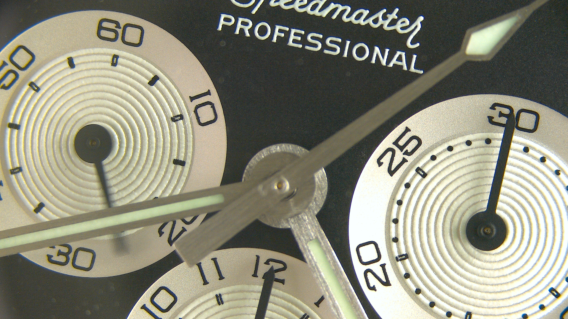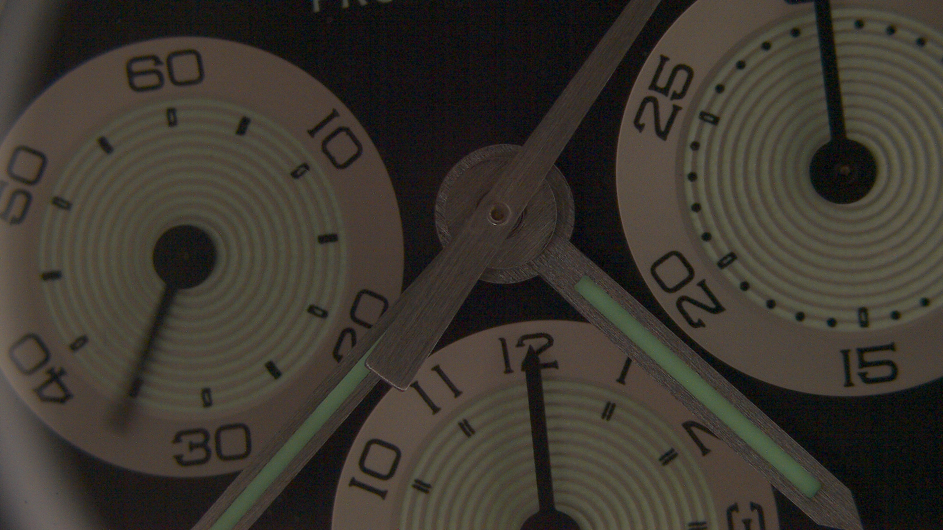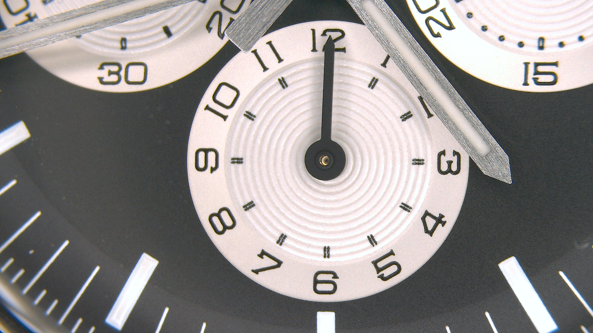 Each subdial hand is slightly off-centered to the printed luminescent concentric circles of the subdials