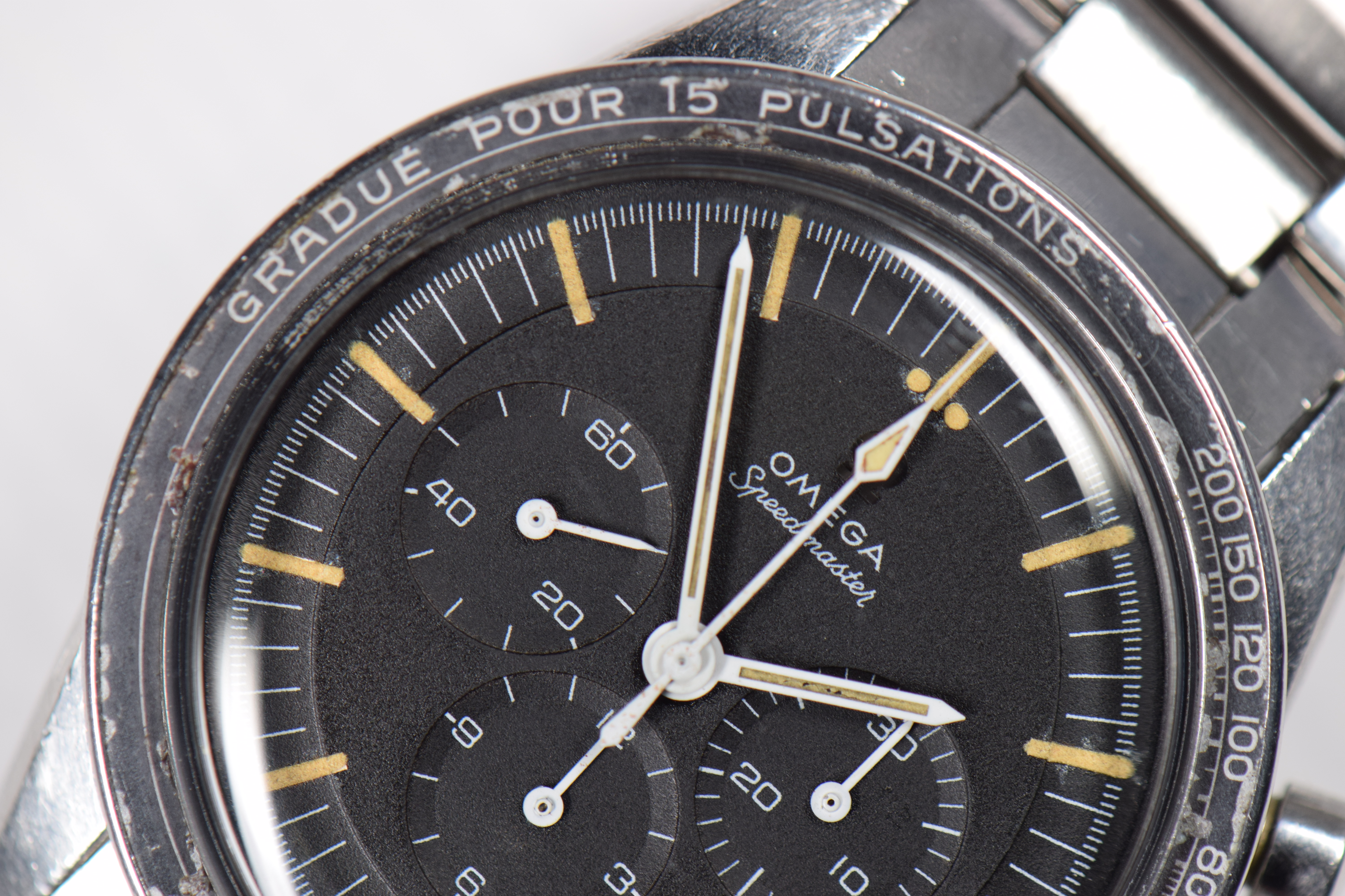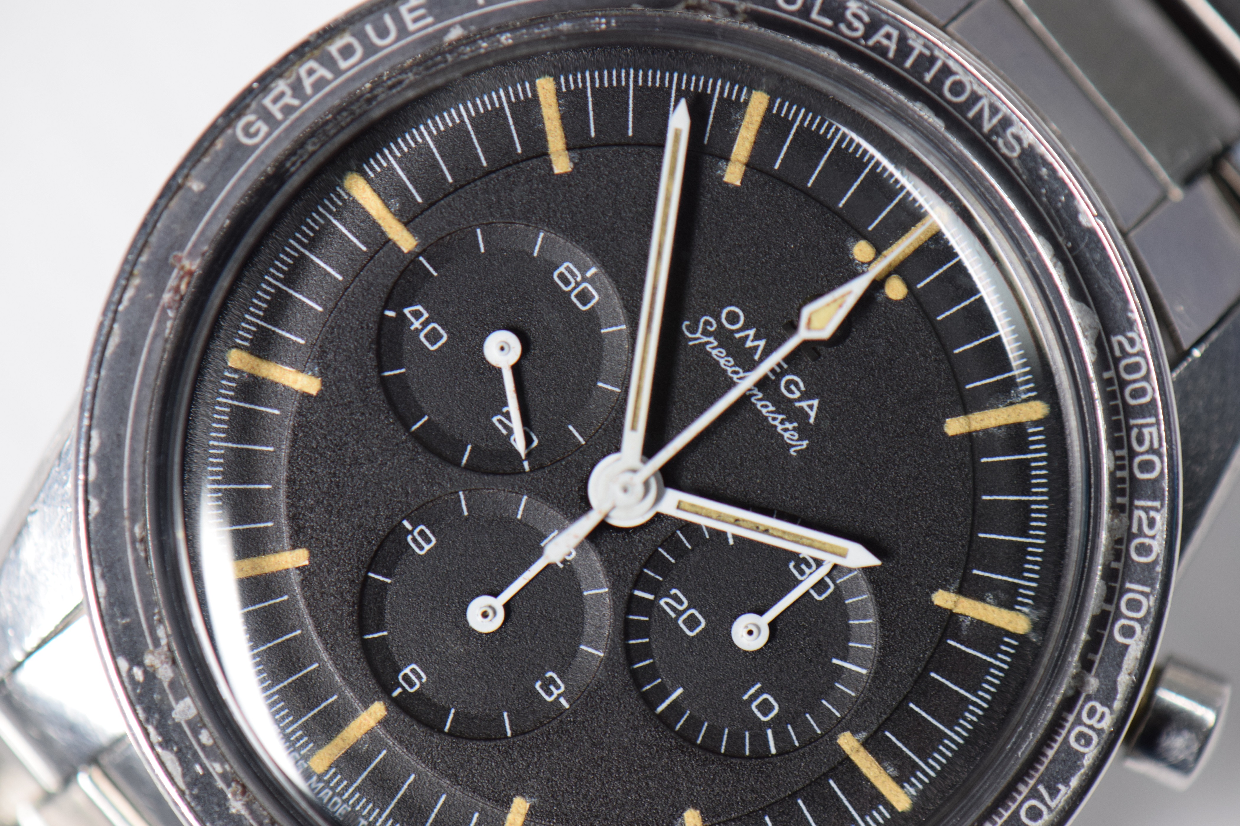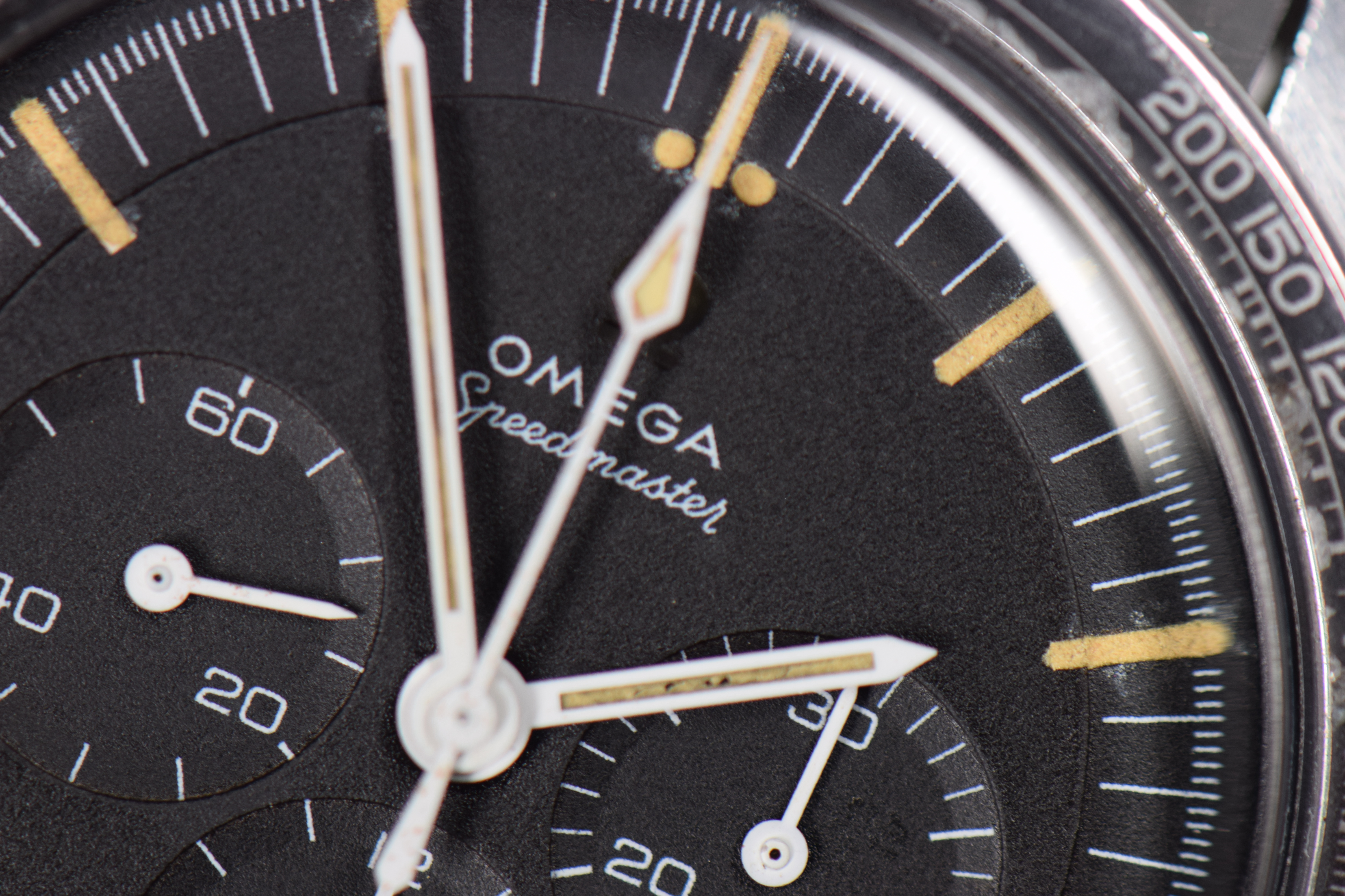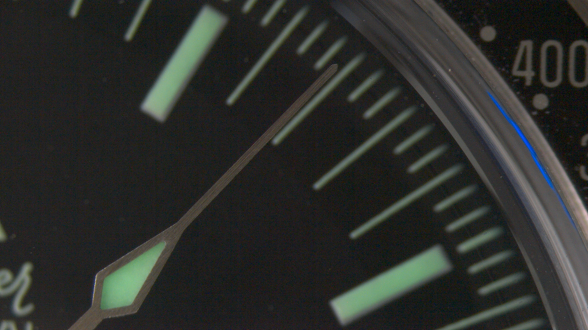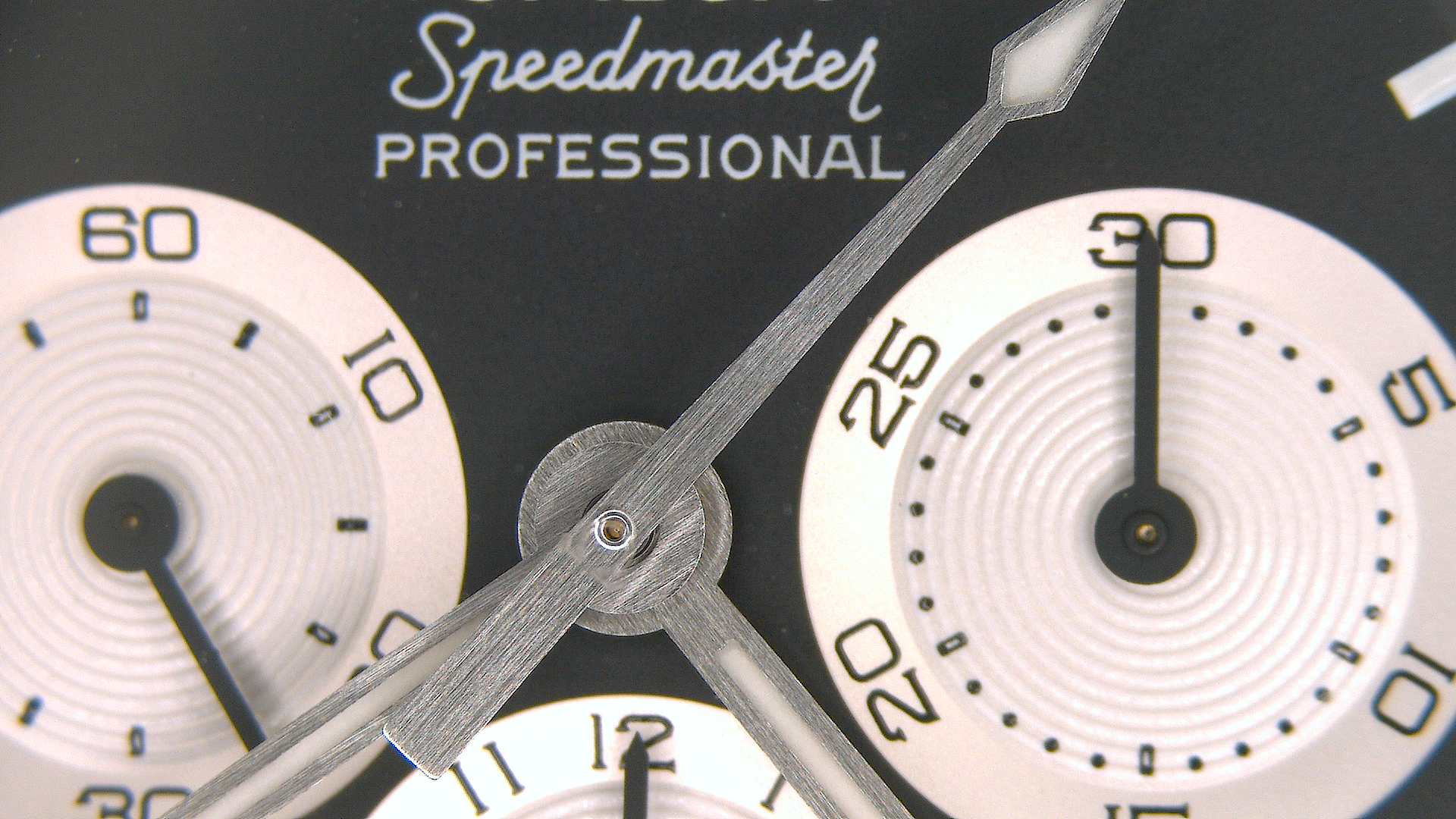 Each subdial hand is slightly off-centered to the printed luminescent concentric circles of the subdials