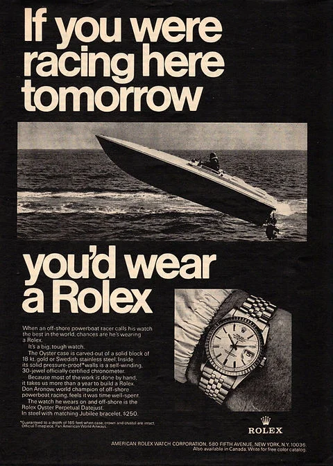 So with these vintage watches, I think preference is driven much more by differentiation in brand marketing image. Like take these two ads from the late 60's which are doing basically the exact same thing in different ways.