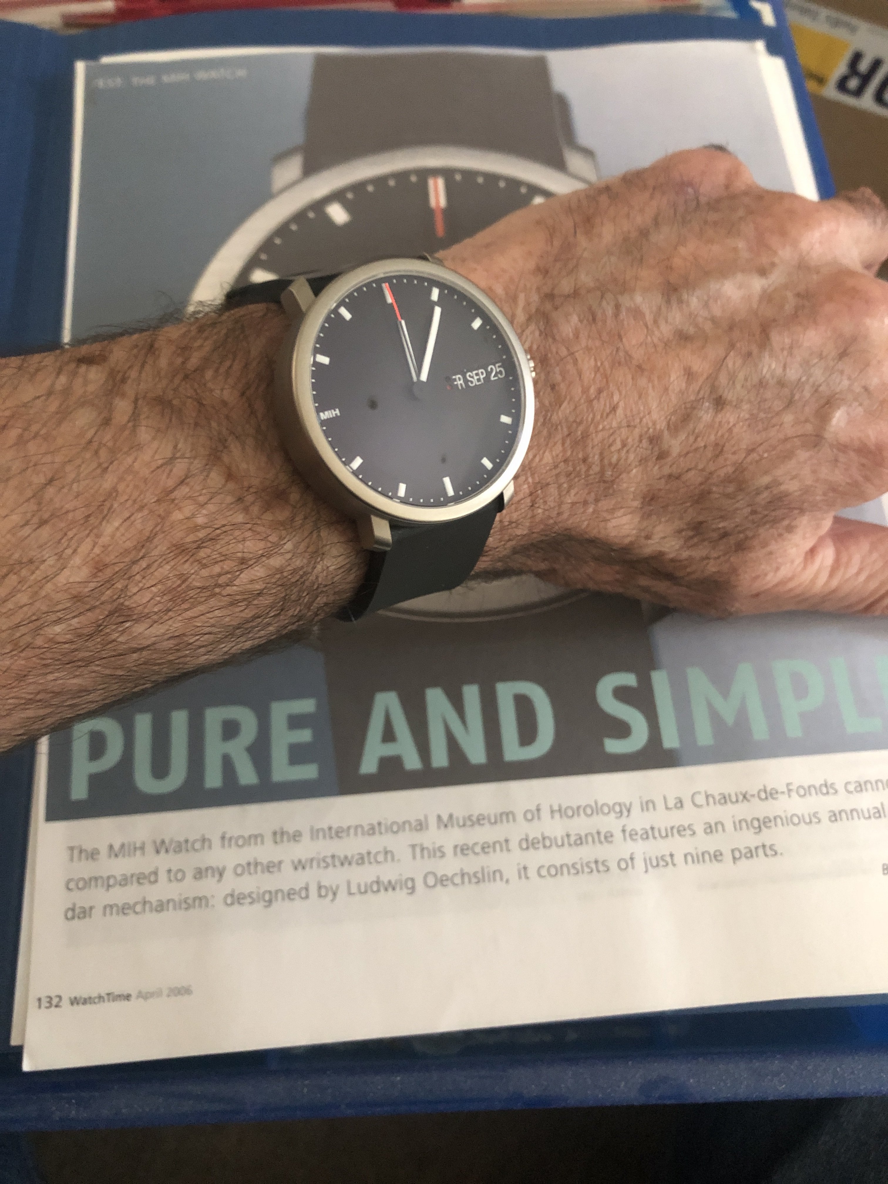see the results here, or visit yourself in person) and the unique nature of the watch and mechanism. I like the Bauhaus minimalism of the dial and case, the versatility of the watch design, and I enjoy knowing that my plain-looking timepiece is actually 300-odd machined parts working in harmony. I also like the extreme durability - the 7750 is every bit as tough as Rolex or ETA, so you can even wear your MIH for sports or swimming. Most annual calendars are dress watches, not everyday wear watches, making this watch once again a unique exception to the rule. Want one? You can find them onsite at the