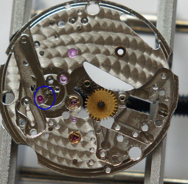 The red circle shows the hammer at the end of the date jumper and the blue circle shows the pin on the date corrector that is driven by contact with the date corrector wheel.