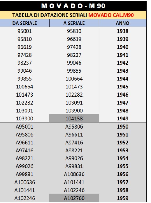 https://www.rescapement.com/blog/for-your-reference-the-movado-fb-95m ). In the piece the attentive author, regarding the seriality of the ref. 9038, at one point he writes verbatim: “The earliest number I have observed is 'A94380' and the latest in this format is '104832.' Note the lack of an A on the second number, at some point around '104300' the letter was dropped".