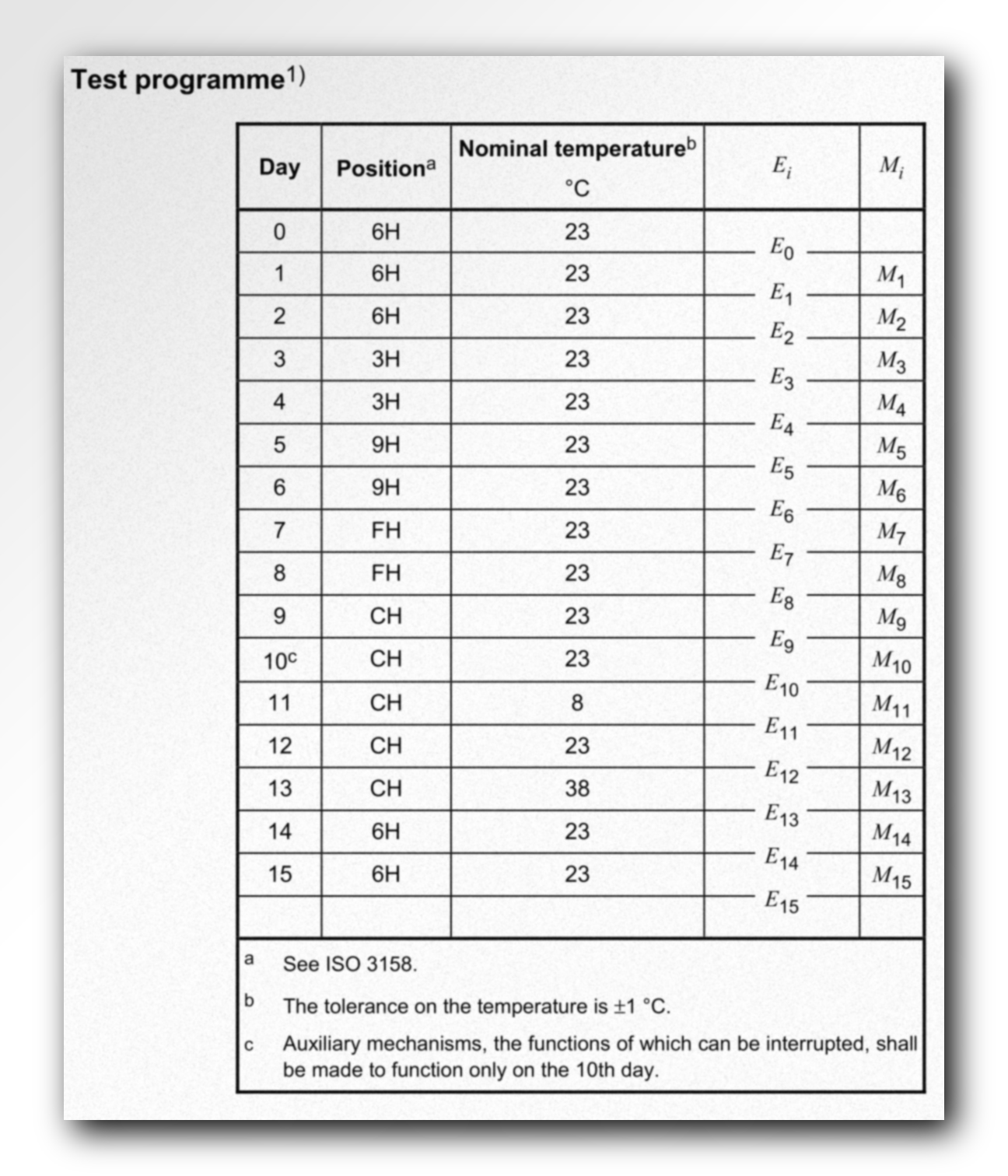 Each movement was tested for actual timing results for two weeks in CH (dial up) and 6H (crown left) positions. These two positions were prioritized for two reasons. First, ISO 3159:2009 emphasizes the rates and differences between these positions in the minimum requirement calculations and number of days tested in these positions compared with the other positions. This meant these positions needed to be as close as possible in their rate. Second, when CH and 6H rates are adjusted to be equal the other 3-positions were reined in to be within +/- 2 s/d, having a 5-position rate delta of around 4 s/d. Confirmation of 5-postiion average rate and rate delta was performed every 4-5 days during this process using the pretest protocol. Achieving a 4 s/d tolerance provided for a daily average rate that was well within ISO 3159:2009 requirements.