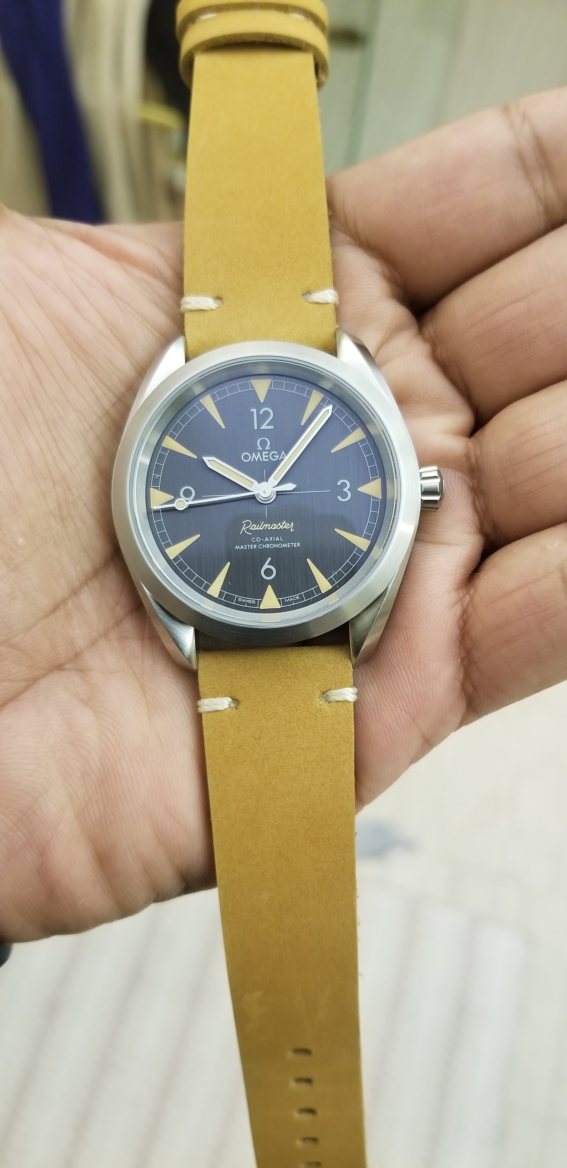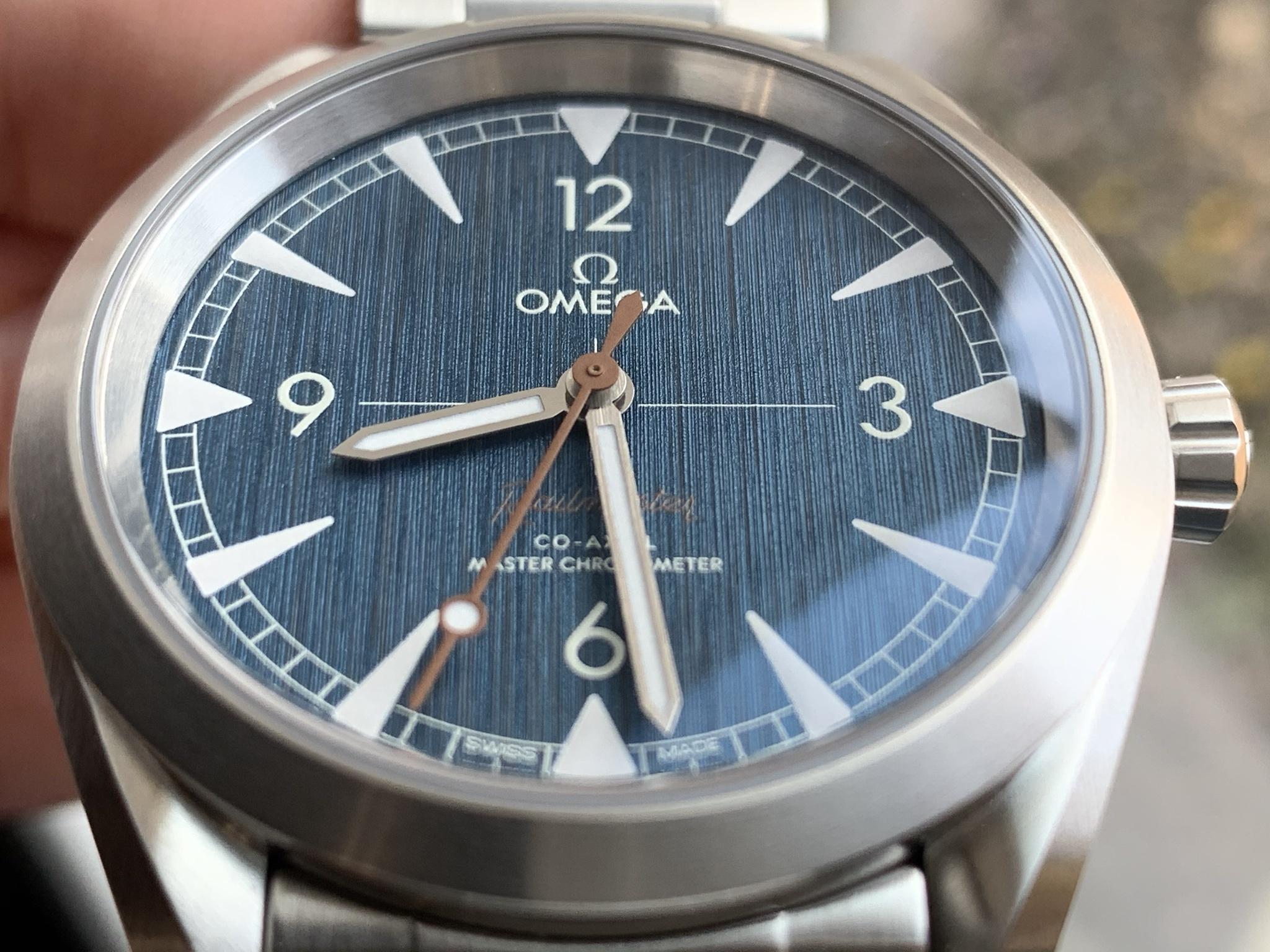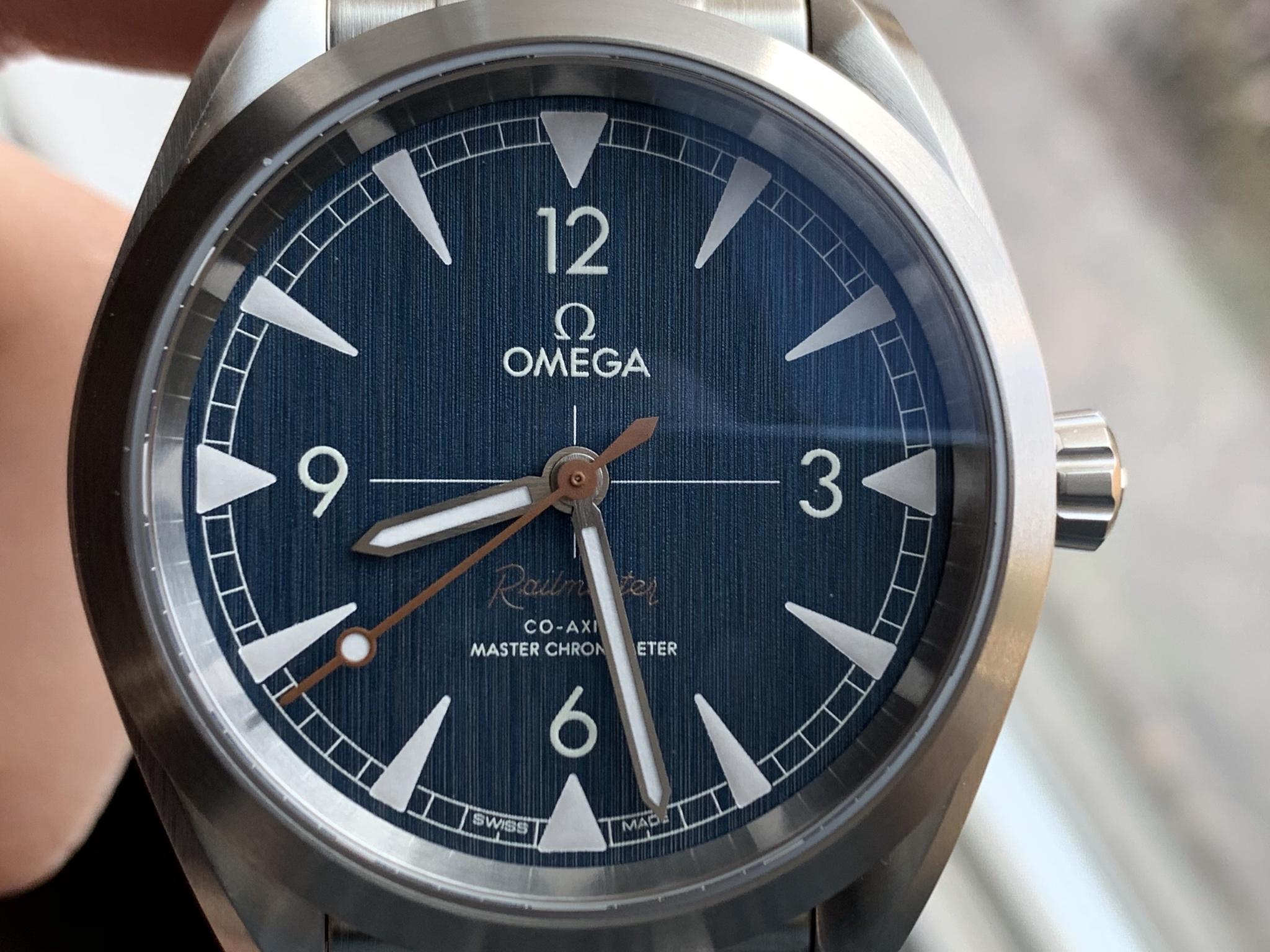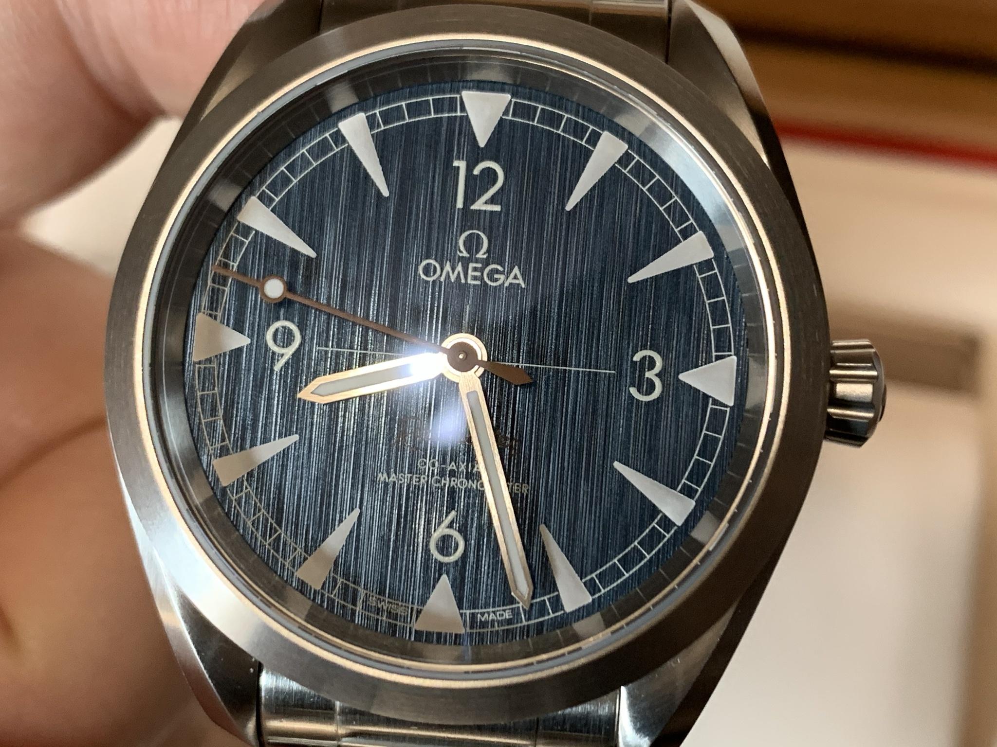 ·I got in my first Omega watch this past week, the blue dial Railmaster. Certainly, it's one of the more divisive models in the current Omega lineup, but personally, I love it. When I first saw the Railmaster with the blue dial, it drew me in a little more than the black and silver offerings. I think the choice to go with white Super LumiNova was the way to go. The "vintage" lume color suits the 1957 trilogy more in my opinion, but I admit it adds a little extra contrast on the neutral colored dials. Sadly I wasn't able to see and try on the piece in person before purchasing one. None of the Omega ADs within a 6+ hour one way driving distance actively stock the watch, so it would have to be ordered directly through Omega, with an unknown wait time, then I could come in whenever it arrived. I decided going used was the better bet, and I was able to find one for the price I wanted to pay, complete with boxes and papers. Not being able to see it firsthand, I wasn't 100% sure that I would be smitten with it, but getting it in and spending some time with it, my doubts are gone.