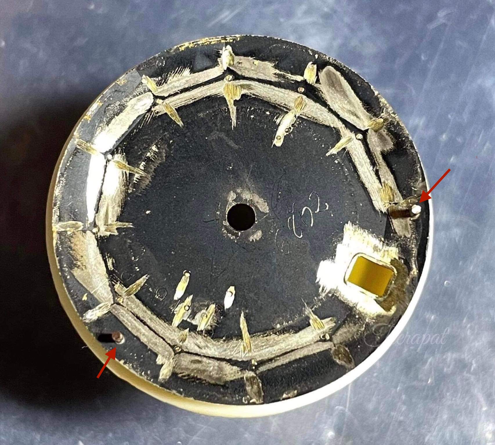 For the uncommon watch, I prefer to see the backside of the dial to prove that it’s correct and the dial’s legs (marked by red arrows) still present.