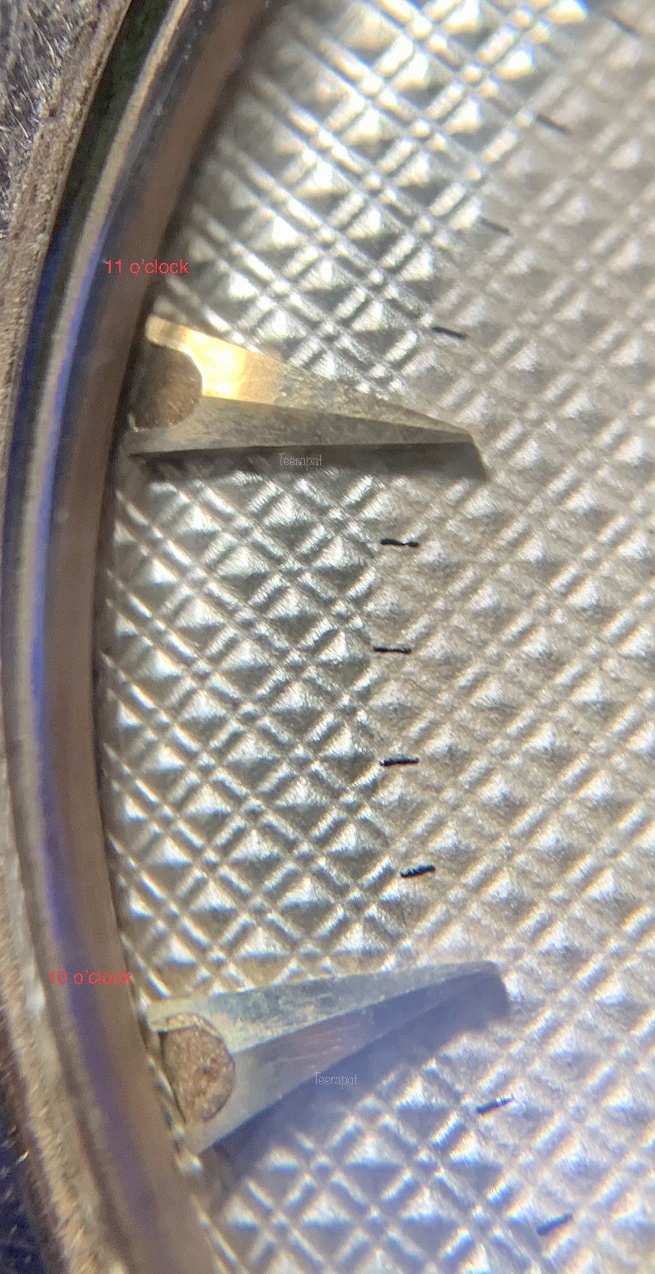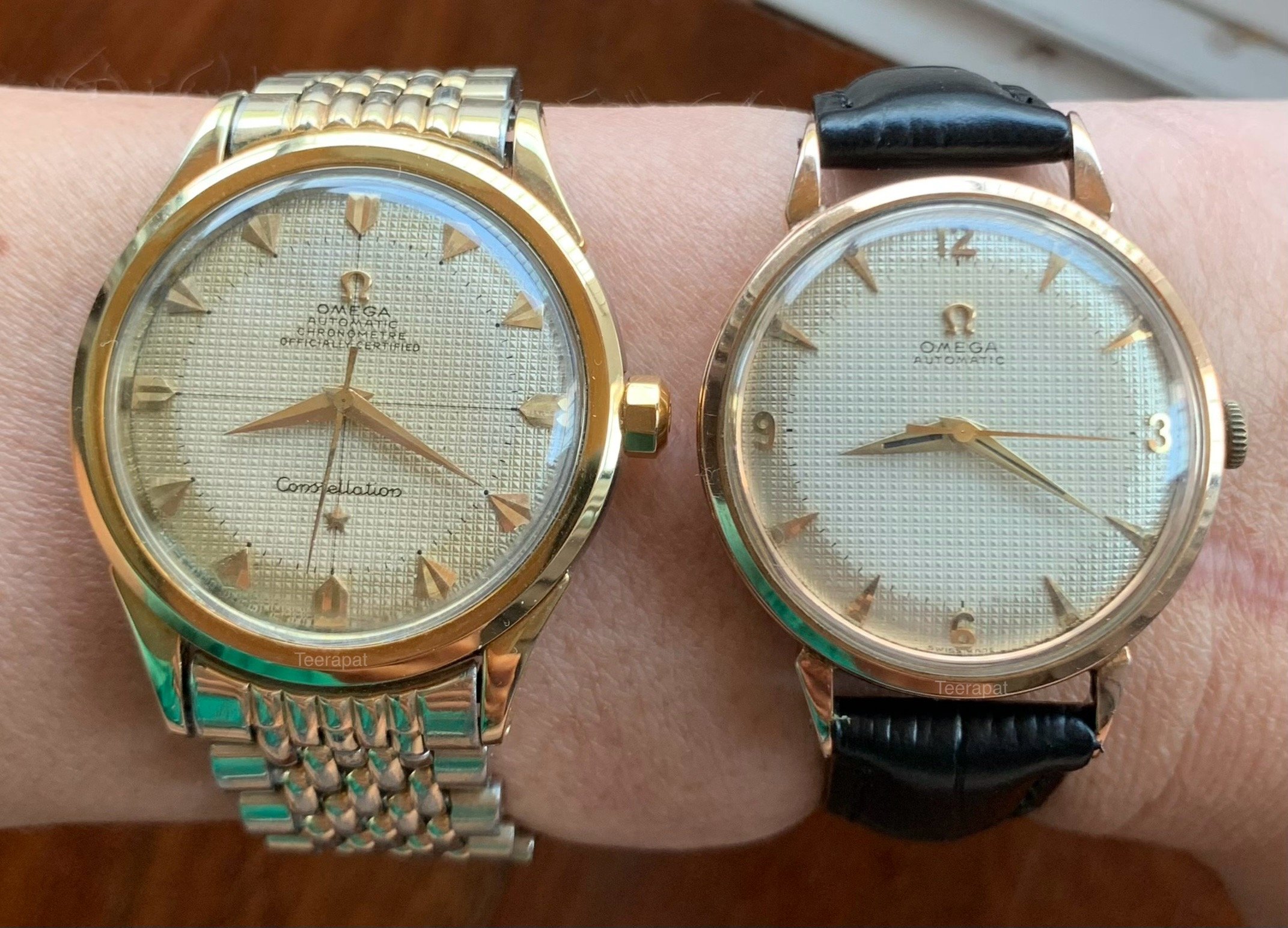 Case: “9CT Australian case” with diameter 32.5 mm (excluding the crown) and 33.9 mm (including the current crown). I believe it might be pink gold case? please see the wrist shot compared with my yellow gold constellation. I’m not familiar with this case, but I think the case has been polished at some stage in their life.