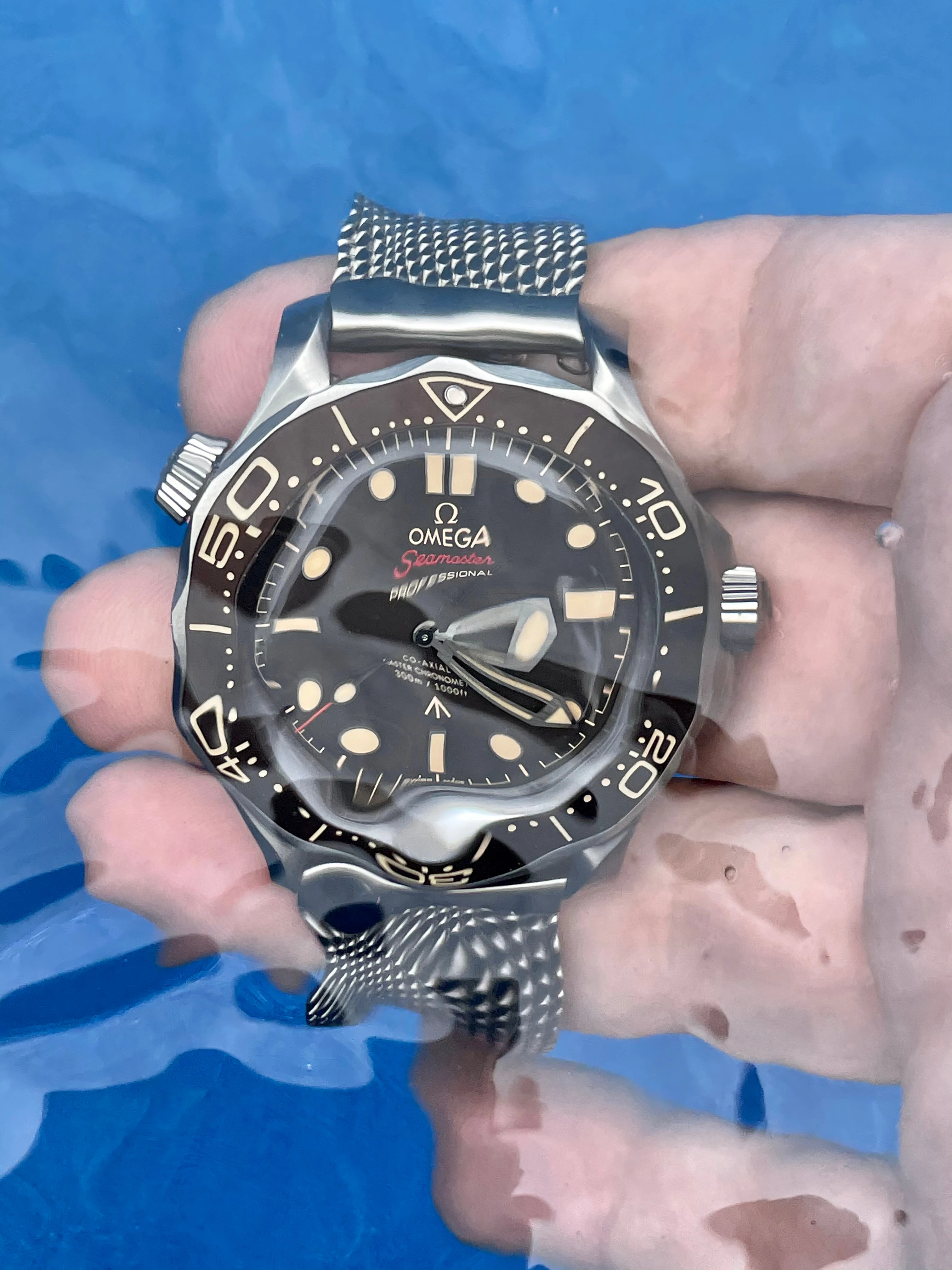 The mesh bracelet is of course more comfortable then any oyster, multilink or beads of rice bracelet, simply as it drapes more around the wrist. The fact that it drops vertically form the lugs also helps. The effective links are around 1-1.5mm, compared to say a small jubilee at about 3mm. Confusingly, or usefully, Omega provides three sizes of titanium bracelet. I ended up buying the small bracelet. I have a 6.75 “ wrist, and in “summer sweaty wrist expansion” mode I am on the second last hole, which is perfect. The standard bracelet also fitted, coincidentally on the second smallest position. We all demand adjustable clasps these days, but a strap has always had the best adjustable system, just by changing holes. The metal mesh bracelet combines the benefits of both the strap and bracelet worlds.