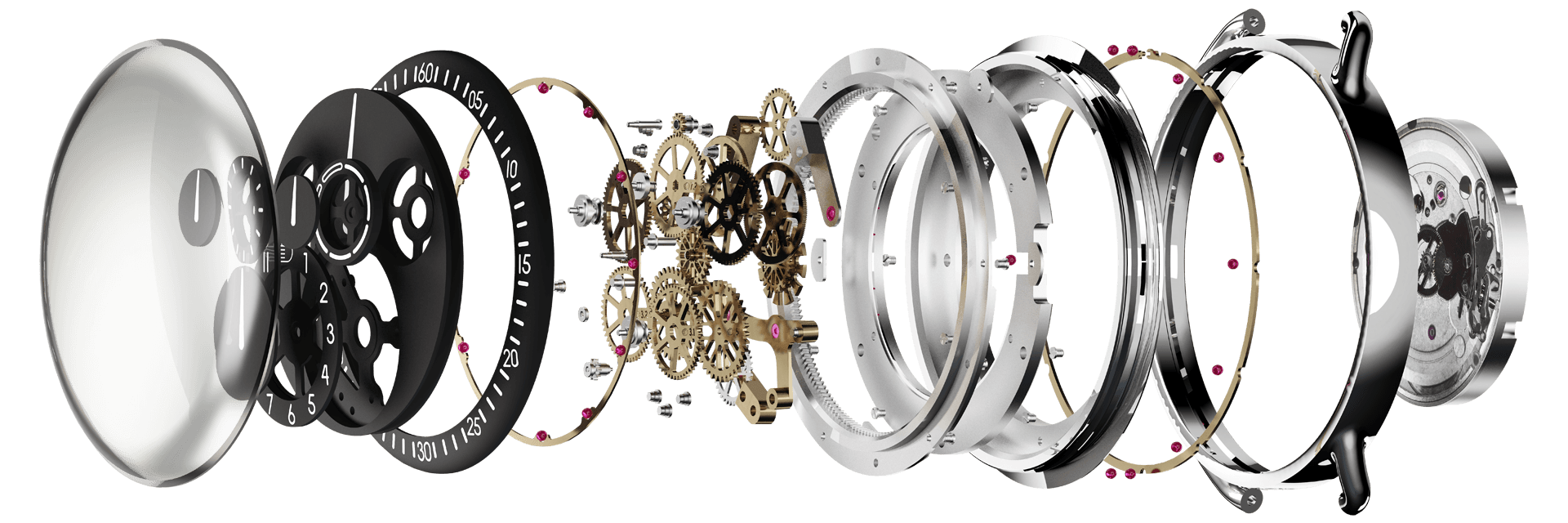 - All of their watches make use of an ETA movement as a base caliber. Given the price point, this can and does put some people off. The brand itself and it's devotees note that the ETA movement is heavily modified and the modular ROCS system on top is composed of 107 additional parts. Here is an exploded image of the watch and all its parts: