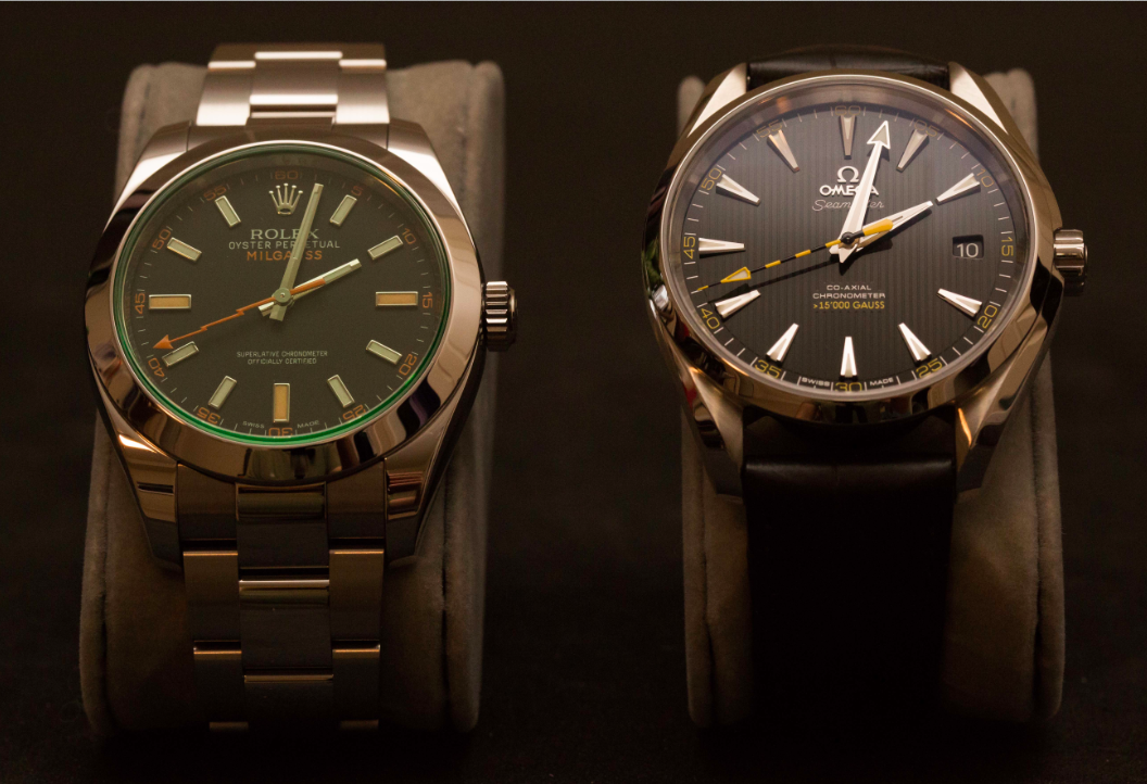 路I recently bought my New Aqua Terra 15000 Gauss to go with my Rolex Milgauss and what a beauty it is. it sure dose complement my Milgauss. As far as technical goes i give it All to Omega, What a great technology. Omega is really playing there cards right. but lets not forget that Rolex was the first and even though its Mil= 1000 gauss its a very special piece. I do love them both equally and as far as comfort i would say Omega is more comfortable only because Rolex being top heavy but i would also say that Rolex Oyster bracelet is by far more comfortable. They both have a very unique second hand and i love it, with Rolex having a lightning bolt and Omegas ( Warning / caution ) or bumble bee. hope you enjoy.