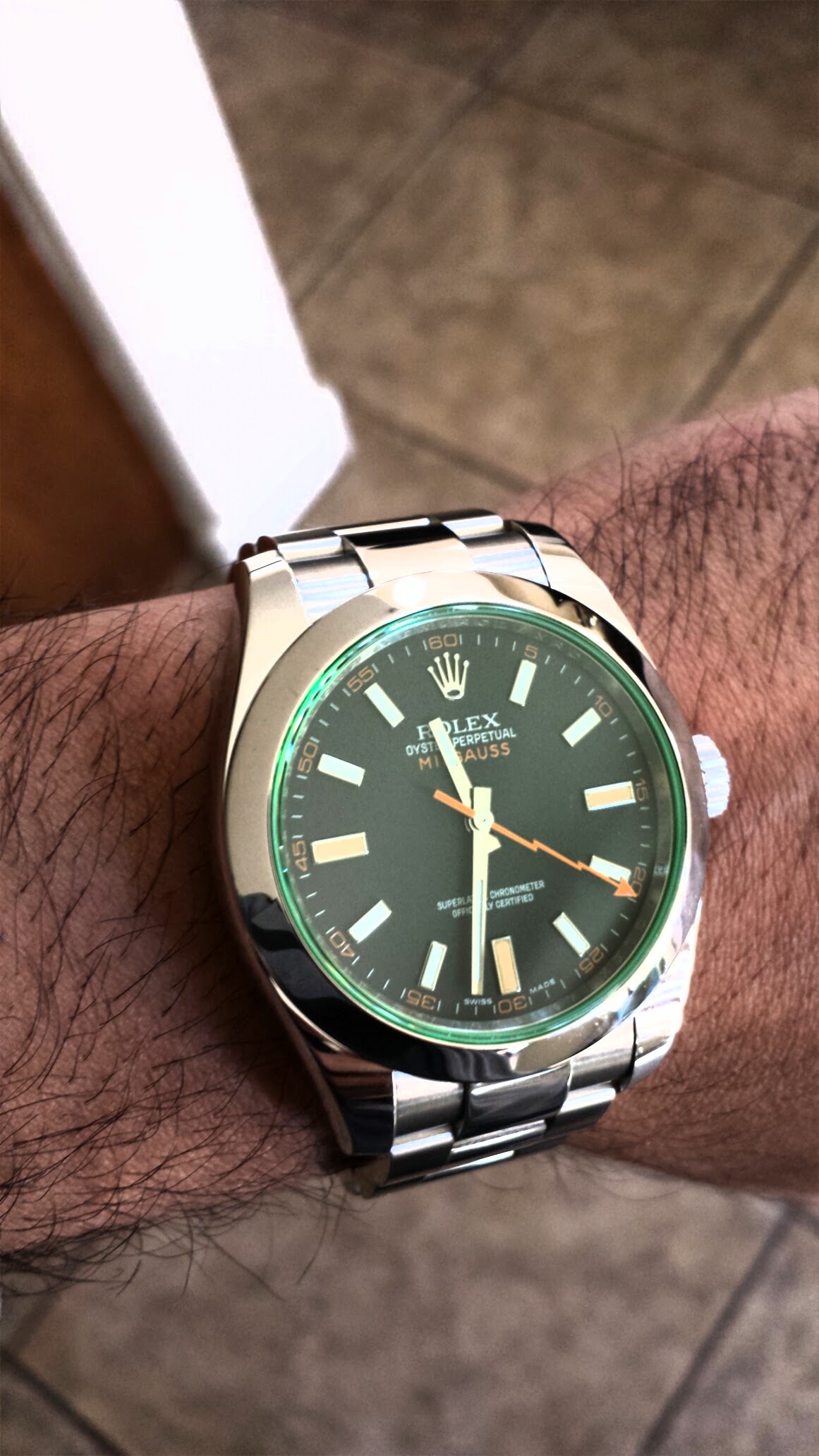 I actually kinda want a Milgauss... Green crystal, orange numerals, baton indices. Just need to try it on and make sure the 40mm isn't too small for me.
