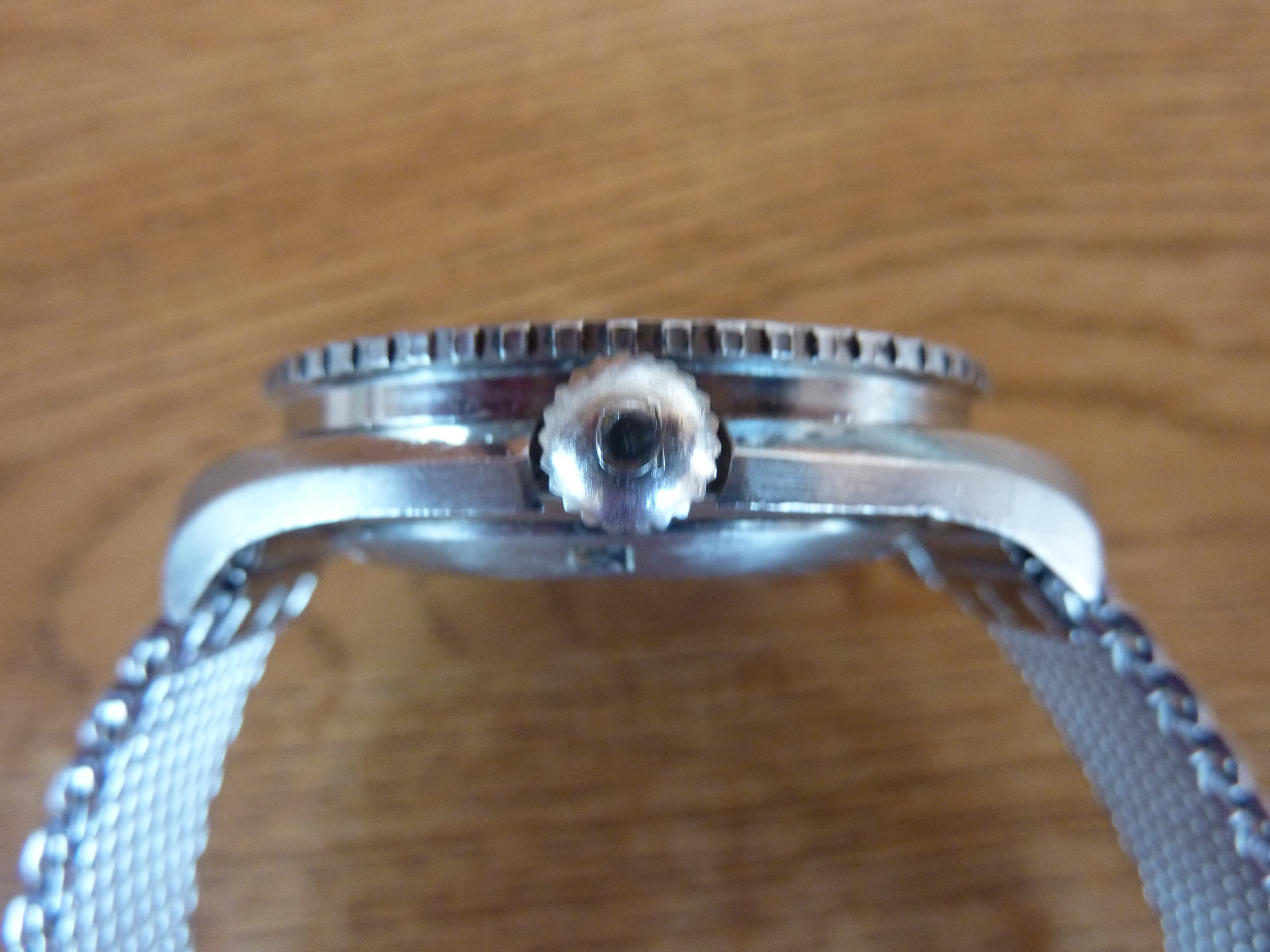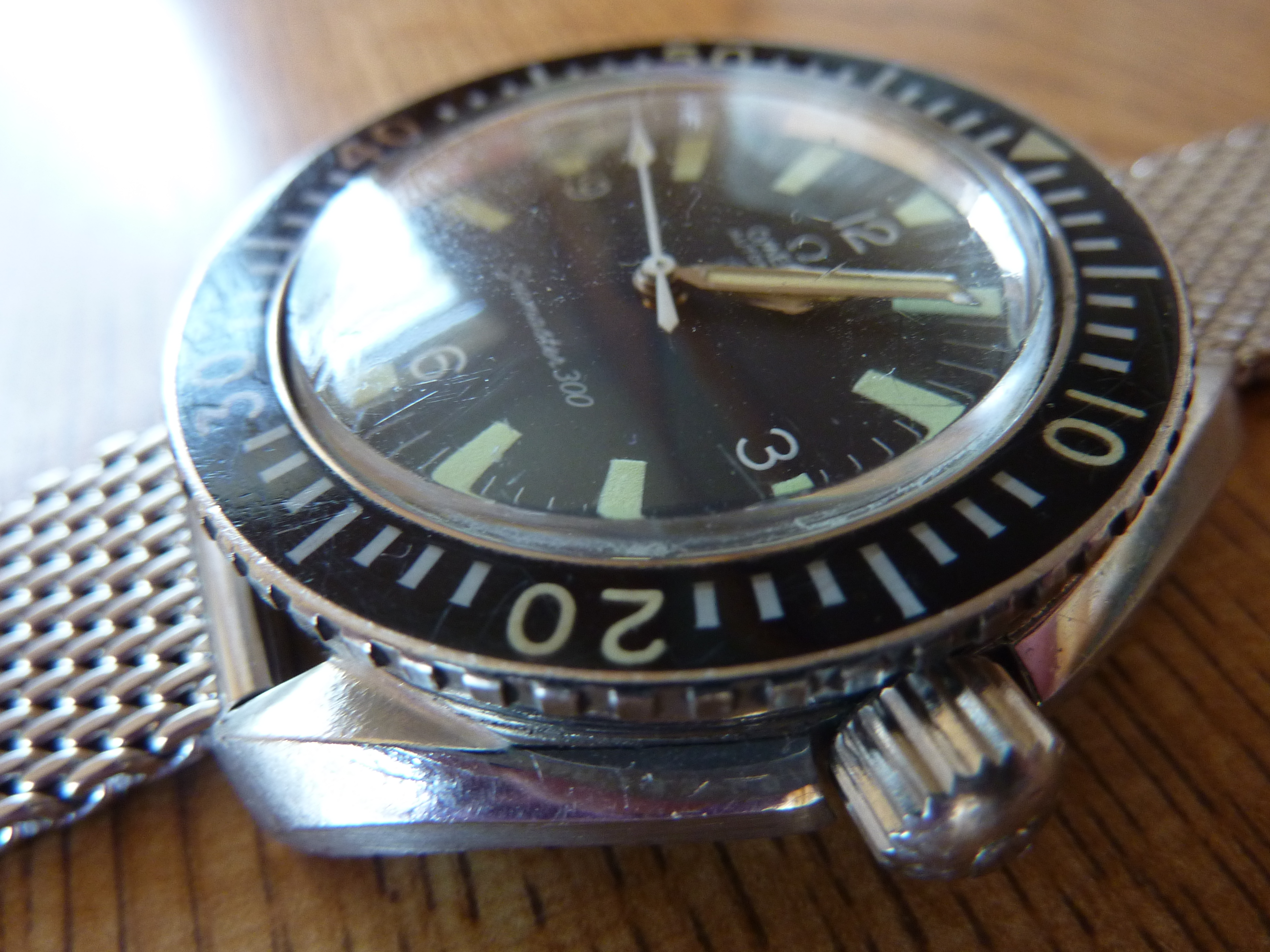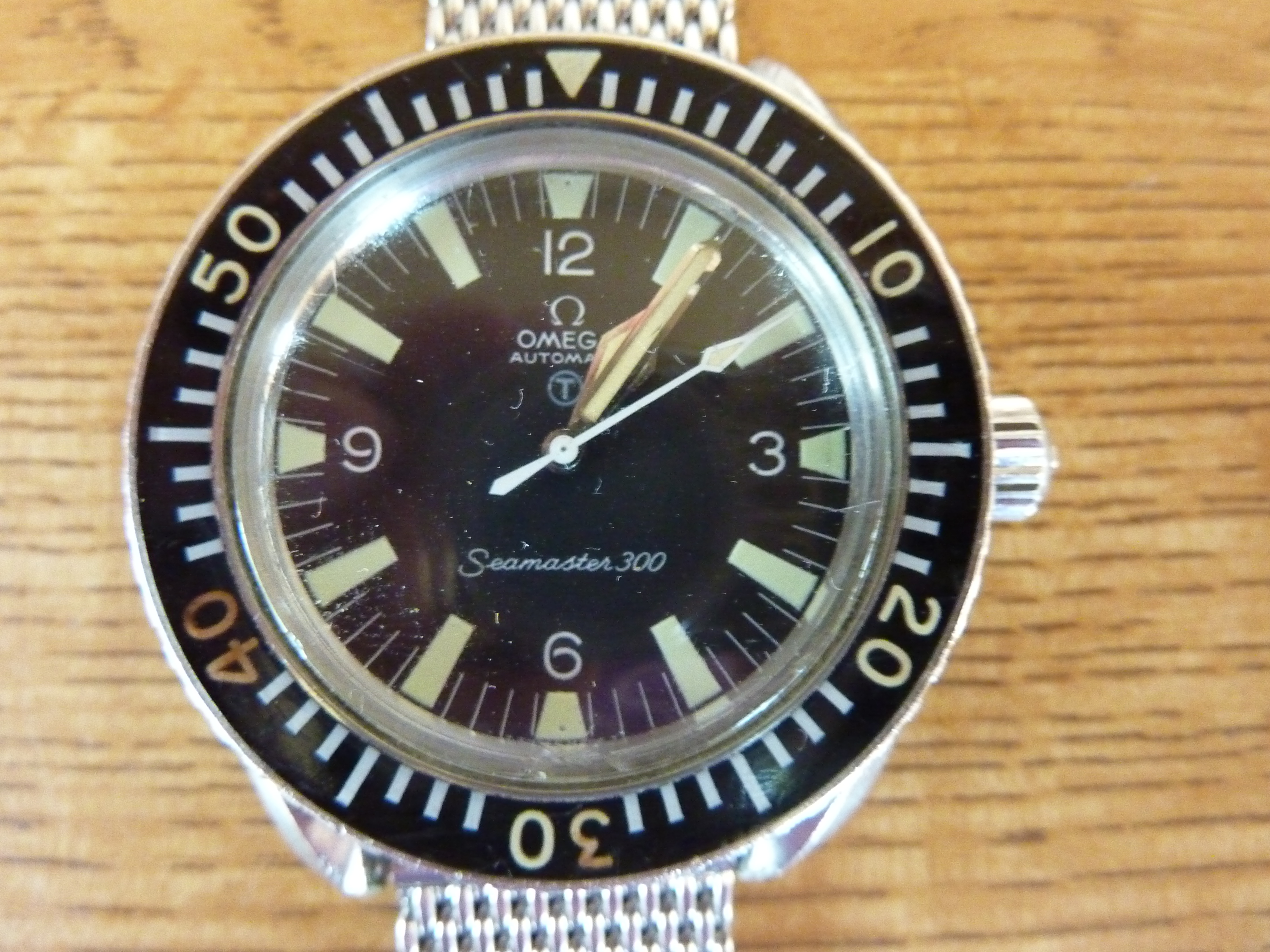 The watch is an Omega Seamaster 300 military watch. It has it's original dial with the small Omega sign engraved in the centre of the glass, the dial appears original with the T in a circle and the dots in the 12 and 6 markers. The crown is a screw down one, the lugs however are not fixed and I have a silver mesh strap on it.